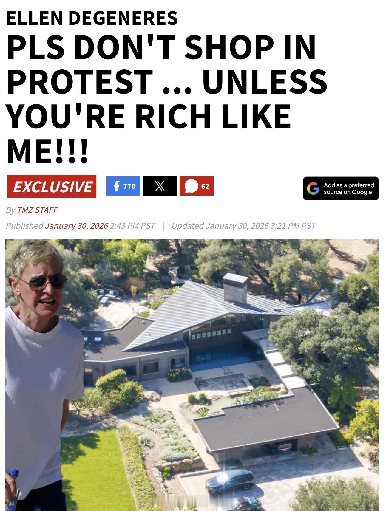就在“Ice Out”的1月30日当天,Ellen被拍到和妻子Portia de Rossi在加州Montecito看豪宅(一处价值3500万,一处1700万美元),又被骂“伪君子”:一边呼吁大家不购物,一边自己看房买房。