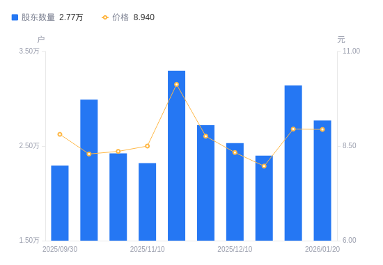 日期A股户数(户)流通A股户均持股数(股)户均持股市值(万元)2026-01-202770212128.3810.842026-01-093142310692.189.572025-12-192398414008.5211.162025-12-102531413272.5111.062025-11-282721312346.3210.822025-11-203296210192.9610.332025-11-102320714477.5412.312025-10-312423113865.7211.592025-10-102991411231.549.312025-09-302293214651.1612.91