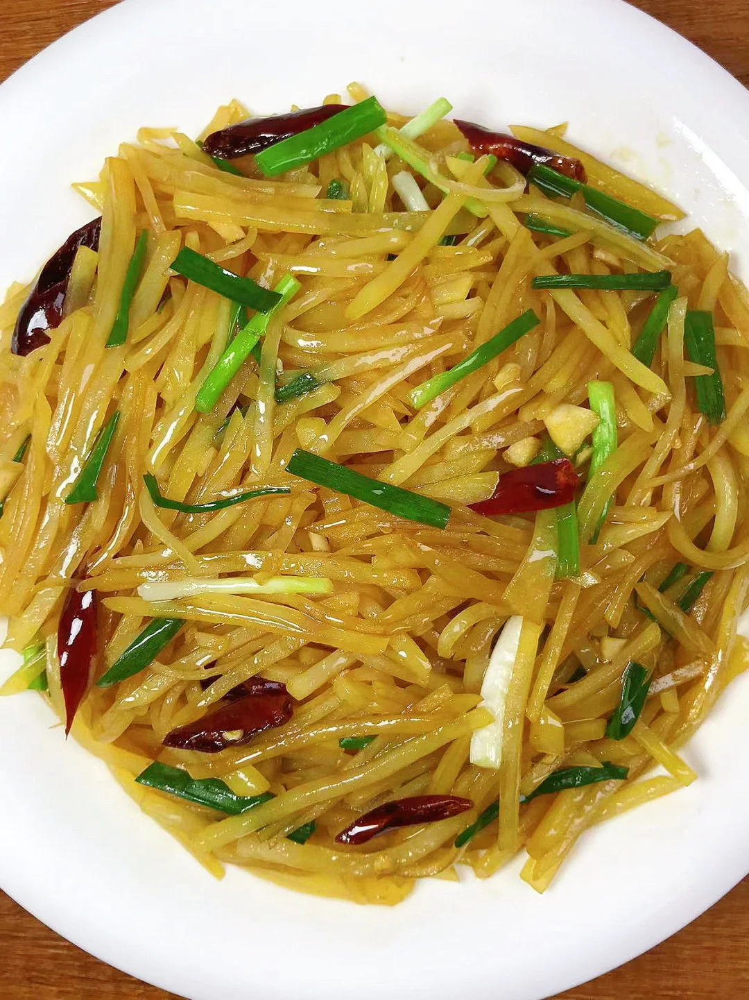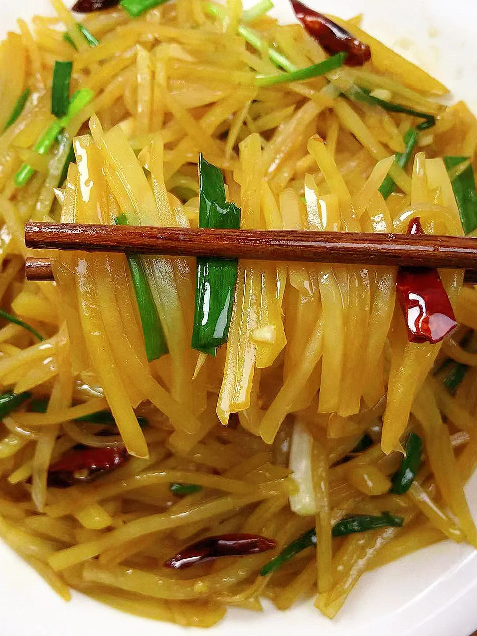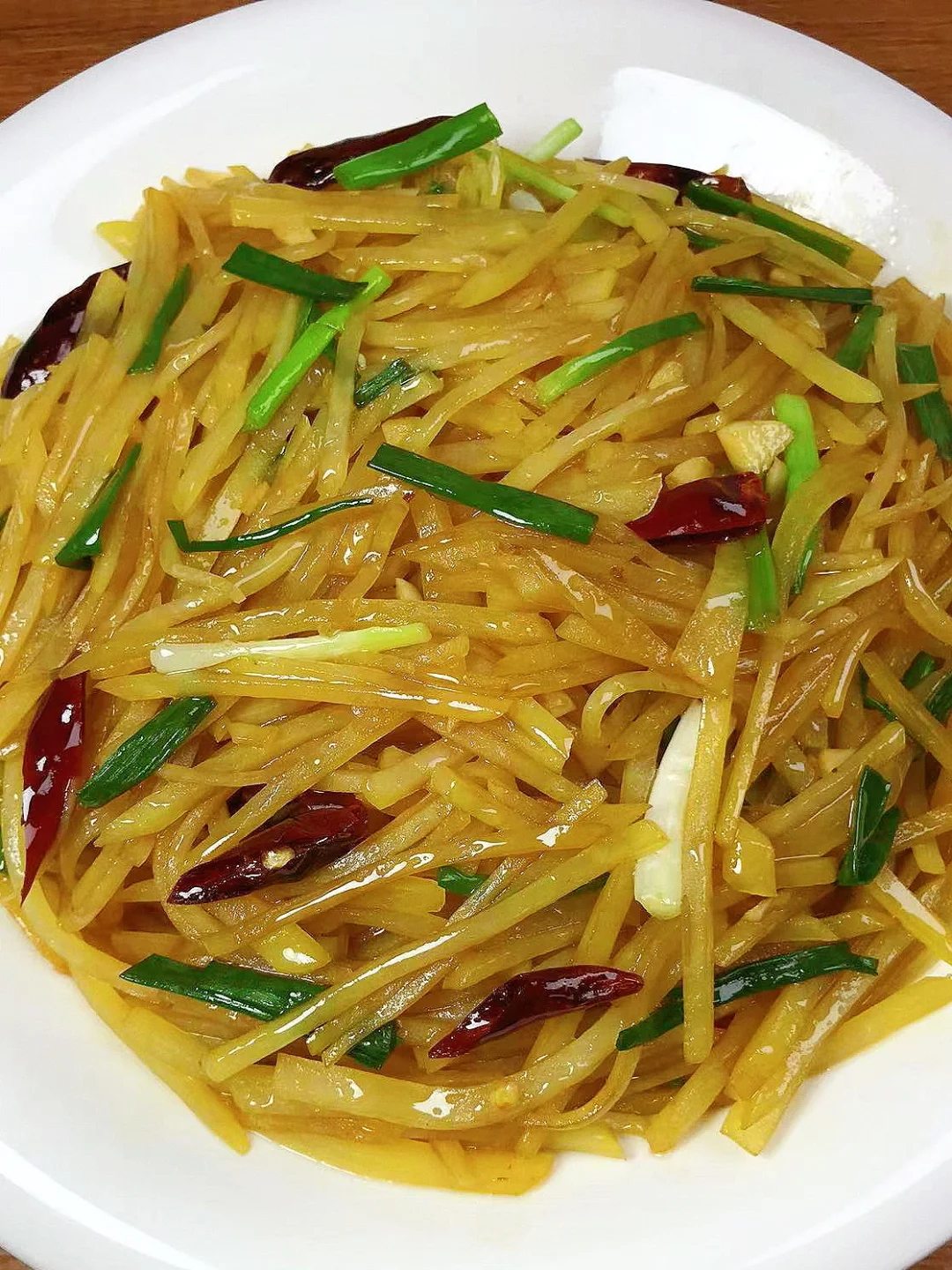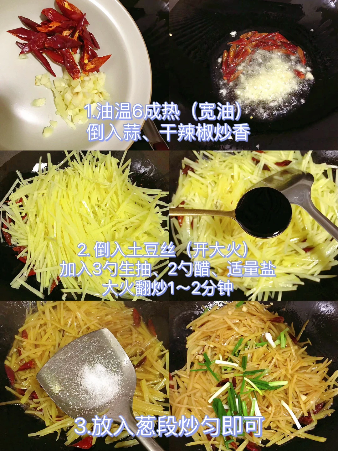 [赞R]今天分享一款酸辣土豆丝!酸辣开胃,口感爽脆!喜欢的赶紧试试吧! [赞R]食材:土豆、干辣椒、蒜、葱段 [赞R]做法: 1.土豆削皮洗净切丝泡去多余淀粉沥干备用;葱段、干辣椒、蒜切好备用 2.油温6成热(宽油),倒入蒜、干辣椒炒香,倒入土豆丝(开大火),加入3勺生抽、2勺醋、适量盐大火翻炒1~2分钟 3.最后放入葱段炒匀即可