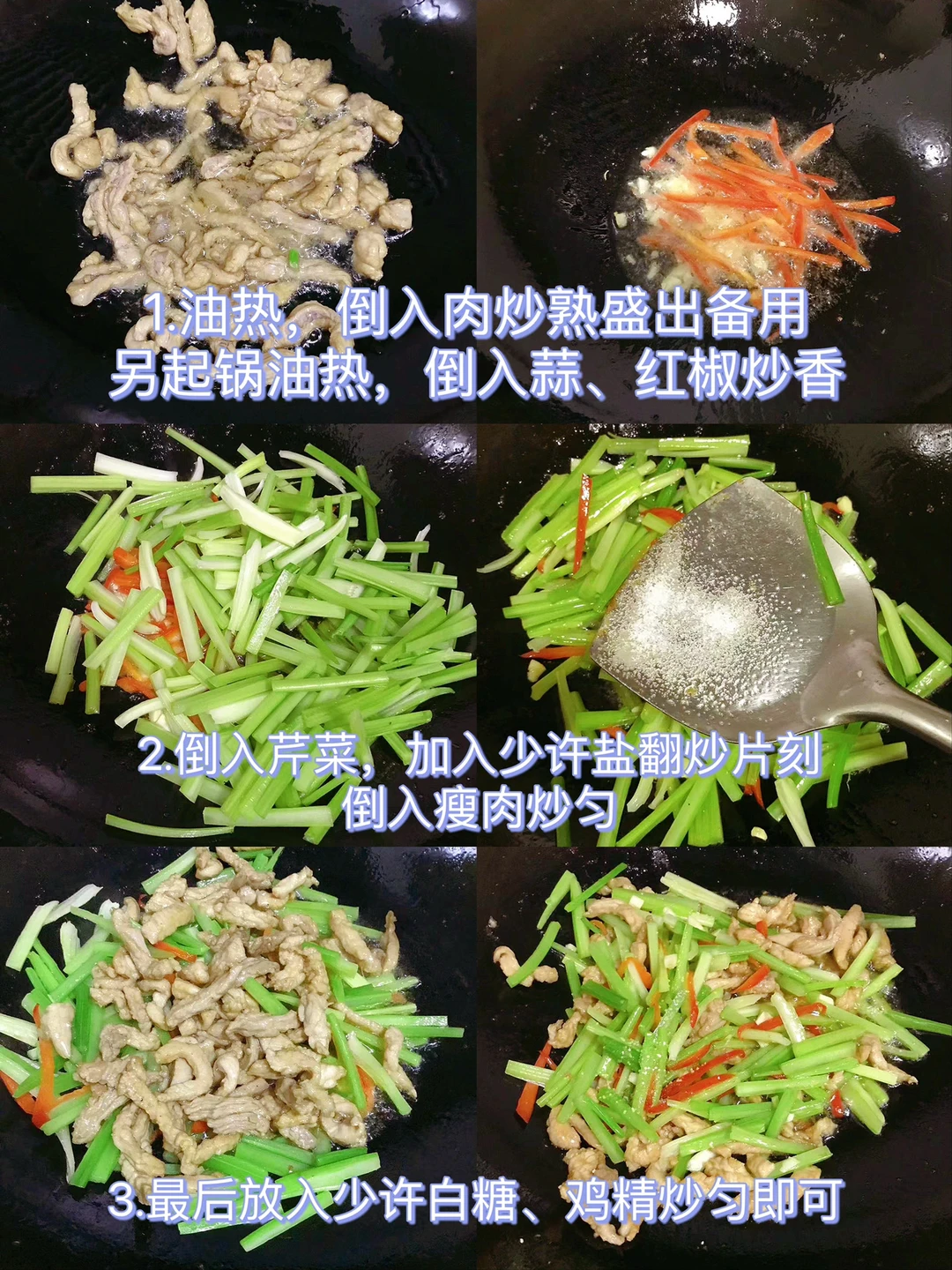 🌻今天分享一款芹菜炒肉丝!非常好吃又下饭!喜欢的赶紧试试吧! 🌻食材:瘦肉、芹菜、红椒(可不放)、蒜 🌻做法: 1.瘦肉切丝,加入葱姜、胡椒粉、盐、生抽拌匀腌制15分钟,夹出葱姜,倒入水淀粉拌匀;芹菜、蒜切好备用 2.油热,倒入肉炒熟盛出备用;另起锅油热,倒入蒜、红椒炒香,倒入芹菜,加入少许盐翻炒片刻,倒入瘦肉炒匀 3.最后放入少许白糖、鸡精炒匀即可