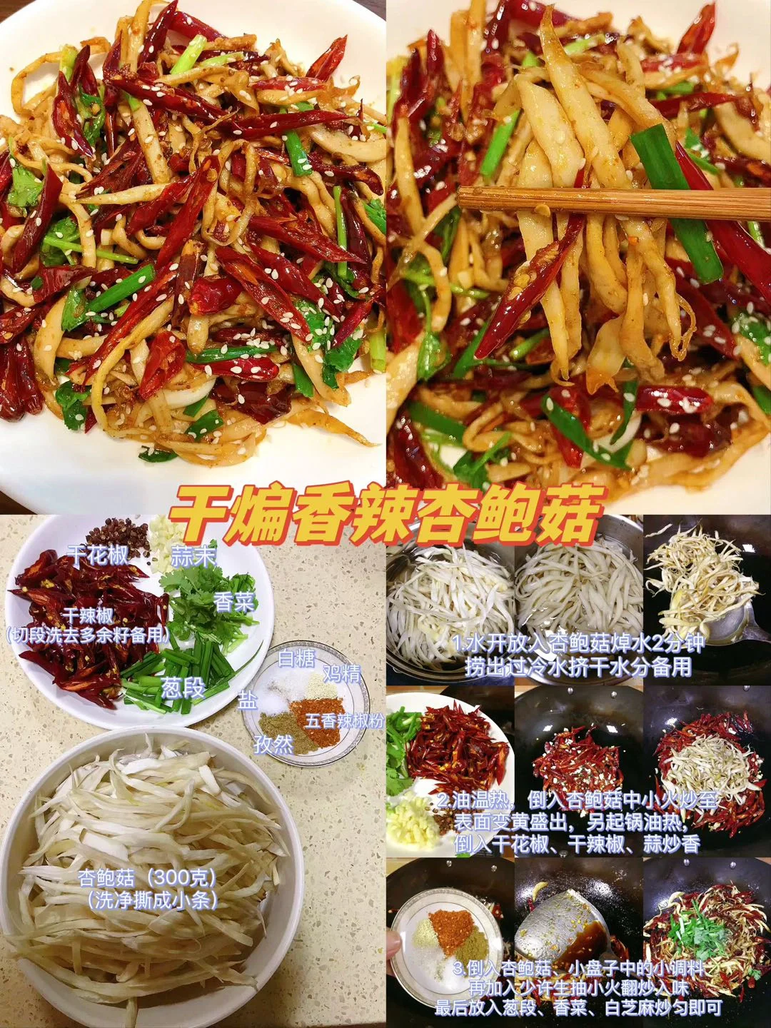 [赞R]今天给大家整理了九款超级好吃的家常菜合集!每天不知道吃什么的小伙伴可以参考一下这个食谱哦!每天不重样! [赞R]每一款都有详细的教程哦!翻看图片就能看见! 1.干煸香辣杏鲍菇 2.炝拌毛肚贡菜 3.黄金玉米饼 4.干煸长豆角 5.南瓜汤 6.孜然锅巴土豆 7.香辣孜然章鱼须 8.凉拌花生米 9.豇豆角炒肉