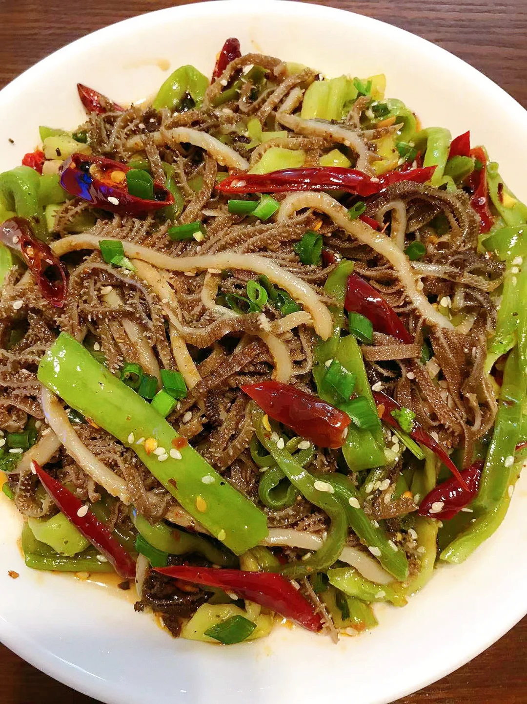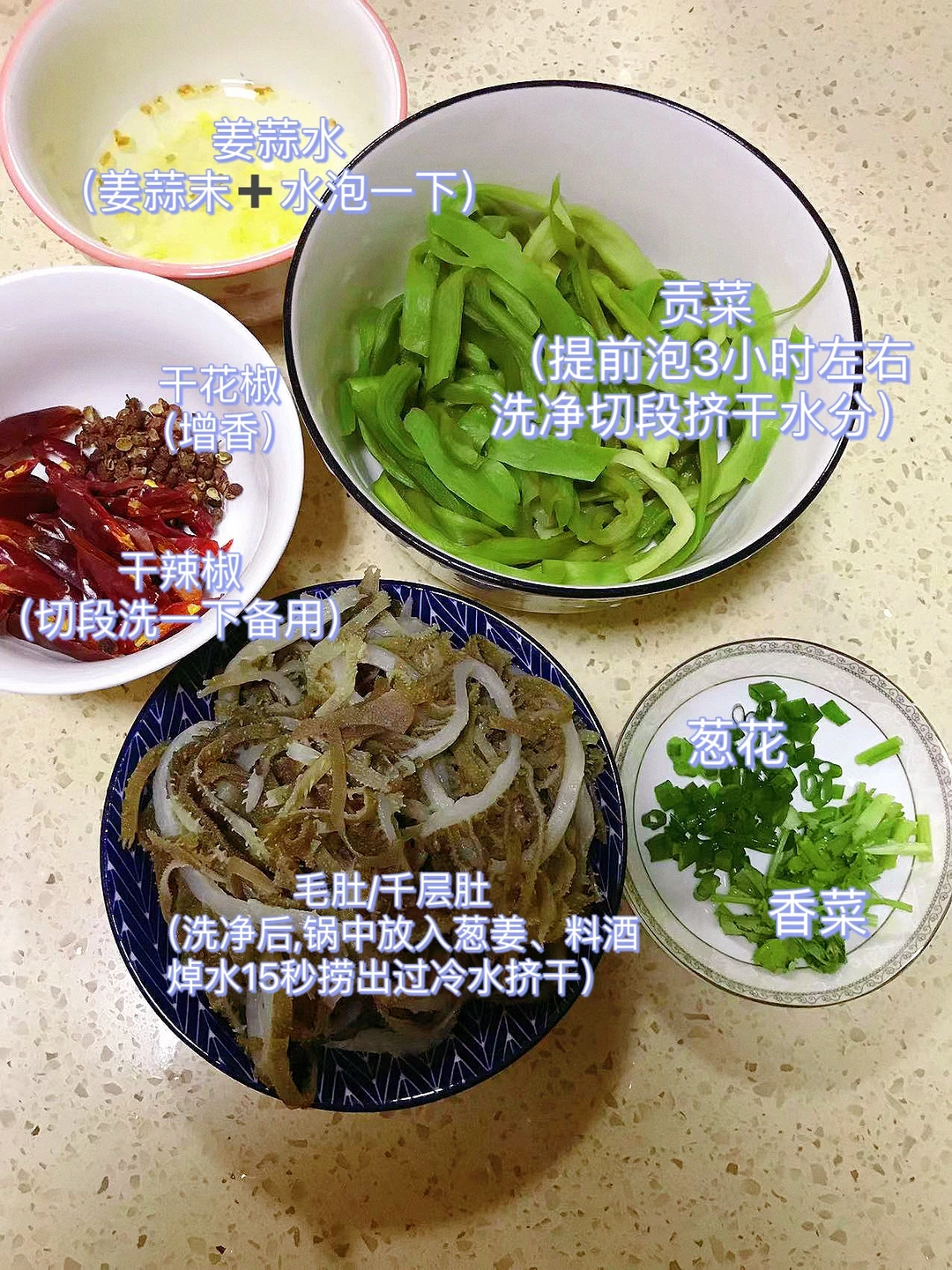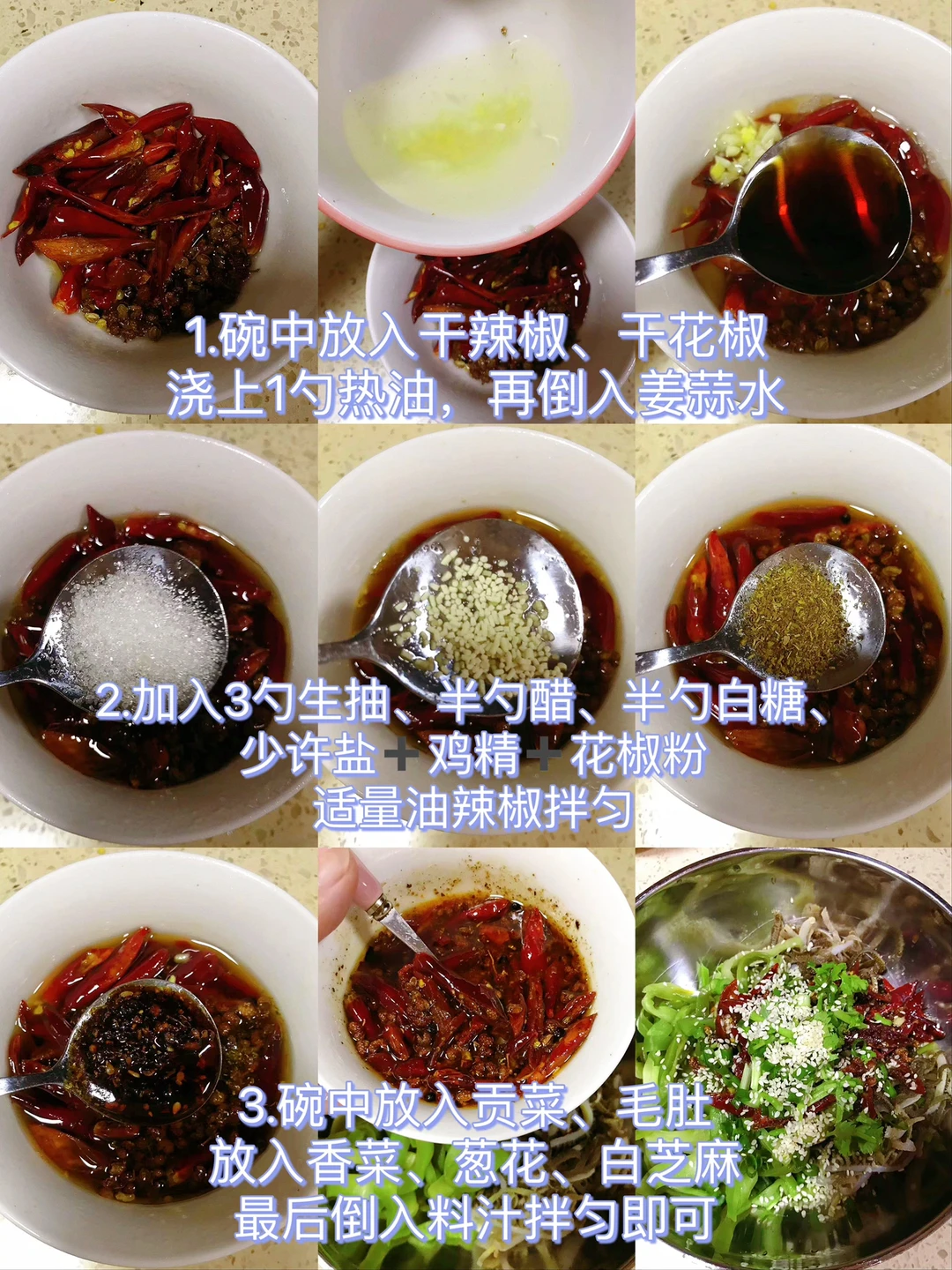 [赞R]今天分享一款炝拌毛肚贡菜!嘎嘣脆,简直就是下饭神器!喜欢的赶紧试试吧! [赞R]食材:贡菜、毛肚、干花椒、干辣椒、葱花、香菜、姜蒜水 [赞R]做法: 1.贡菜提前泡3小时左右洗净切段挤干水分;毛肚/千层肚洗净后,锅中放入葱姜、料酒水开焯水15秒捞出过冷水挤干水分 2.碗中放入干辣椒、干花椒浇上1勺热油,再倒入姜蒜水,加入3勺生抽、半勺醋、半勺白糖、少许盐、鸡精、花椒粉、适量 油辣椒拌匀 3.碗中放入贡菜、毛肚、香菜、葱花、白芝麻,最后倒入料汁拌匀即可
