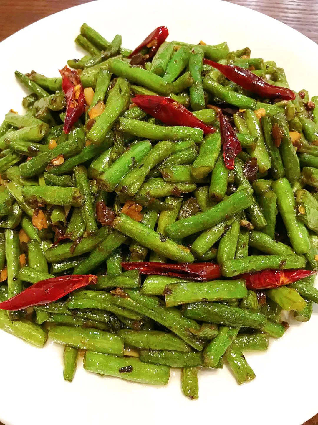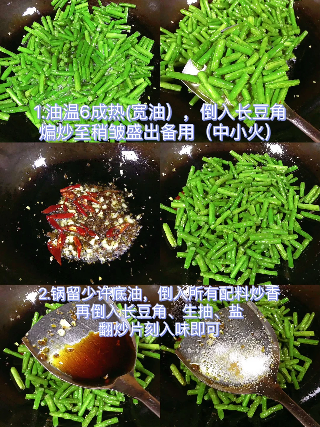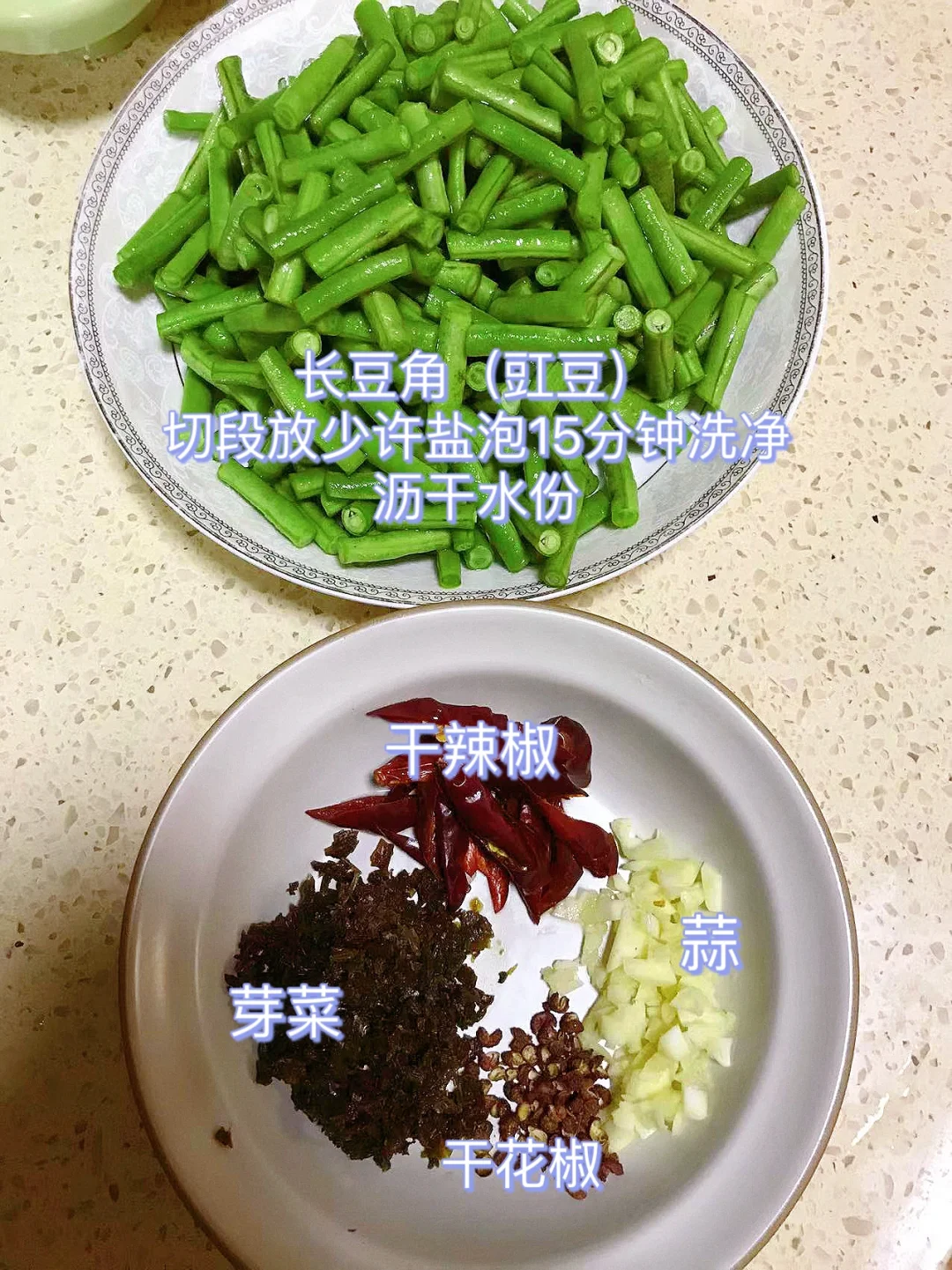 [赞R]今天分享一款干煸长豆角!香辣下饭!真的好吃到停不下来!喜欢的赶紧试试吧! [赞R]食材:长豆角、干辣椒、干花椒;芽菜、蒜 [赞R]做法: 1.长豆角(豇豆),切段放少许盐泡15分钟洗净,沥干水分 2.油温6成热(宽油),倒入长豆角煸炒至稍皱盛出备用(中小火) 3.锅留少许底油,倒入所有配料炒香,再倒入长豆角、生抽、盐翻炒片刻入味即可