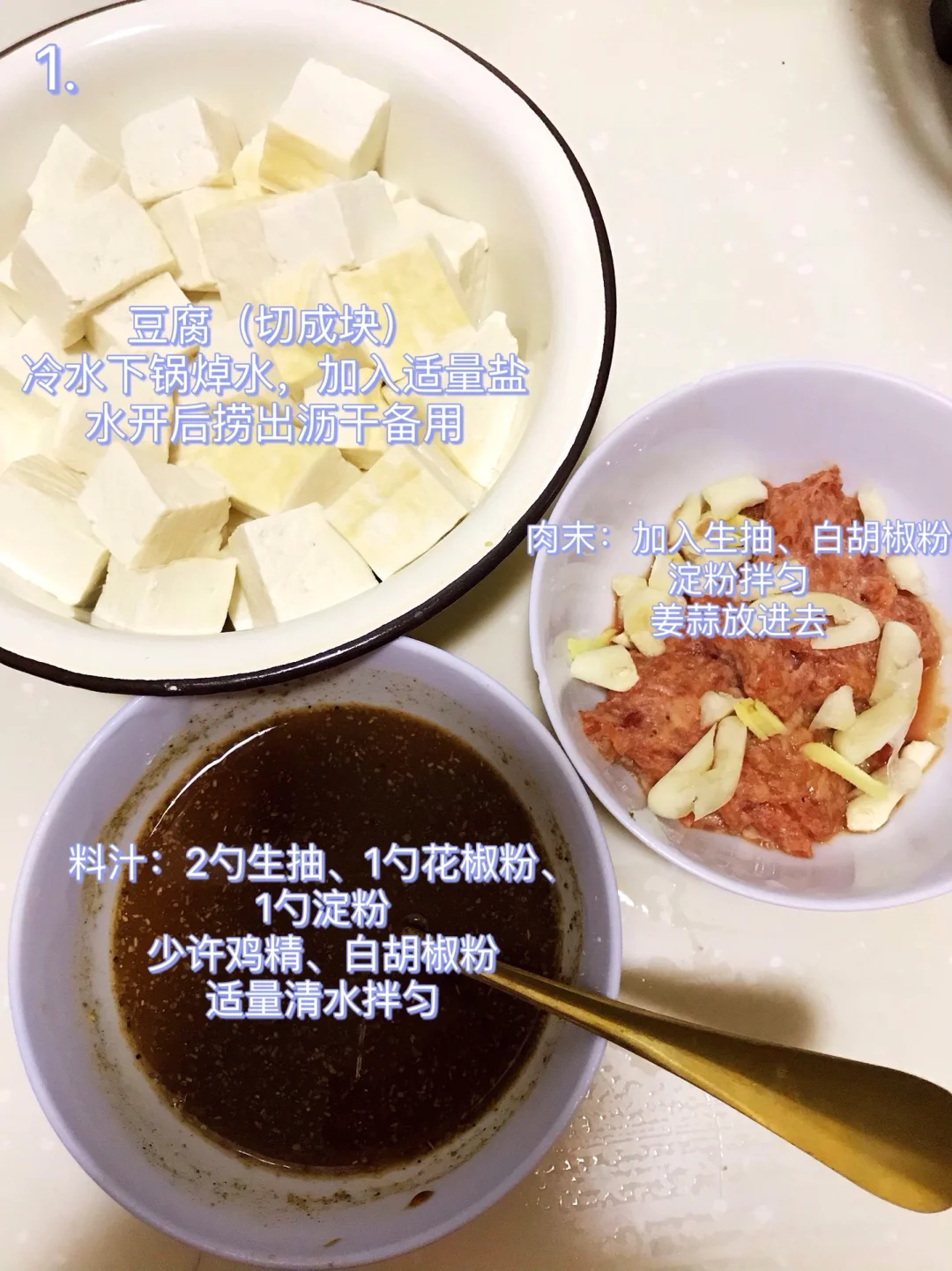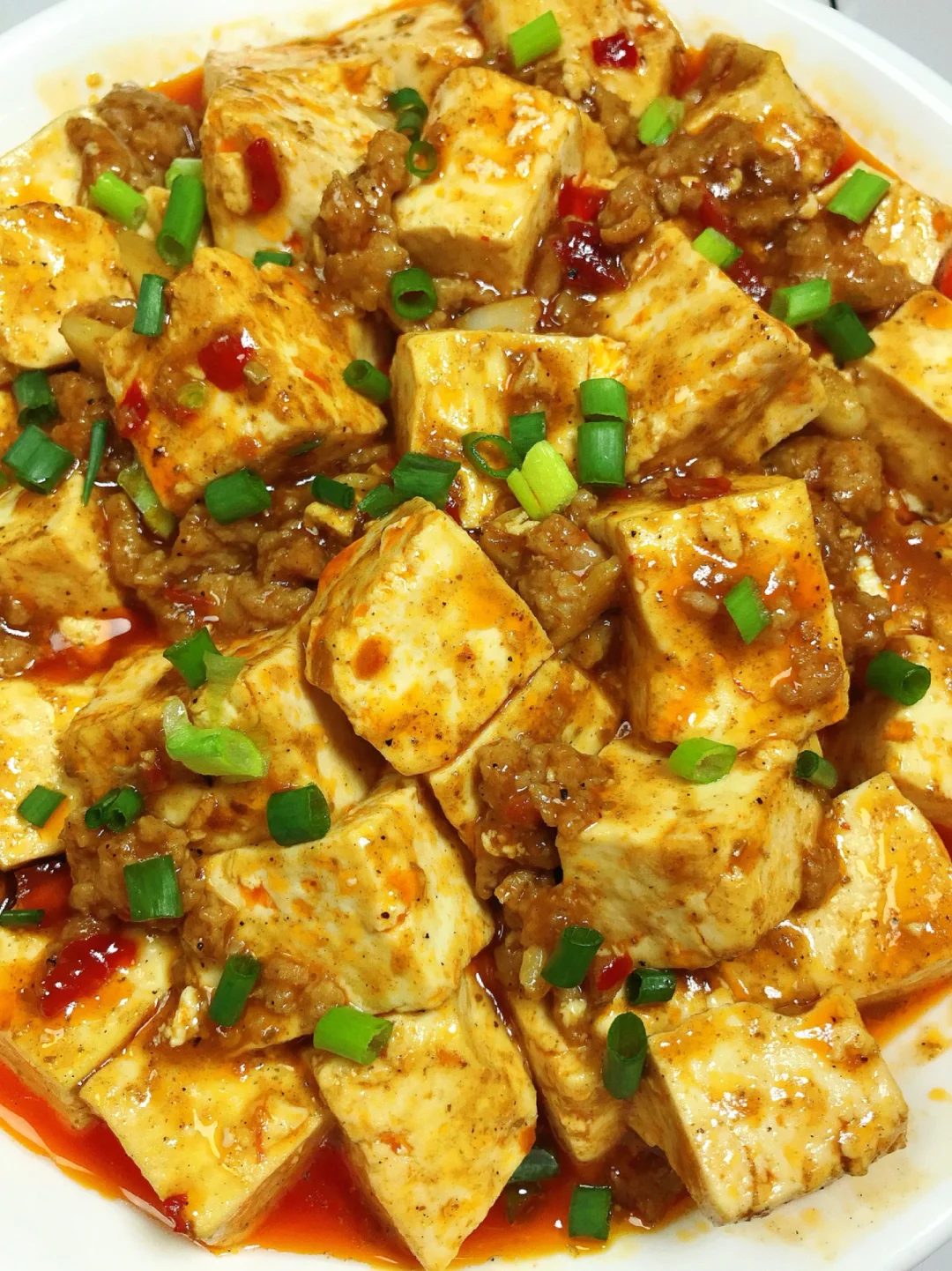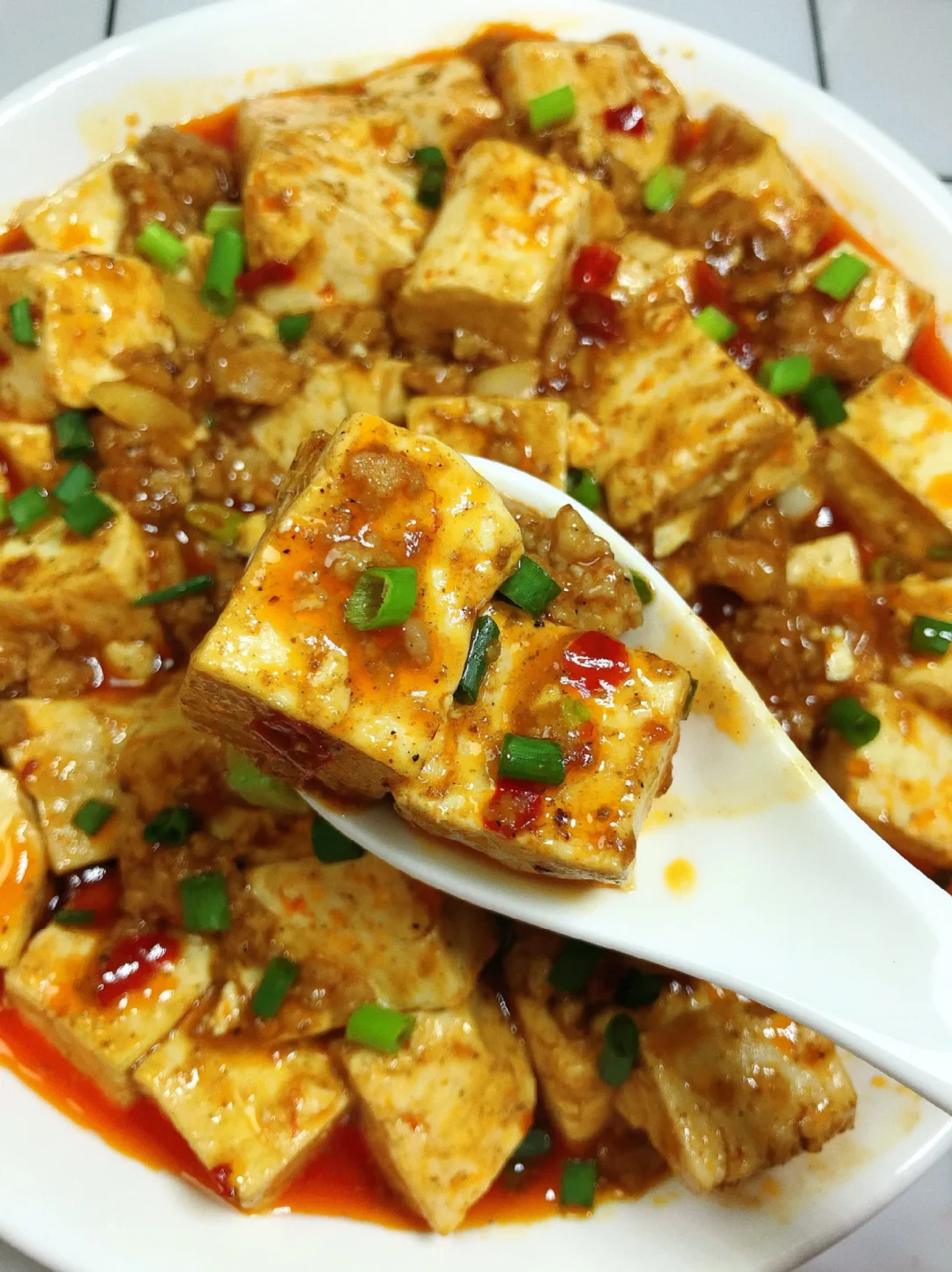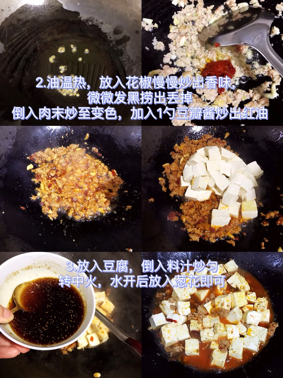 [赞R]今天分享一款麻婆豆腐!麻辣鲜香,简单好吃!喜欢的朋友一定要试试哦! [赞R]食材:豆腐、肉末、姜蒜 [赞R]做法: 1⃣️豆腐切成块,冷水下锅焯水,加入适量清盐,水开后捞出沥干备用; 调料汁:2勺生抽、1勺花椒粉、1勺淀粉、少许鸡精、白胡椒粉、适量清水拌匀 肉末:加入生抽、白胡椒粉、淀粉拌匀,姜蒜放进去 2⃣️油温热,放入花椒慢慢炒出香味,微微发黑捞出丢掉,倒入肉末炒至变色,加入1勺豆瓣酱炒出红油 3⃣️放入豆腐,倒入料汁炒匀,转中火,水开后放入葱花即可