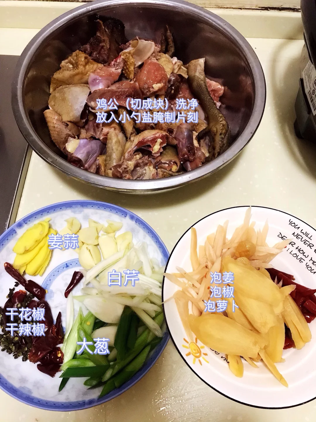 [赞R]食材:鸡公(1只)、泡椒、泡椒、泡萝卜、白芹、大葱、干花椒、干辣椒、啤酒、姜蒜
