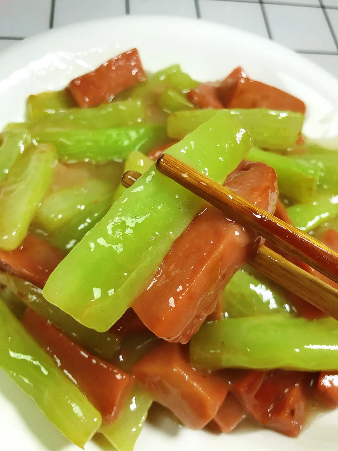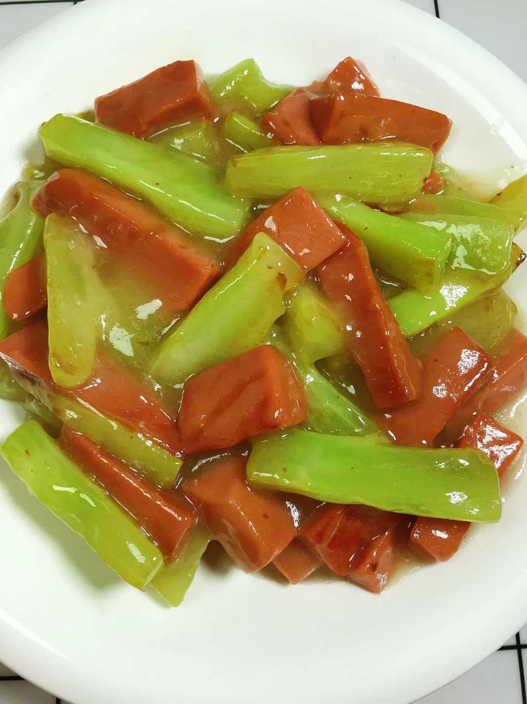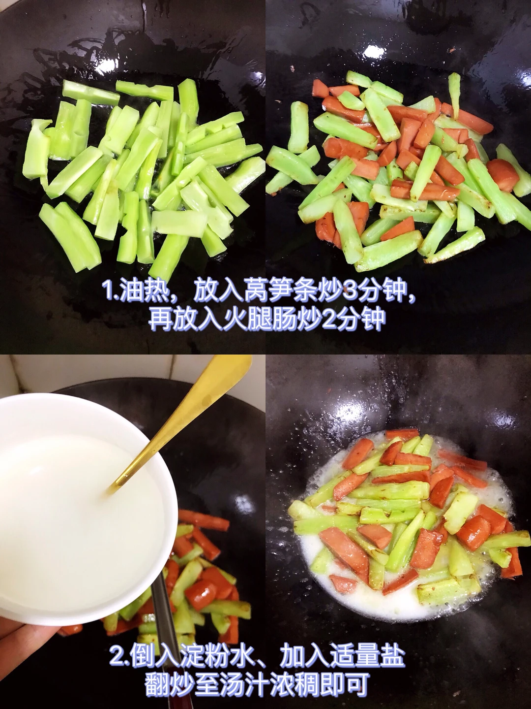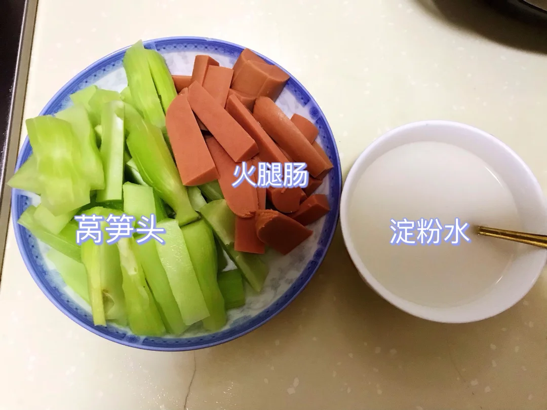 [赞R]今天分享一款莴笋头炒火腿!太鲜了,清新解腻!超级简单!喜欢的赶紧试试吧! [赞R]食材:莴笋头、火腿肠、淀粉水 [赞R]做法: 1⃣️莴笋头削皮切成条、火腿肠切成条备用;油热,放入莴笋条炒3分钟,再放入火腿肠炒2分钟 2⃣️倒入淀粉水、加入适量盐翻炒至汤汁浓稠即可