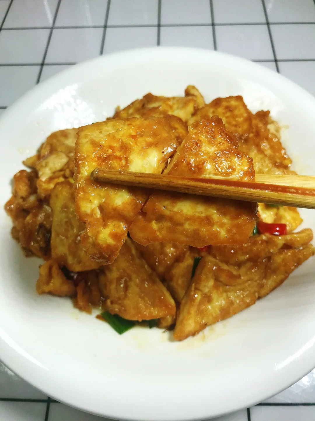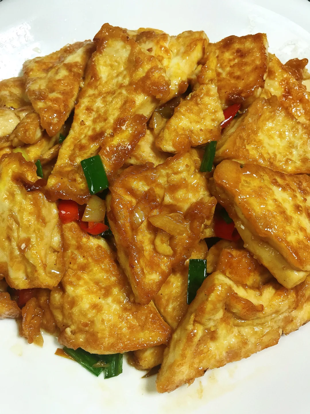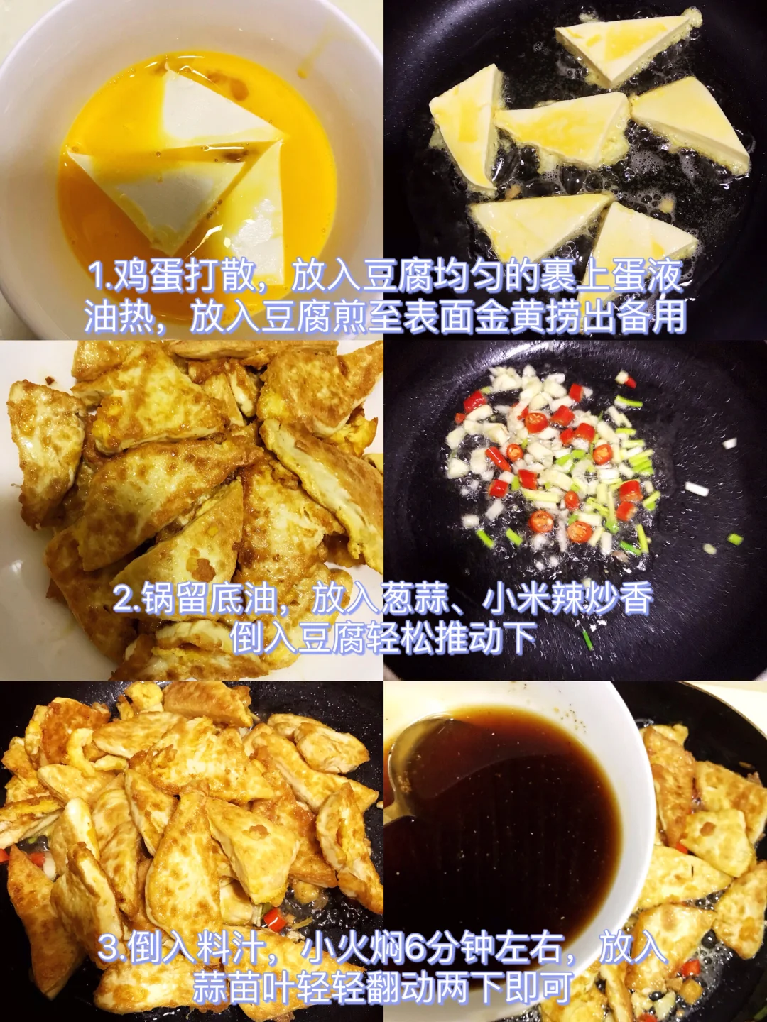 [赞R]今天分享一款焖煎豆腐!质地鲜嫩,非常好吃😋!赶紧试试吧! [赞R]食材:嫩豆腐、小米辣、蒜苗叶、葱蒜 [赞R]做法: 1⃣️嫩豆腐切成三角形小块;调料汁:1勺生抽、2勺蚝油、少许白糖+胡椒粉、半碗清水拌匀 2⃣️鸡蛋打散,放入豆腐均匀的裹上蛋液;油热放入豆腐煎至表面金黄捞出备用 3⃣️锅留底油,放入葱蒜、小米辣炒香,倒入豆腐轻松推动下;倒入料汁,小火焖6分钟左右,放入蒜苗叶轻松翻动两下即可