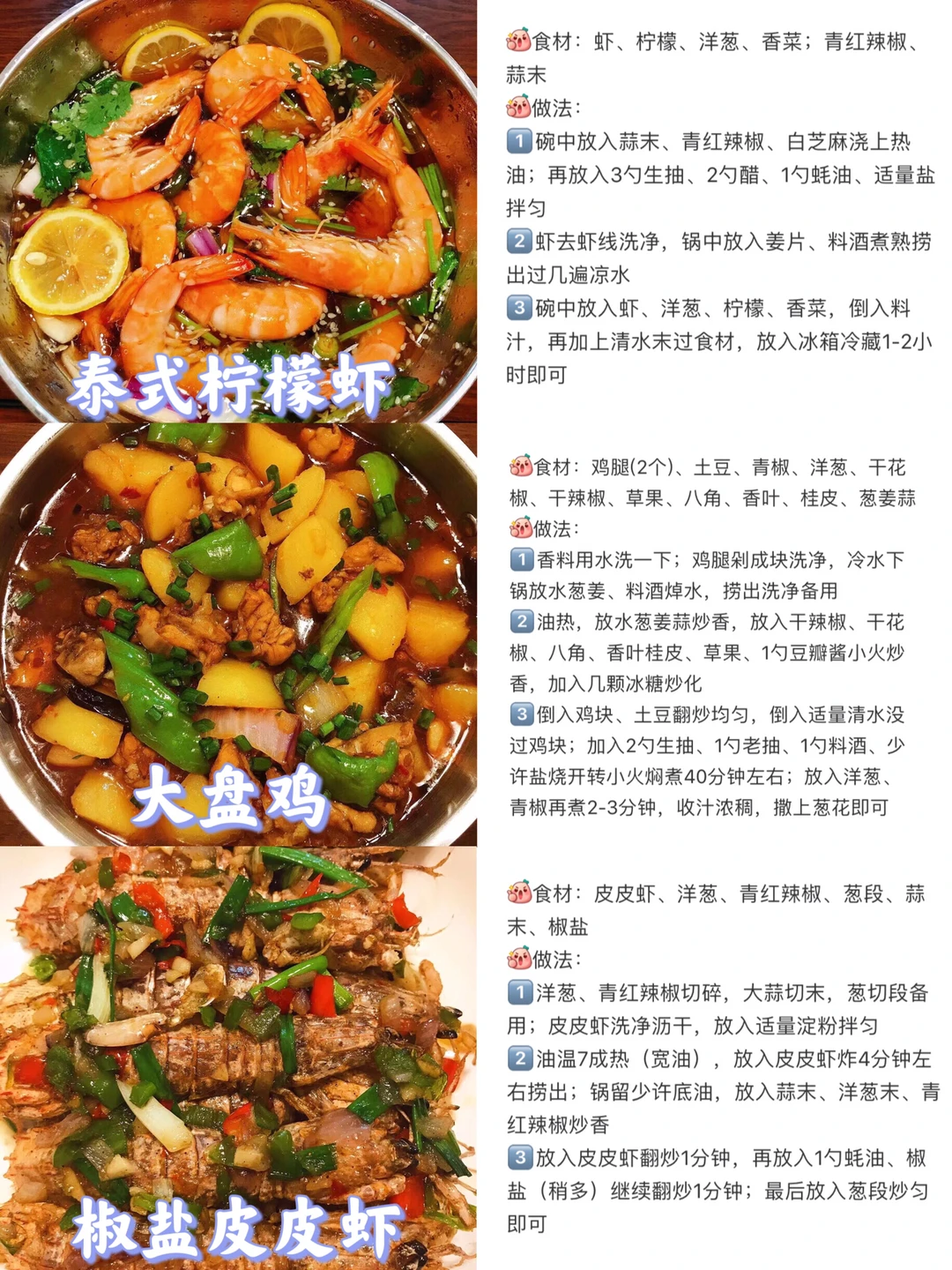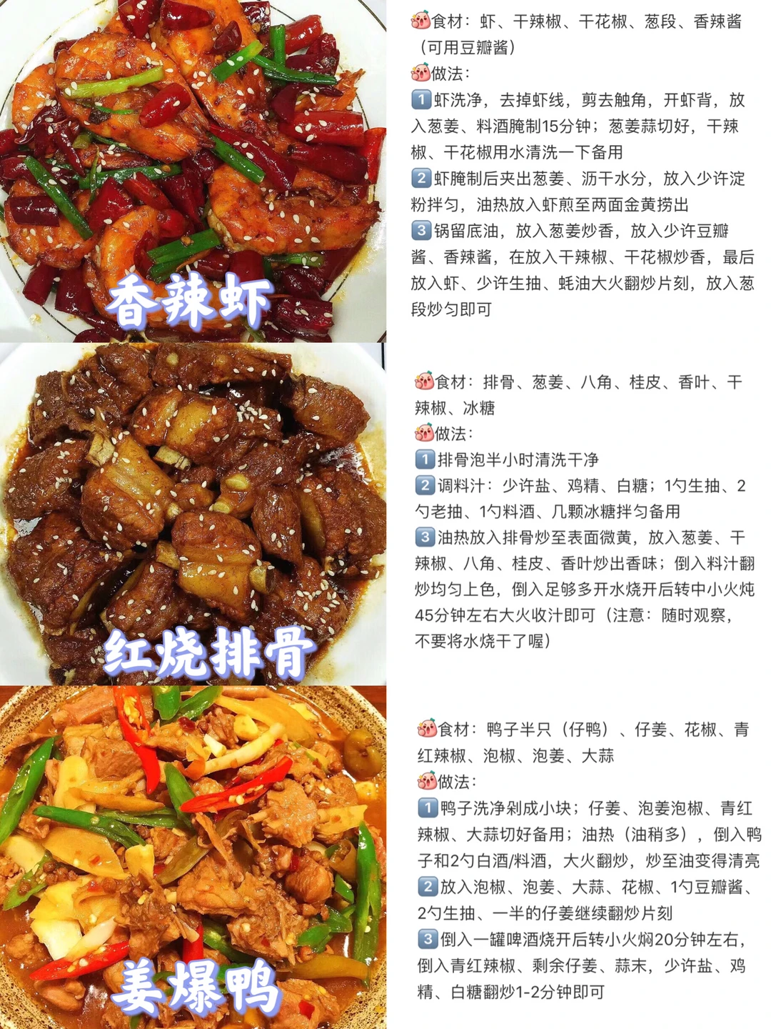 [赞R]今天给大家整理了六款超级好吃的家常菜合集!每天不知道吃什么的小伙伴可以参考一下这个食谱哦!每天不重样! [赞R]每一款都有详细的教程哦!翻看图片就能看见! 1⃣️香辣虾 2⃣️红烧排骨 3⃣️姜爆鸭 4⃣️泰式柠檬虾 5⃣️大盘鸡 6⃣️椒盐皮皮虾