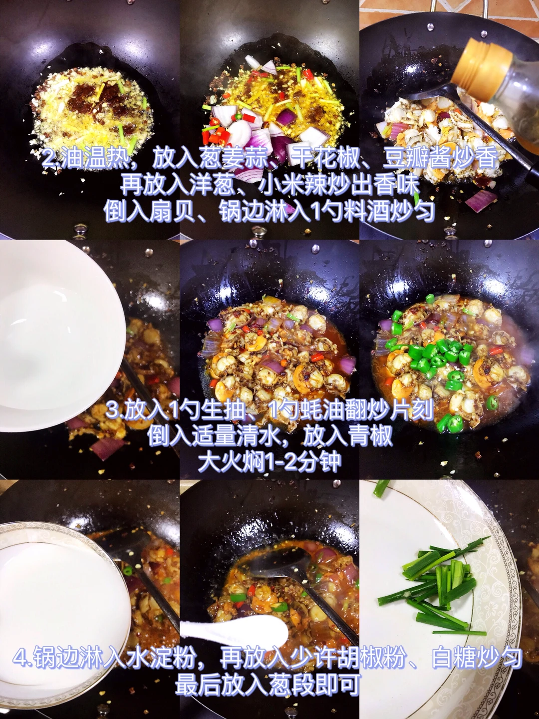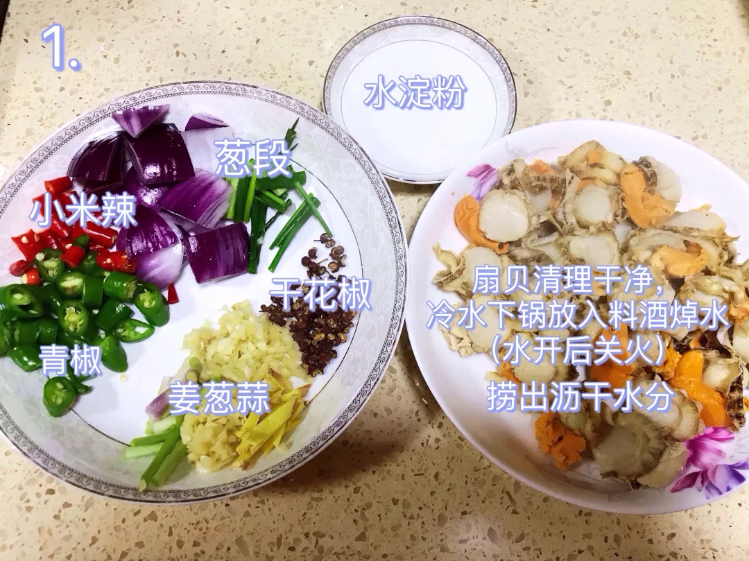 [赞R]食材:扇贝肉、葱姜蒜、干花椒、青椒、小米辣、洋葱、葱段、淀粉