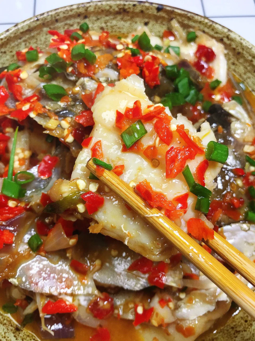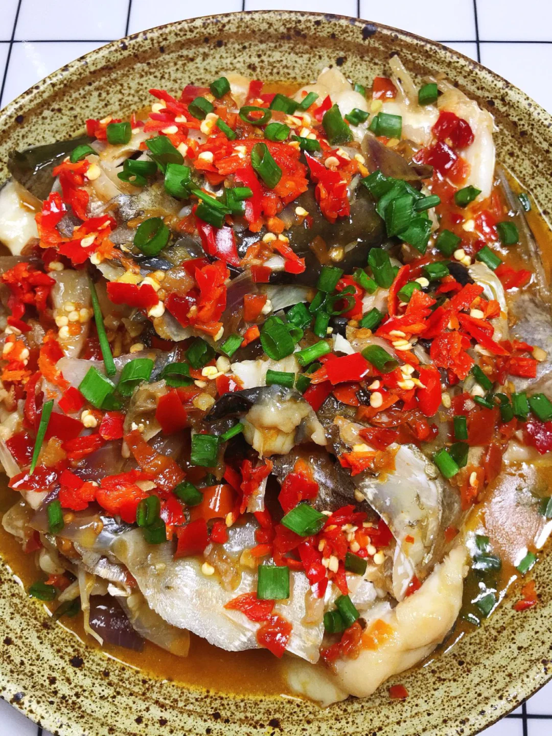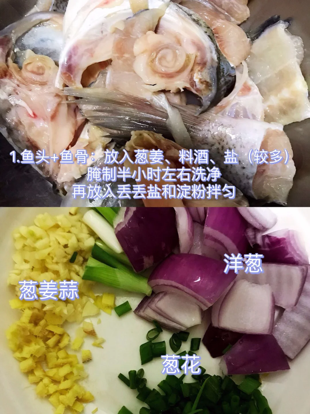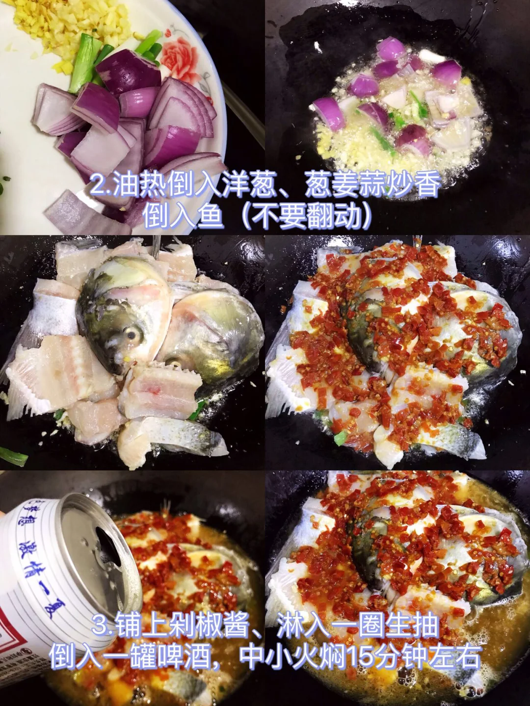 [赞R]今天分享一款剁椒焖鱼!好吃下饭😋!做法简单!喜欢的吃辣的一定要试试! [赞R]食材:鱼头+鱼骨、葱姜蒜、洋葱、剁椒酱、啤酒 [赞R]做法: 1⃣️鱼头+鱼骨:放入葱姜、料酒、盐(较多)腌制半小时左右洗净,再放入丢丢盐和淀粉拌匀;葱姜蒜、洋葱切好备用 2⃣️油热倒入洋葱、葱姜蒜炒香,倒入鱼(不要翻动) 3⃣️铺上剁椒酱、淋入一圈生抽、倒入一罐啤酒,中小火焖15分钟左右,起锅撒上葱花即可