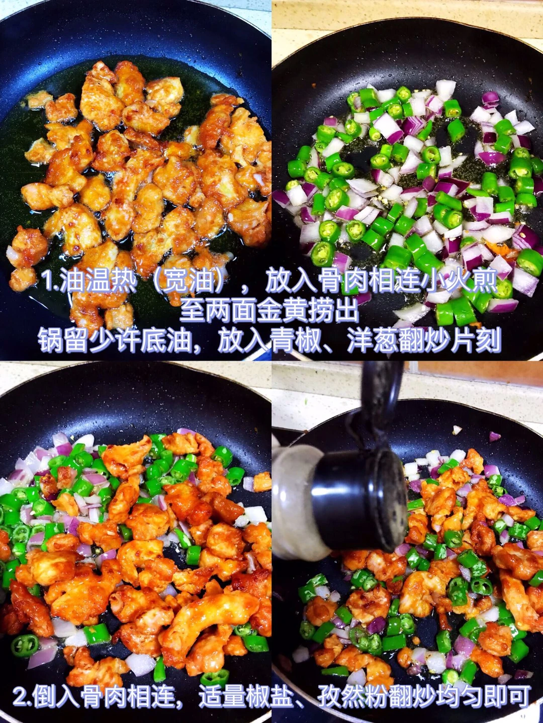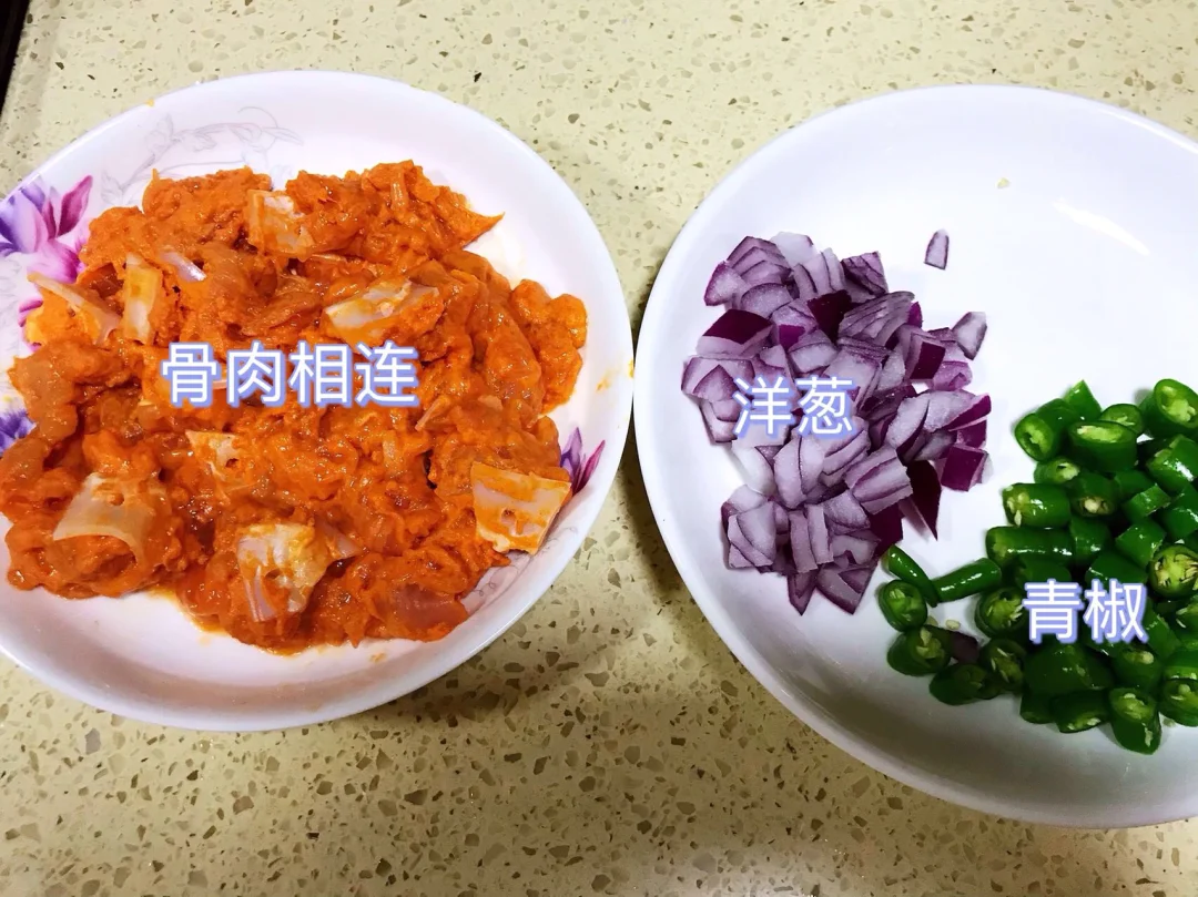 [赞R]今天分享一款青椒炒骨肉相连!好吃下饭!喜欢的赶紧试试吧! [赞R]食材:骨肉相连、青椒、洋葱 [赞R]做法: 1⃣️油温热(宽油),放入骨肉相连小火煎至两面金黄捞出;锅留少许底油,放入青椒、洋葱翻炒片刻 2⃣️倒入骨肉相连,适量盐、孜然粉翻炒均匀即可