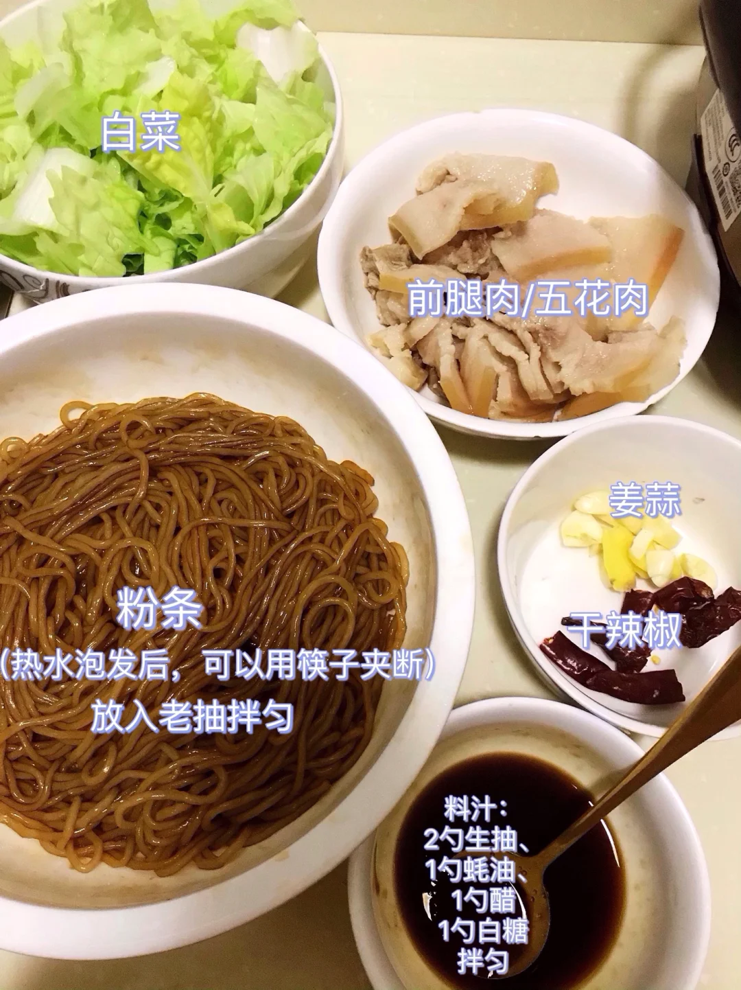 1⃣️姜蒜、干辣椒切好备用;白菜洗净切段;前腿肉洗净煮熟后切成薄片备用;粉条用热水泡发后,用筷子可以夹断,再放入老抽拌匀;调料汁:2勺生抽、1勺蚝油、1勺醋、1勺糖拌匀