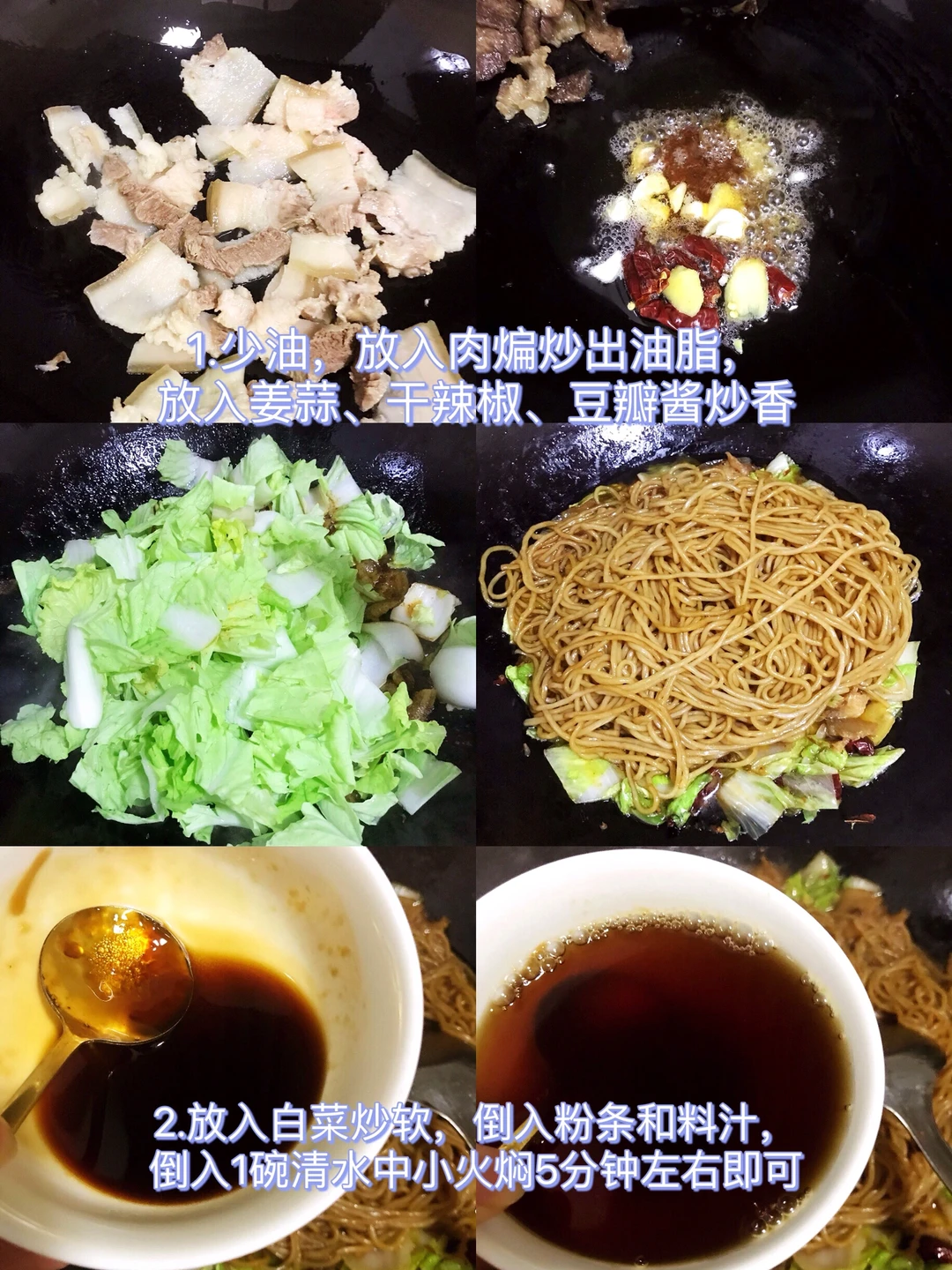 3⃣️放入白菜炒软,倒入粉条和料汁,倒入1大碗清水中小火煮5分钟左右即可