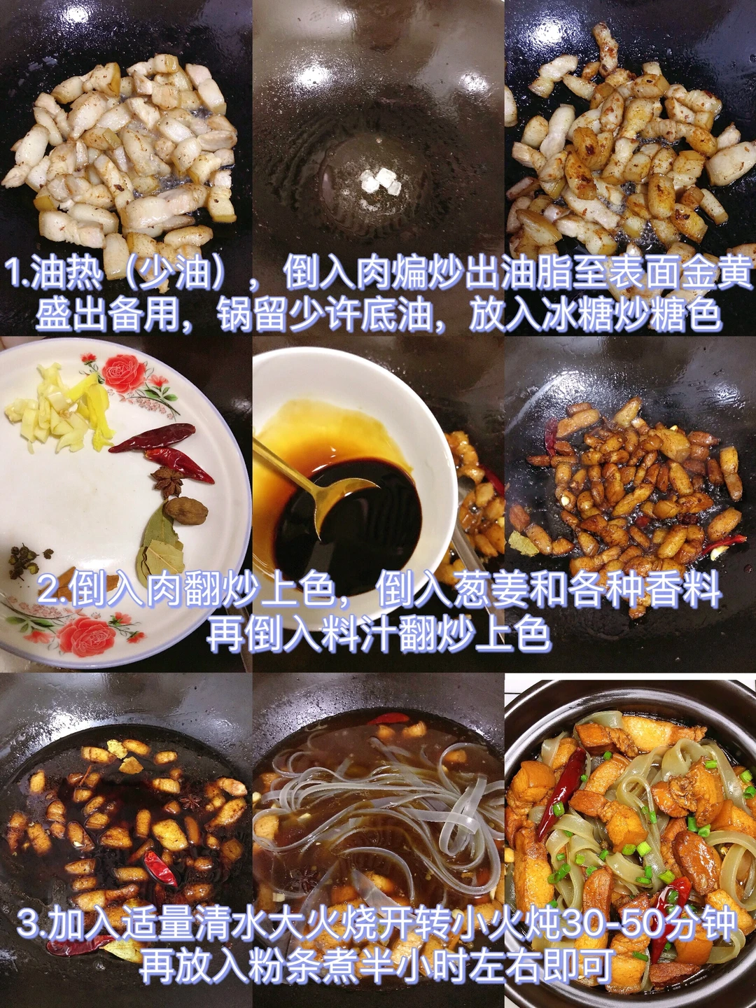 3⃣️倒入肉翻炒上色,倒入姜蒜、和各种香料,再倒入料汁翻炒上色,加入适量清水大火烧开转小火炖30-50分钟,再放入粉条煮半小时左右即可