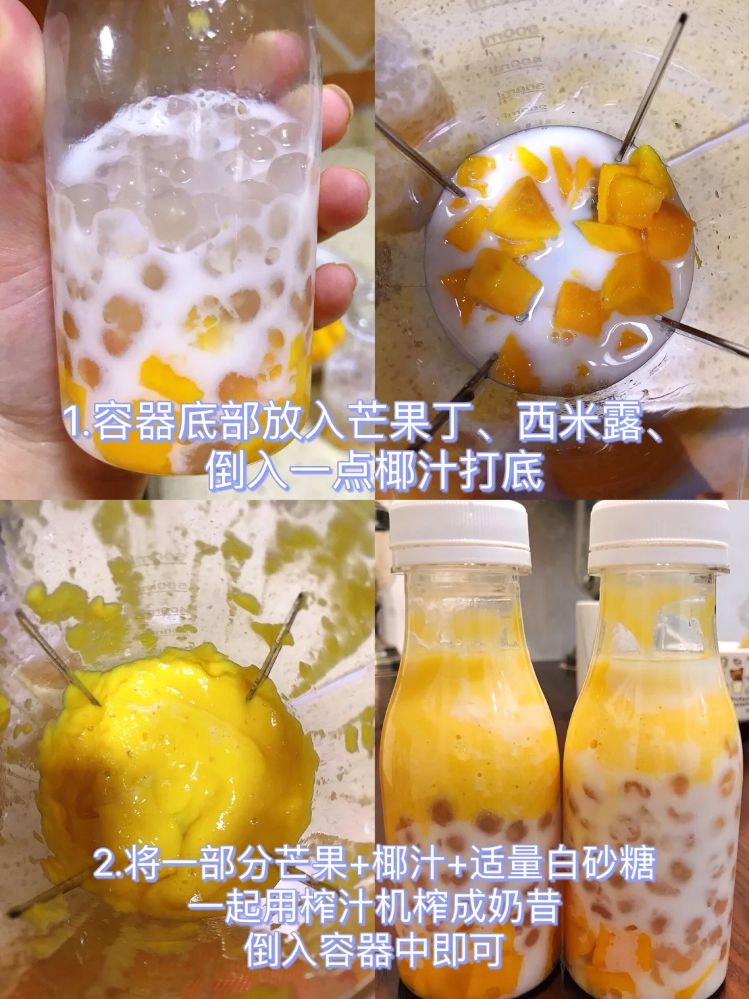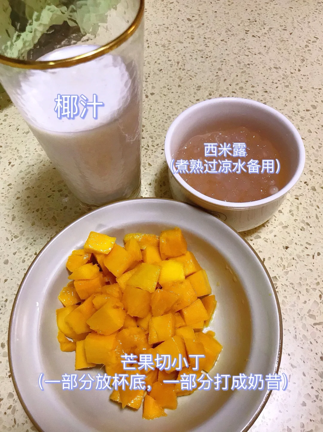 [赞R]今天分享一款芒果西米露!西米Q弹爽滑,芒果香甜浓郁!搭配椰汁真的太好喝了!喜欢的赶紧试试吧! [赞R]食材:芒果、西米、椰汁 [赞R]做法: 1.西米煮熟过凉水备用(水开倒入多搅拌煮15分钟,关火焖5分钟到没有白点,冷水中浸泡一会儿) 芒果去皮切成小丁(一部分放杯底,一部分用了打成奶昔) 2容器中底部放入芒果丁、西米露、倒入一点椰汁打底 3.将剩余芒果加入椰汁、适量白砂糖一起榨成奶昔,然后倒入容器中即可