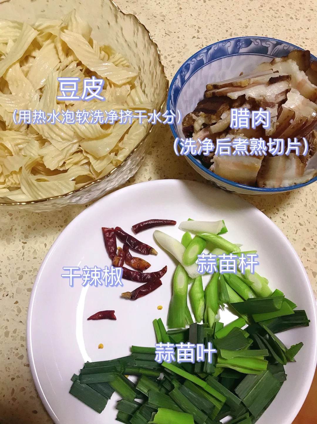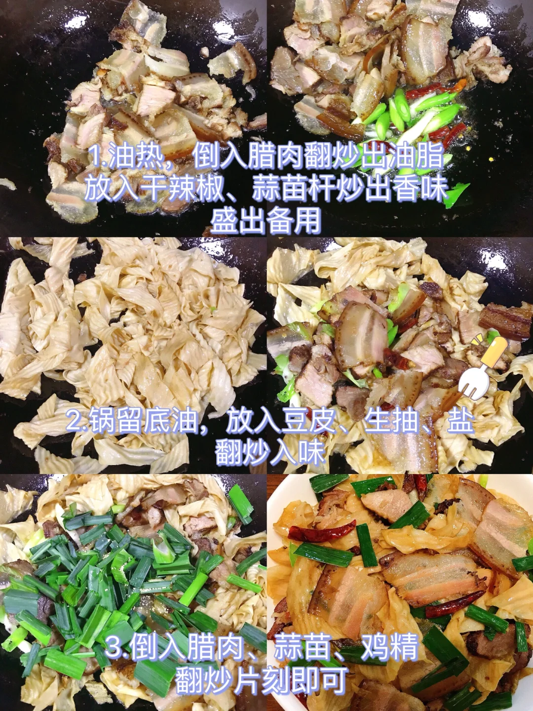 [赞R]今天分享一款豆皮炒腊肉!超级好吃下饭,做法简单!喜欢的赶紧试试吧! [赞R]食材:腊肉、豆皮、蒜苗、干辣椒 [赞R]做法: 1⃣️腊肉洗净后煮熟切片备用;豆皮用热水泡软洗净挤干水分;蒜苗、干辣椒切好备用 2⃣️油热,倒入腊肉翻炒出油脂,放入干辣椒、蒜苗杆炒出香味盛出备用 3⃣️锅留底油,放入豆皮、生抽、盐翻炒入味;倒入腊肉、蒜苗、鸡精翻炒片刻即可