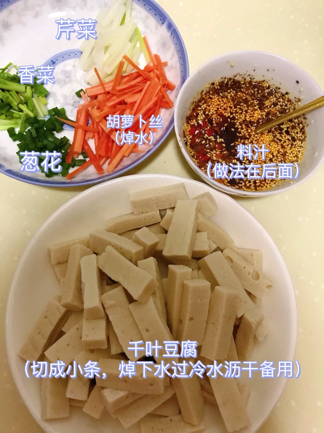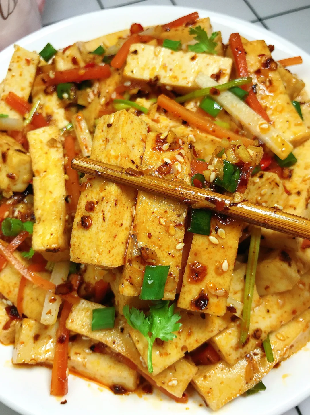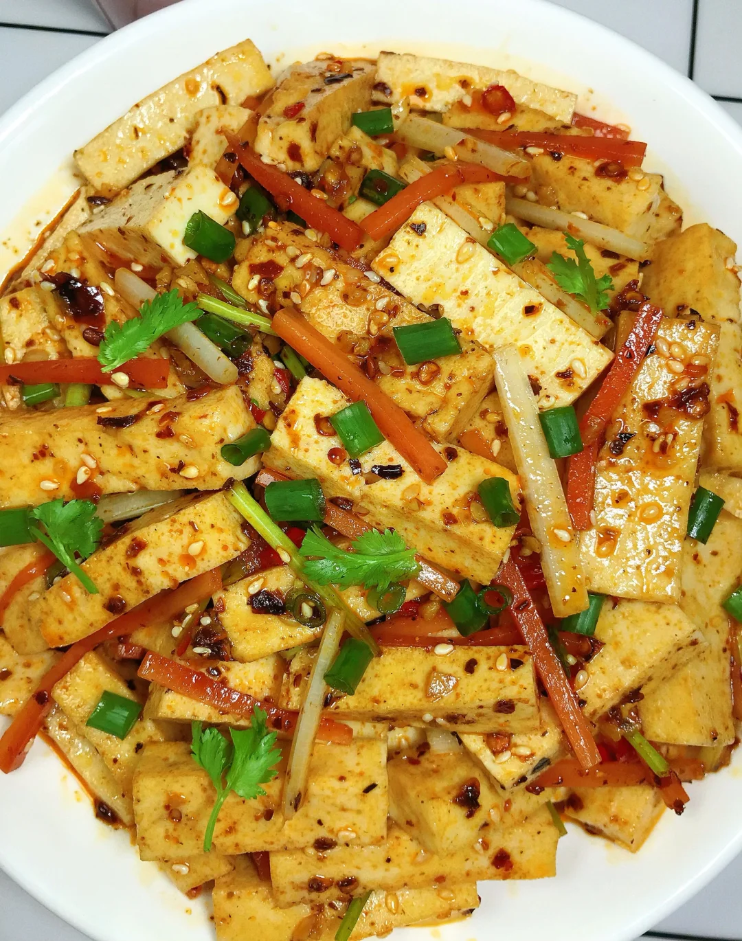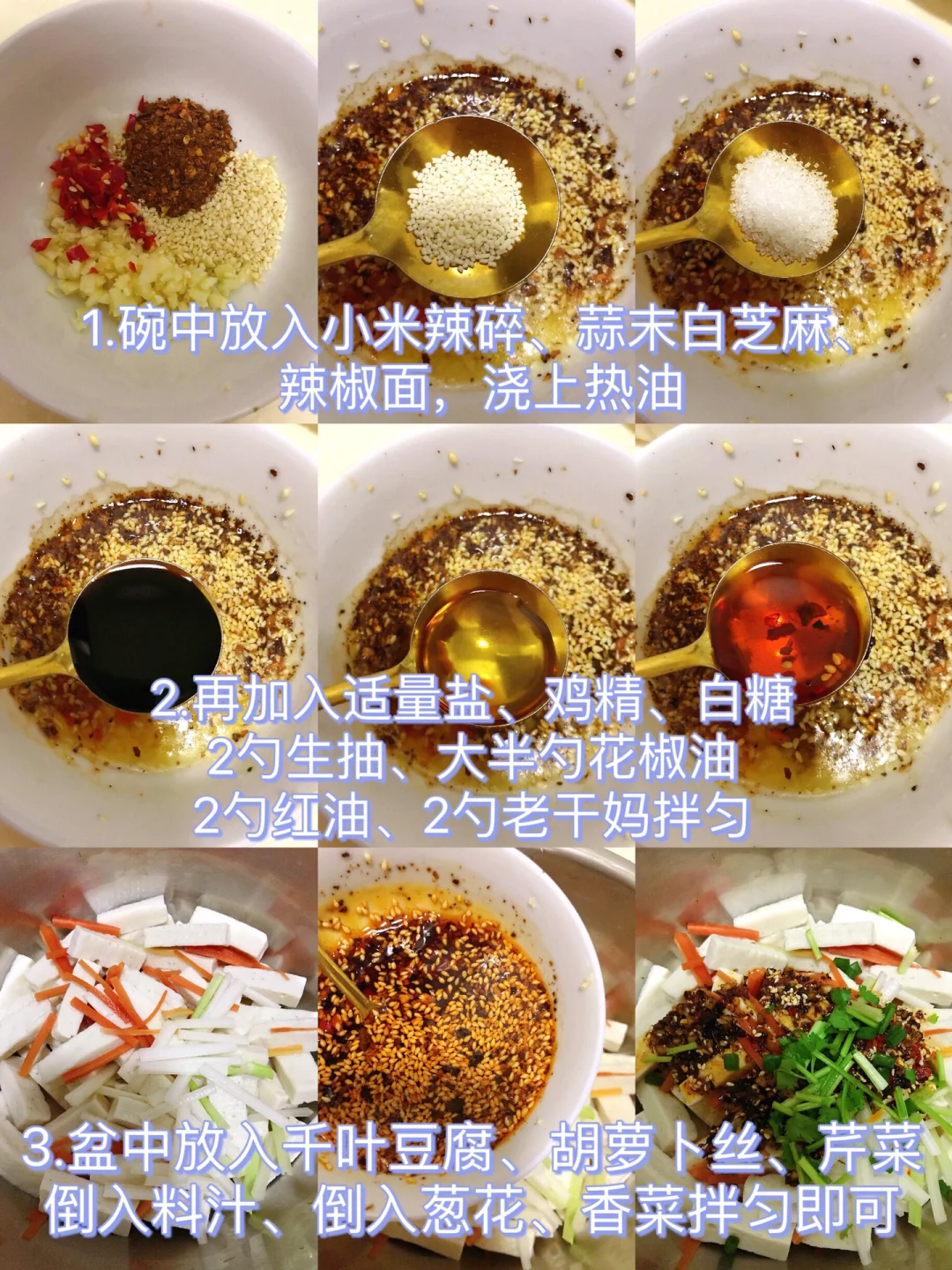 [赞R]今天分享一款凉拌千叶豆腐!香香辣辣,Q弹入味!喜欢的赶紧试试吧! [赞R]食材:千叶豆腐400g、芹菜、胡萝卜、葱花、香菜 [赞R]做法: 1⃣️千叶豆腐切成小条,焯下水过冷水沥干备用;芹菜、胡萝卜(和豆腐一起焯水)、香菜、葱花切好备用 2⃣️料汁:碗中放入小米辣碎、蒜末、白芝麻、辣椒面,浇上热油,再加入适量盐、鸡精、白糖、2勺生抽、大半勺花椒油、2勺红油、2勺老干妈拌匀 3⃣️盆中放入千叶豆腐、胡萝卜丝、芹菜,倒入料汁、葱花、香菜拌匀即可