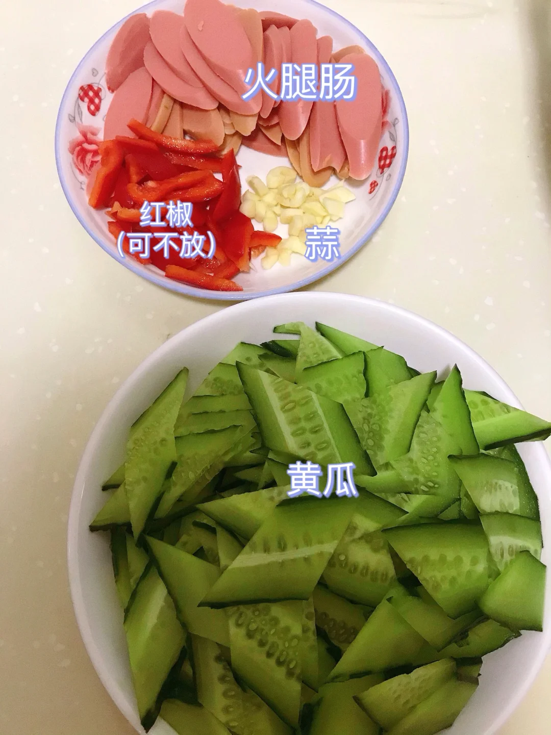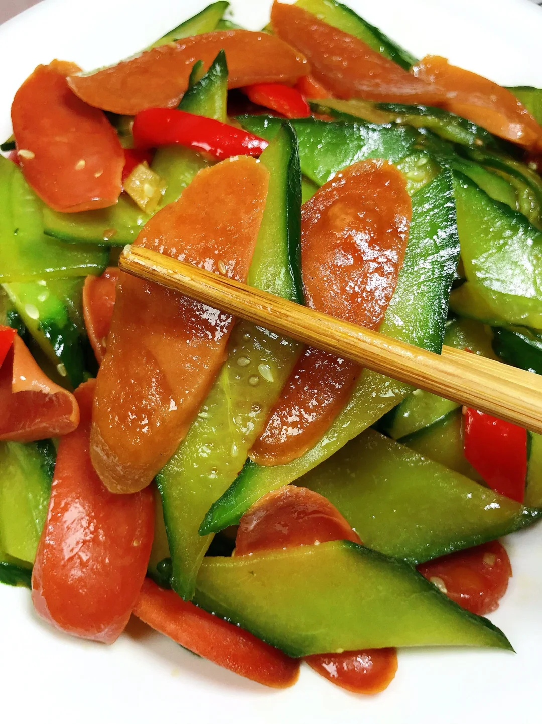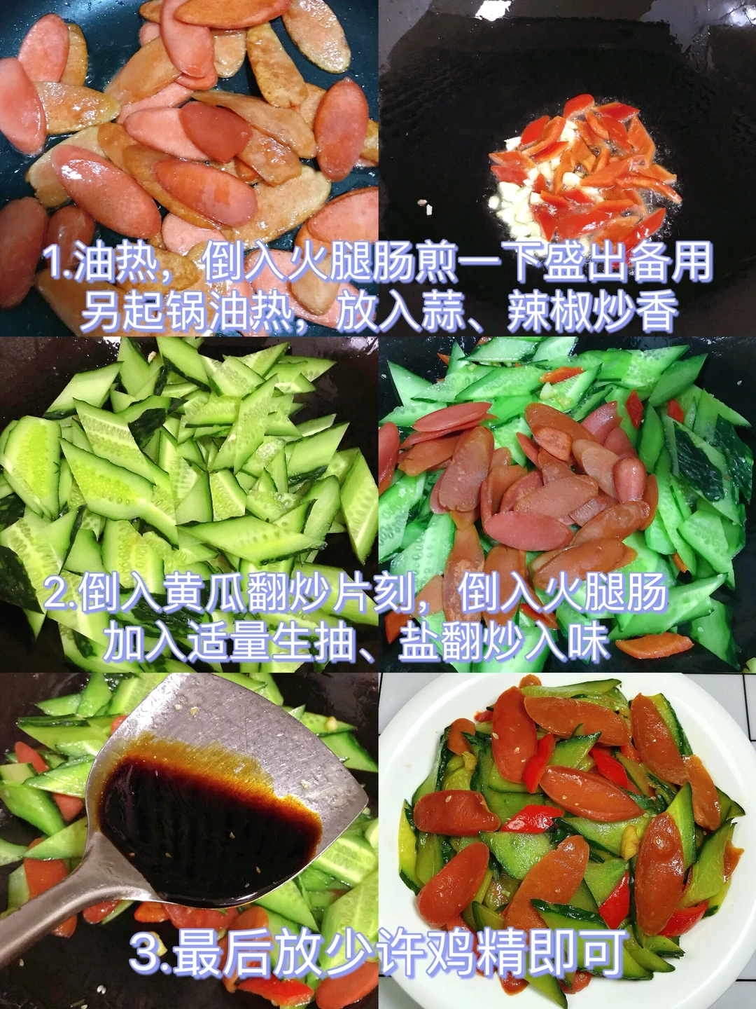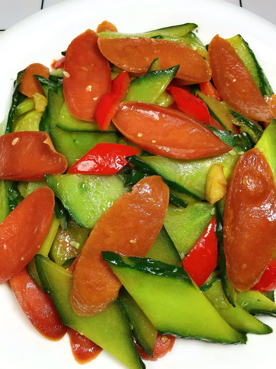 [赞R]今天分享一款黄瓜炒火腿!脆爽美味,好吃不腻,做法简单!喜欢的赶紧试试吧! [赞R]食材:黄瓜、火腿肠、红椒(可不放)、蒜 [赞R]做法: 1⃣️油热,倒入火腿肠煎一下盛出备用;另起锅油热,放入蒜、辣椒炒香 2⃣️倒入黄瓜翻炒片刻,倒入火腿肠,加入适量生抽、盐翻炒入味 3⃣️最后放入少许鸡精即可