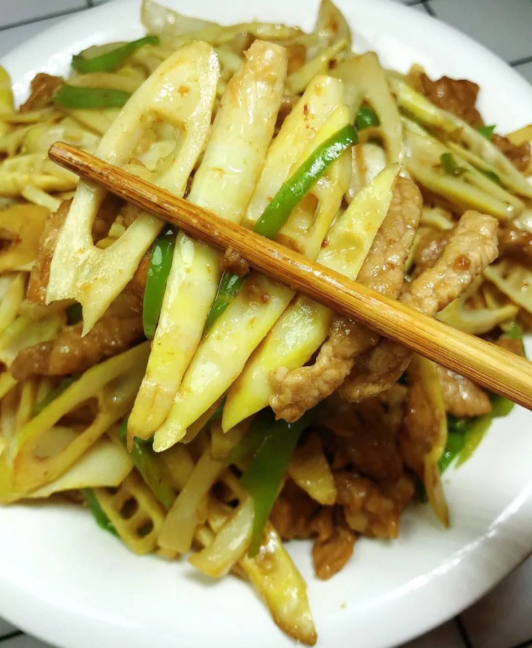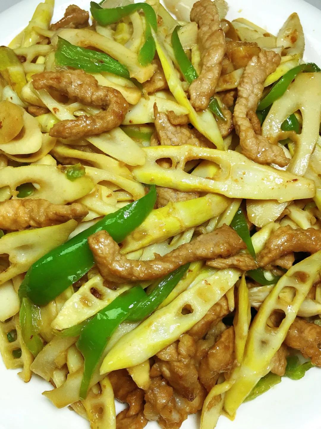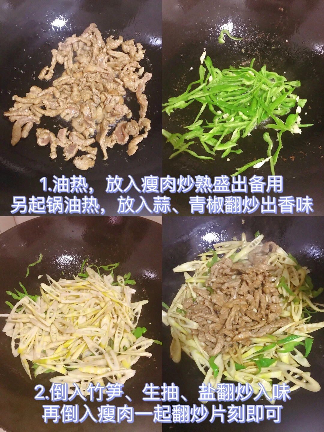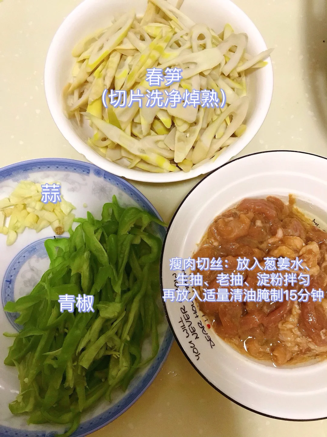 [赞R]今天分享一款春笋炒肉!脆嫩爽口,开胃下饭!喜欢的赶紧试试吧! [赞R]食材:瘦肉、春笋、青椒、蒜 [赞R]做法: 1⃣️瘦肉切丝:放入葱姜水、生抽、老抽淀粉拌匀,再放入适量清油腌制15分钟;春笋切片洗净焯熟;青椒、大蒜切好备用 2⃣️油热,放入瘦肉炒熟盛出备用,另起锅油热,放入蒜、青椒翻炒出香味 3⃣️倒入竹笋、生抽、盐翻炒入味,再倒入瘦肉一起翻炒片刻即可