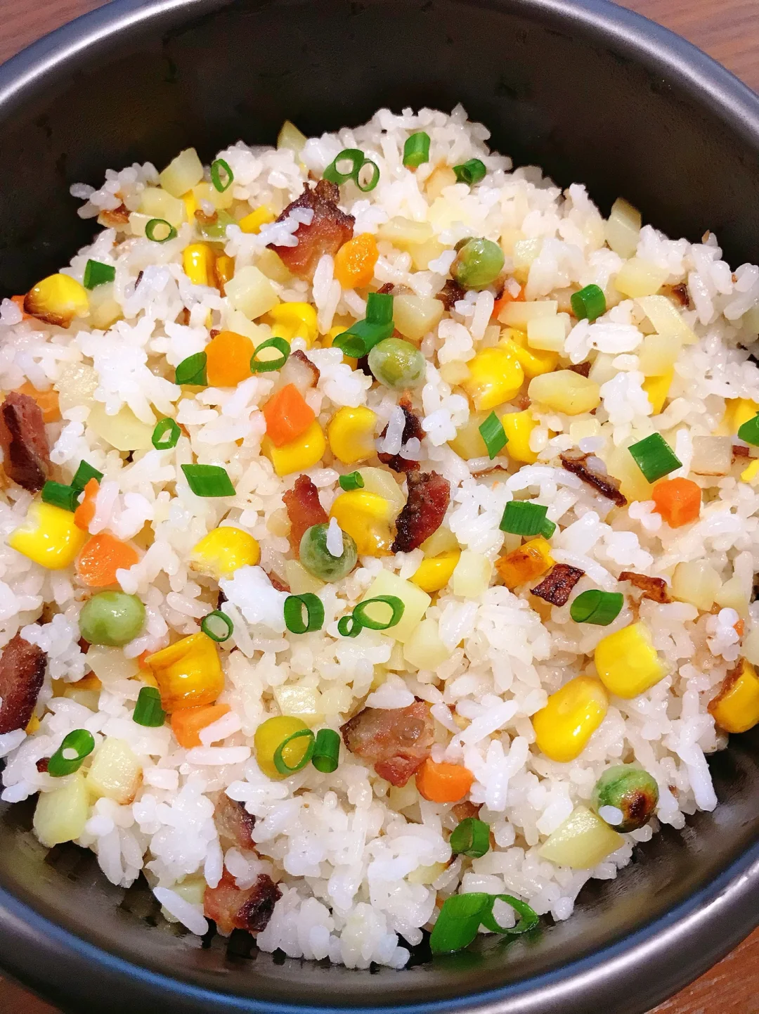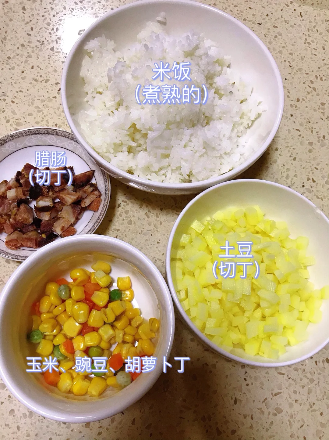 1⃣️米饭煮好盛出备用;腊肠、土豆、胡萝卜切丁,豌豆、玉米备用(可以提前焯一下水)