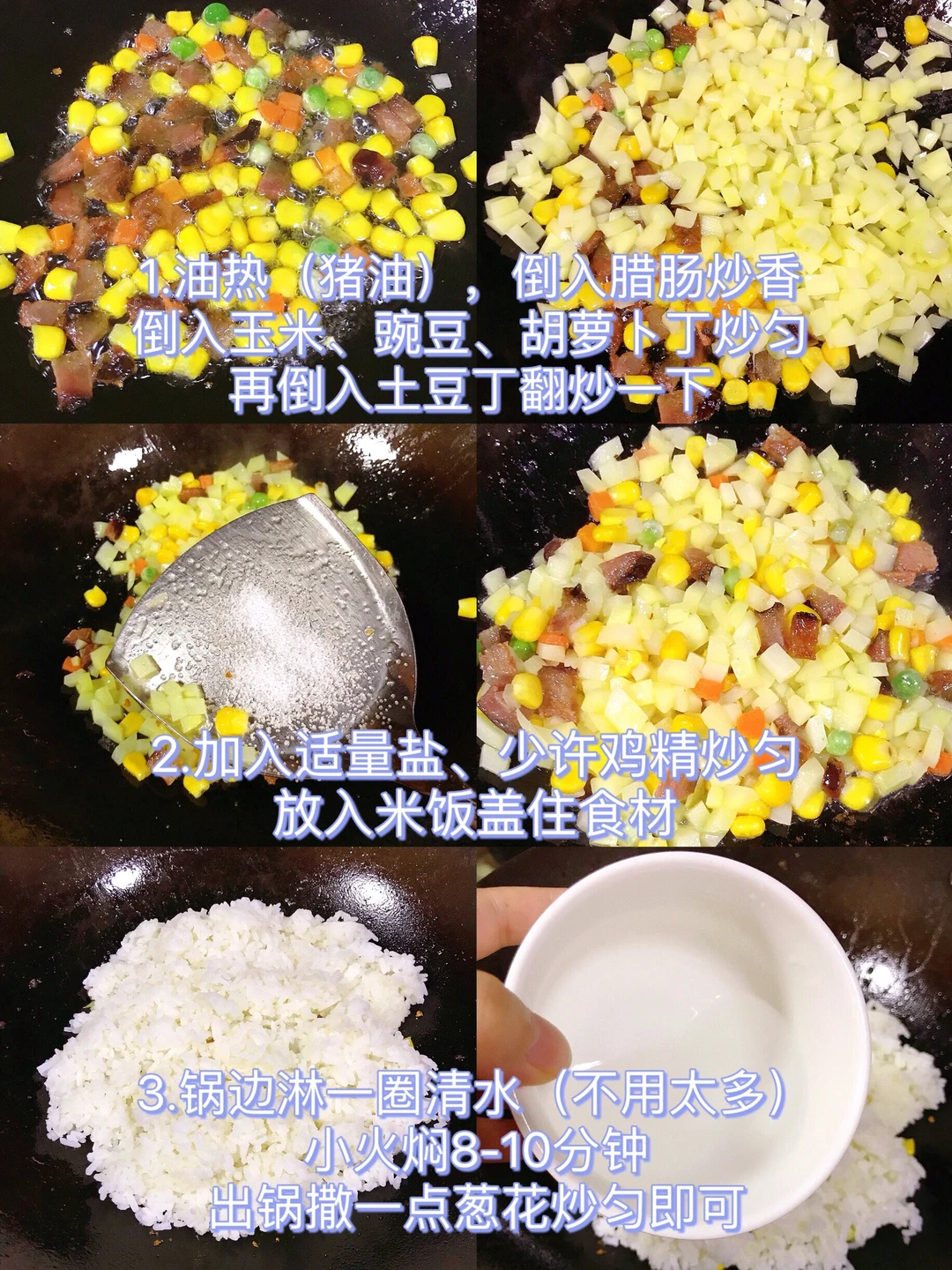 2⃣️油热(猪油),倒入腊肠炒香,倒入玉米、豌豆、胡萝卜丁炒匀,再倒入土豆丁翻炒一下