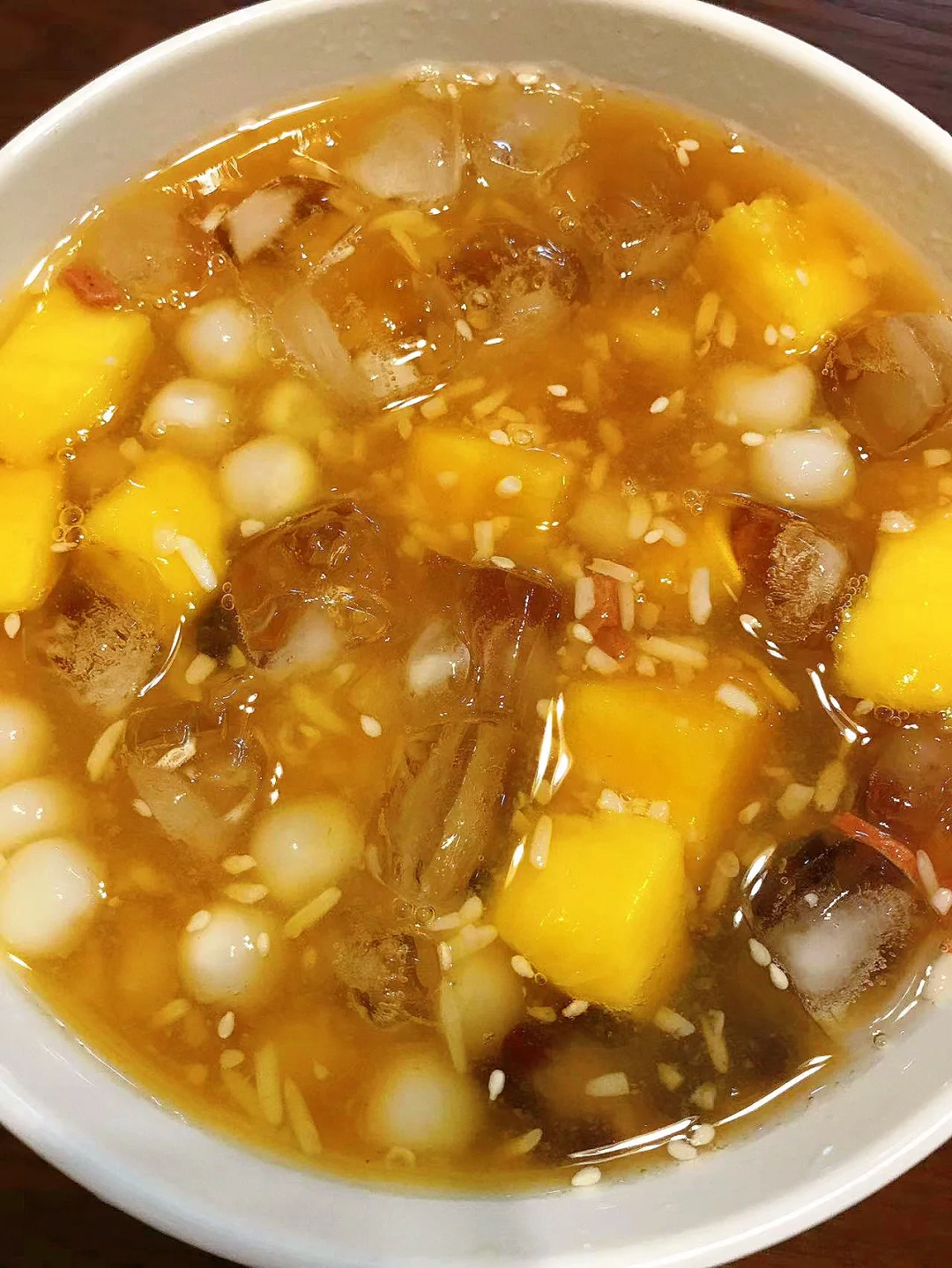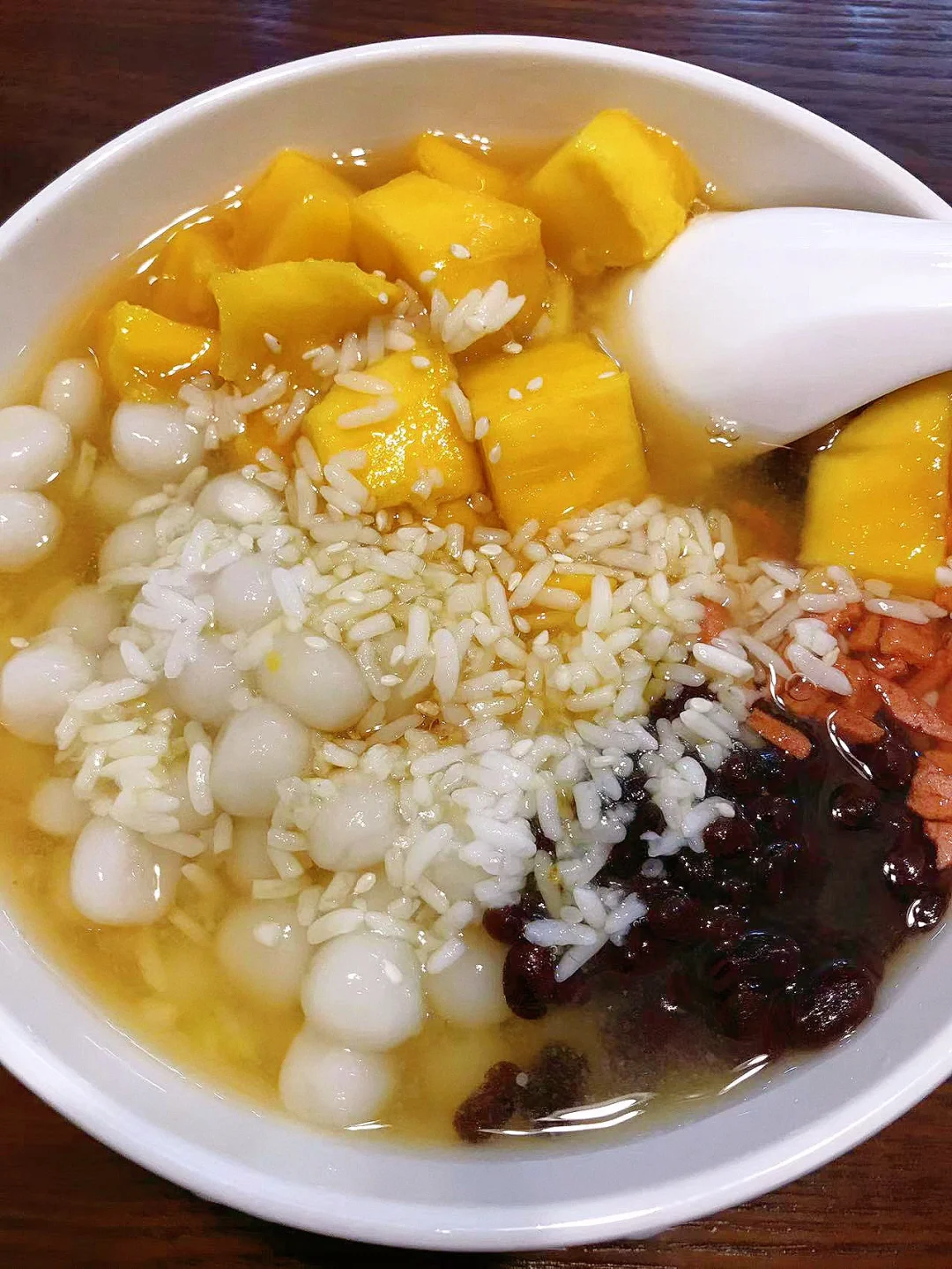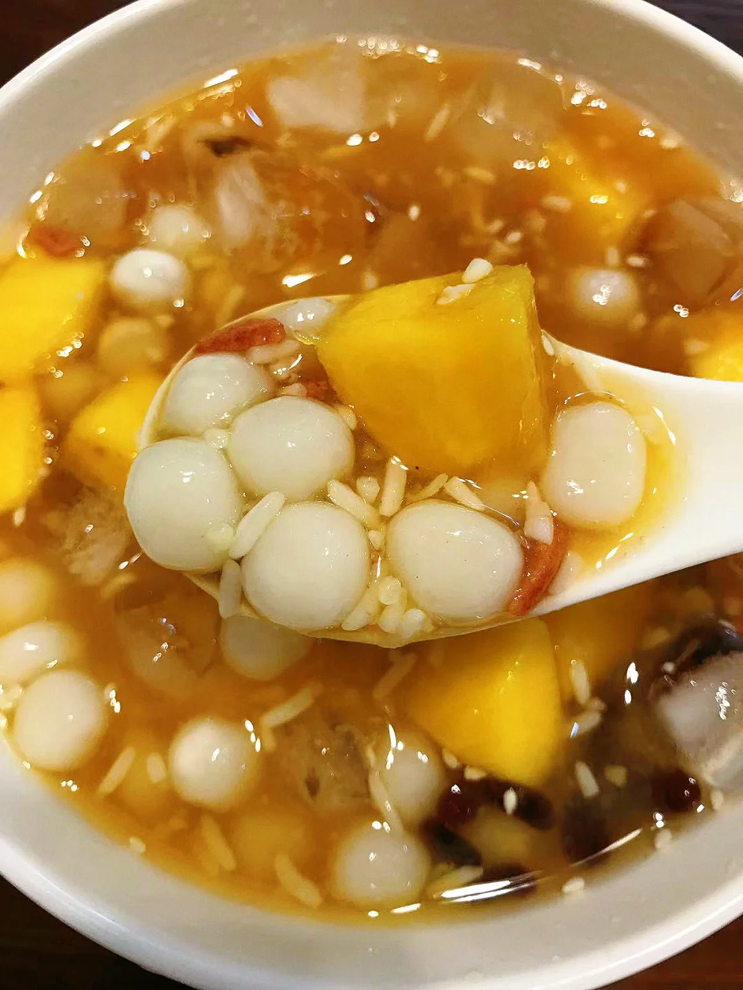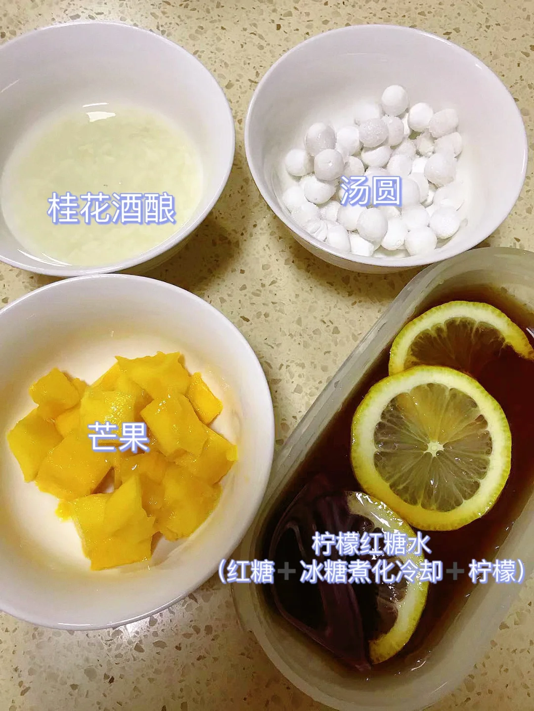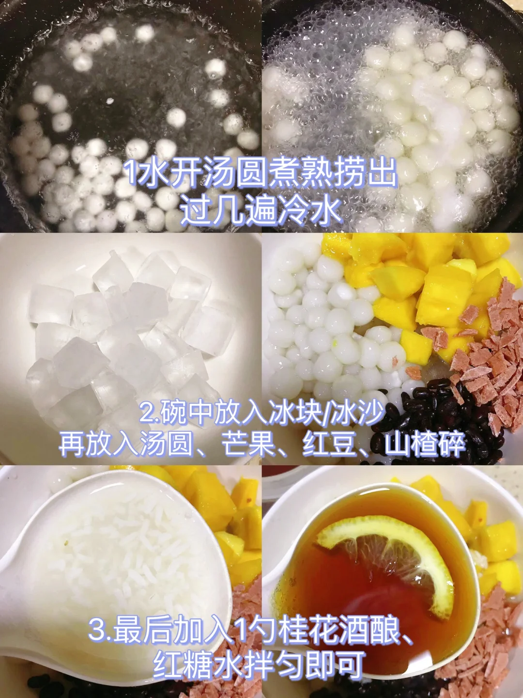 [赞R]今天分享一款红糖冰汤圆!冰冰凉凉!糯糯叽叽的好好吃呀!喜欢的赶紧试试吧! [赞R]食材:小汤圆、桂花酒酿(超市买的)、芒果、红糖水 [赞R]做法: 1.芒果切块;柠檬红糖水(红糖➕冰糖煮化冷却➕柠檬) 2.水开放入汤圆煮熟捞出过几遍冷水 3.碗中放入冰块/冰沙,再放入汤圆、芒果、红豆、山楂碎 4.最后加入1勺桂花酒酿、红糖水拌匀即可