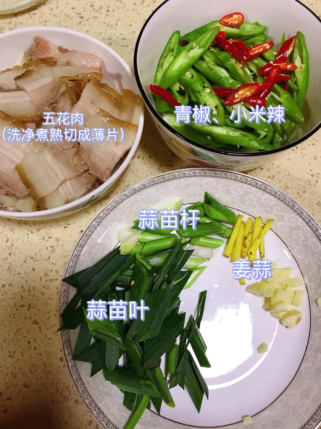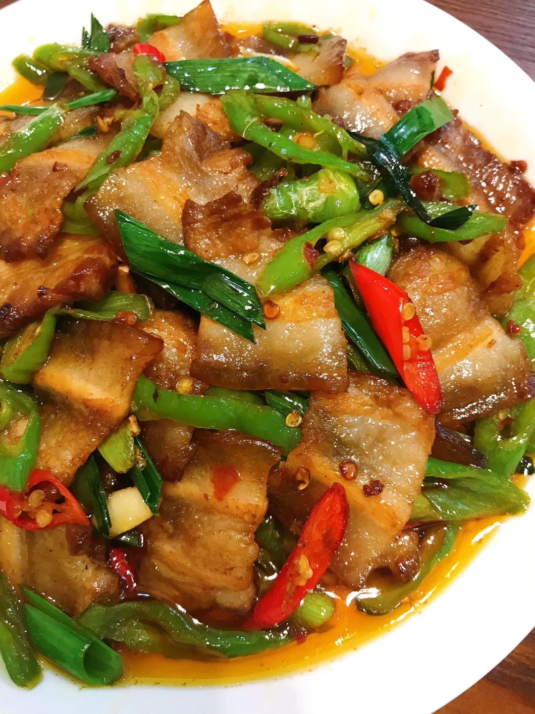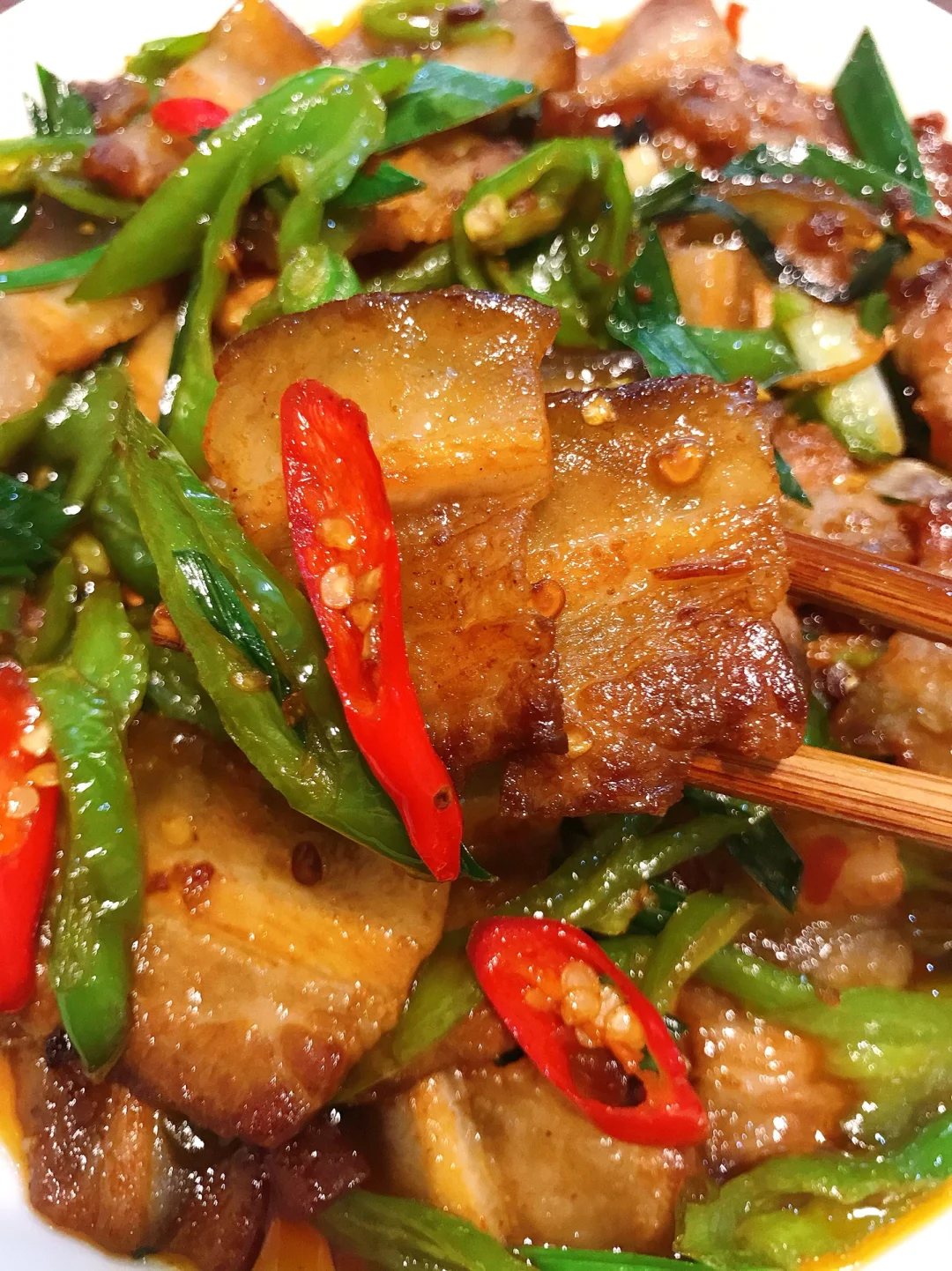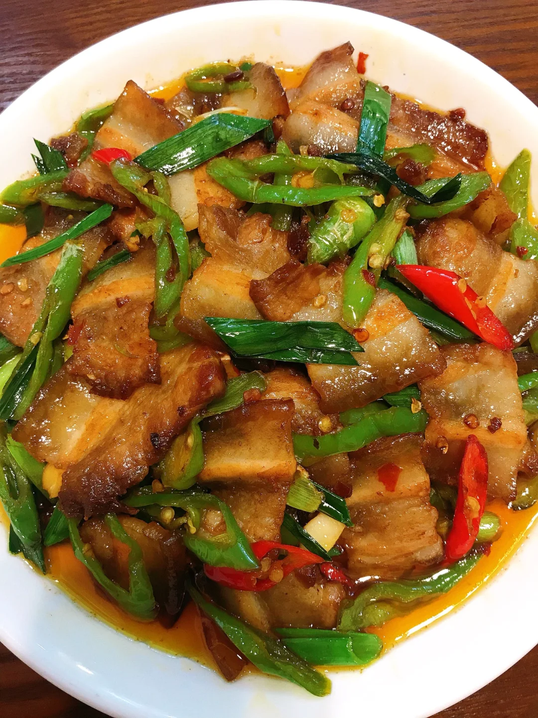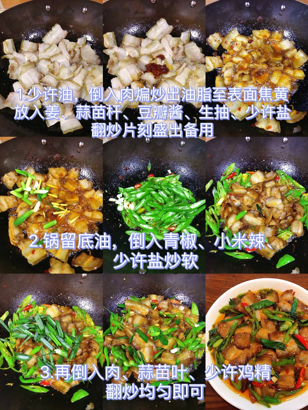 [赞R]今天分享一款农家小炒肉!香辣过瘾,简单易做!好吃就是太费米饭了!喜欢的赶紧试试吧! [赞R]食材:五花肉、青椒(二荆条)、小米辣、蒜苗杆、蒜苗叶、姜蒜 [赞R]做法: 1⃣️少许油,倒入肉煸炒出油脂至表面焦黄,放入姜、蒜苗杆、豆瓣酱、生抽、少许盐翻炒片刻盛出备用 2⃣️锅留底油,倒入青椒、小米辣,少许盐炒软,再倒入肉、蒜苗叶、少许鸡精翻炒均匀即可