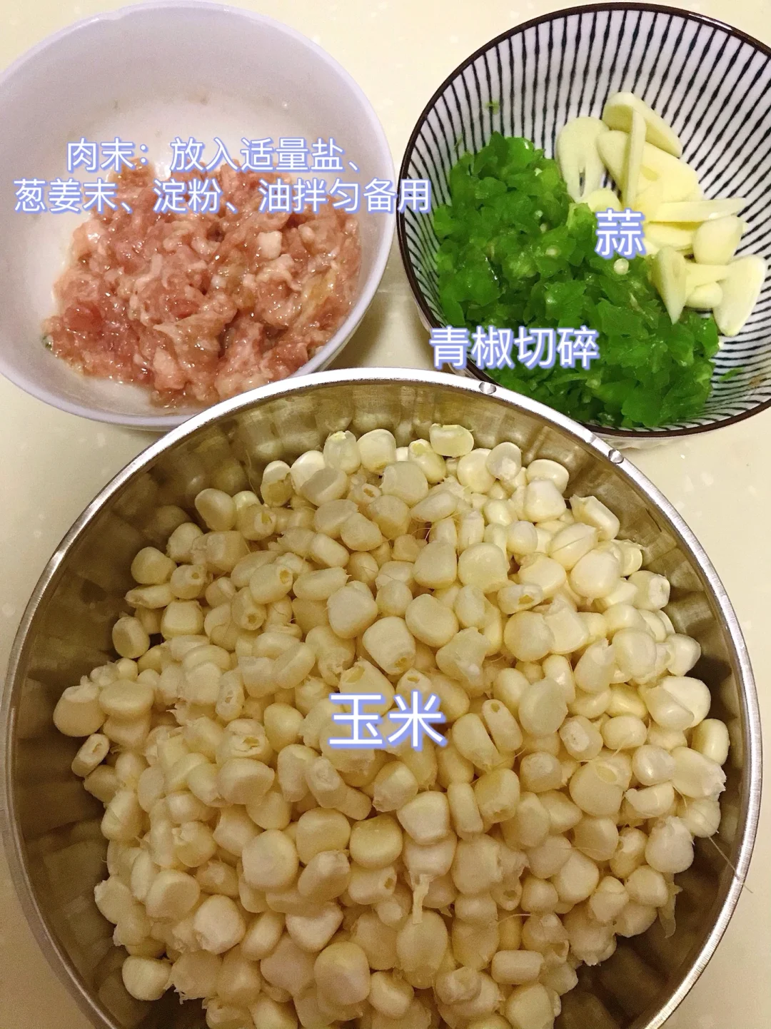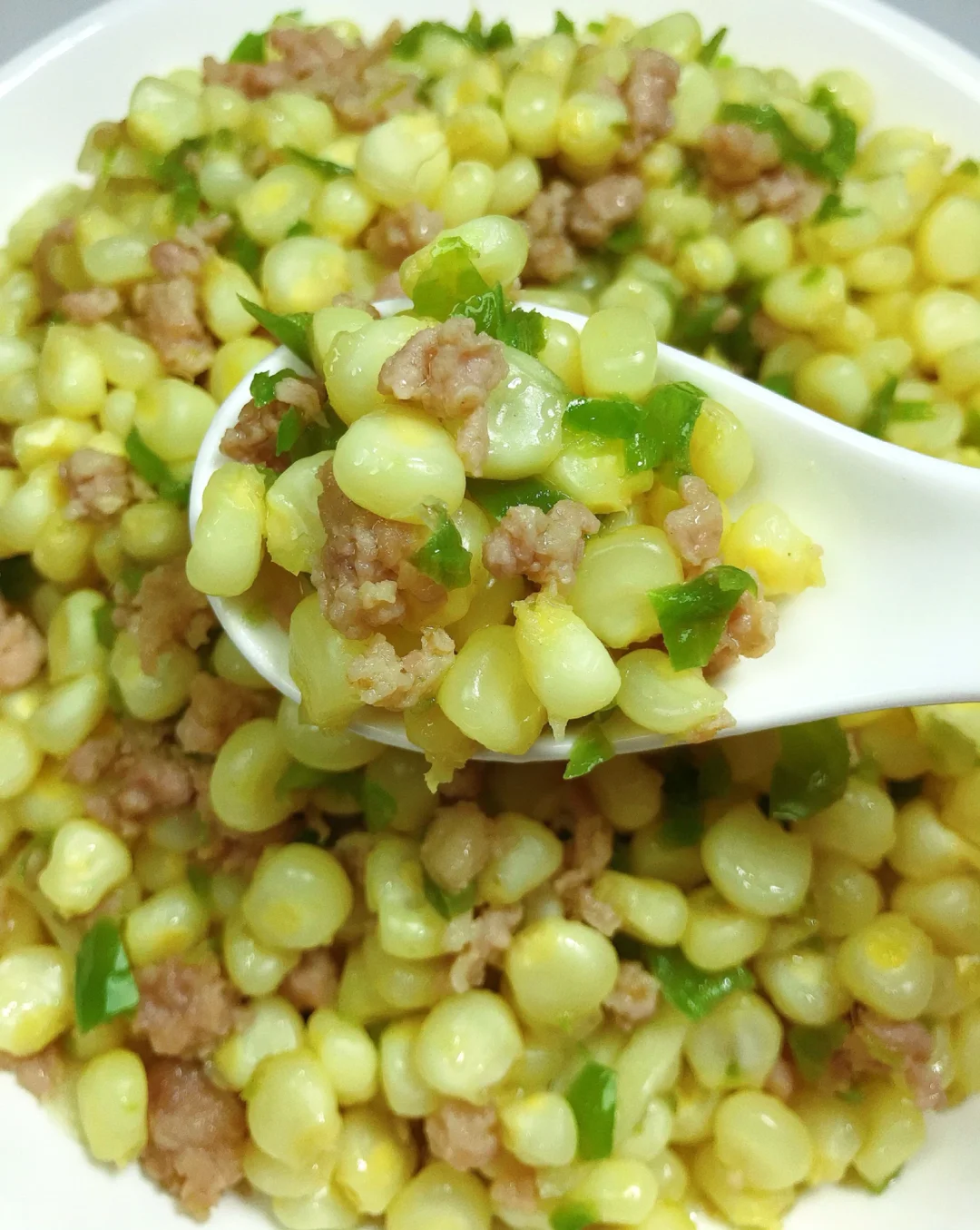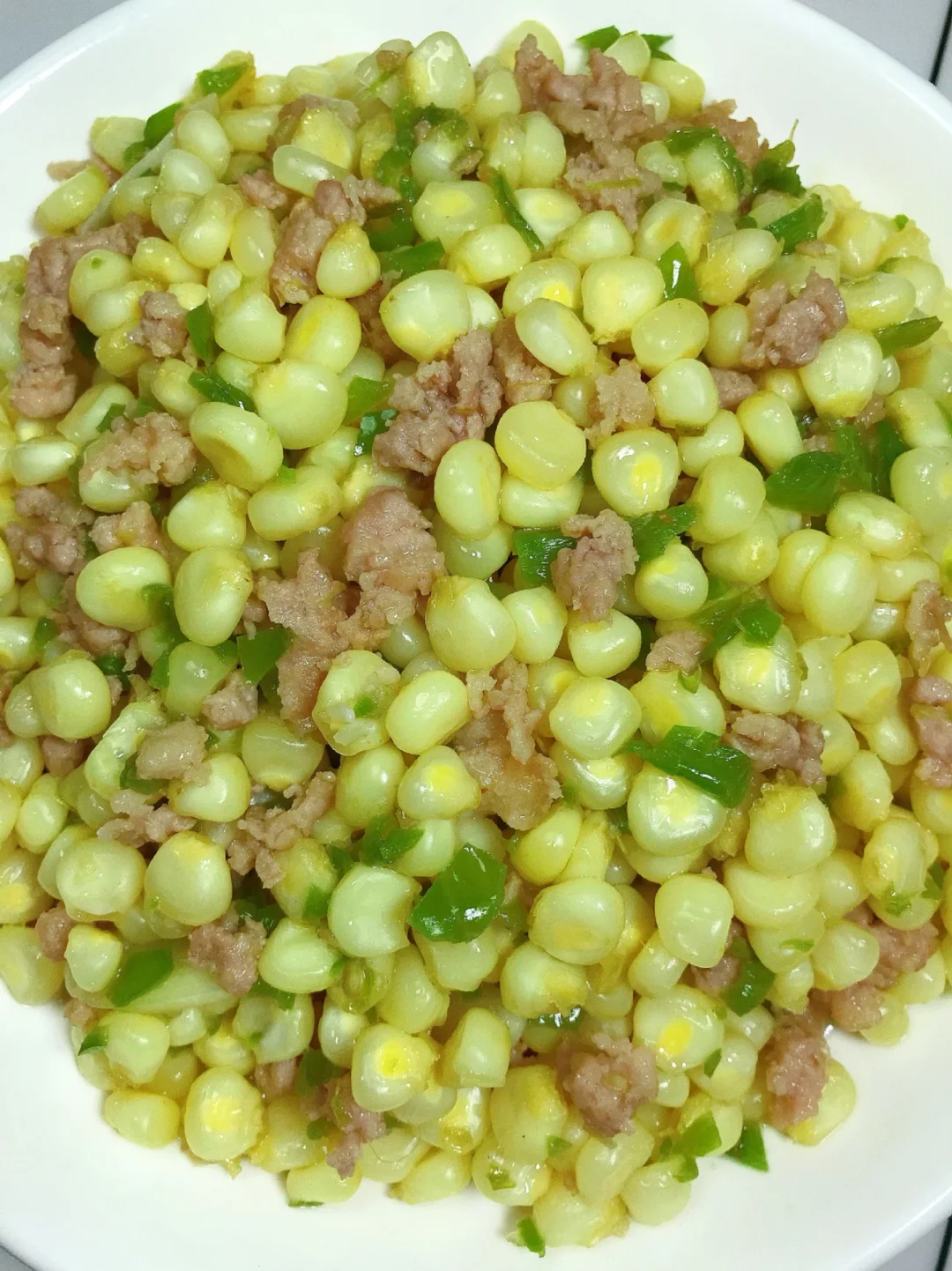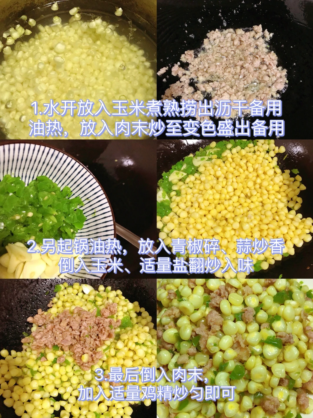 [赞R]今天分享一款玉米炒肉沫!巨好吃,巨下饭!一口气炫了三碗饭!喜欢的赶紧试试吧! [赞R]食材:玉米、肉末、青椒、蒜 [赞R]做法: 1⃣️肉末:加入适量盐、葱姜末、水淀粉、油拌匀;青椒切碎,蒜切片;玉米:洗净水开放入煮熟捞出沥干备用 2⃣️油热,放入肉末炒至变色盛出备用;另起锅油热,放入青椒碎、蒜炒香,倒入玉米、适量盐翻炒入味 3⃣️最后倒入肉末,加入适量鸡精炒匀即可