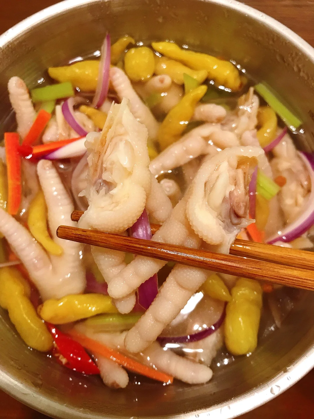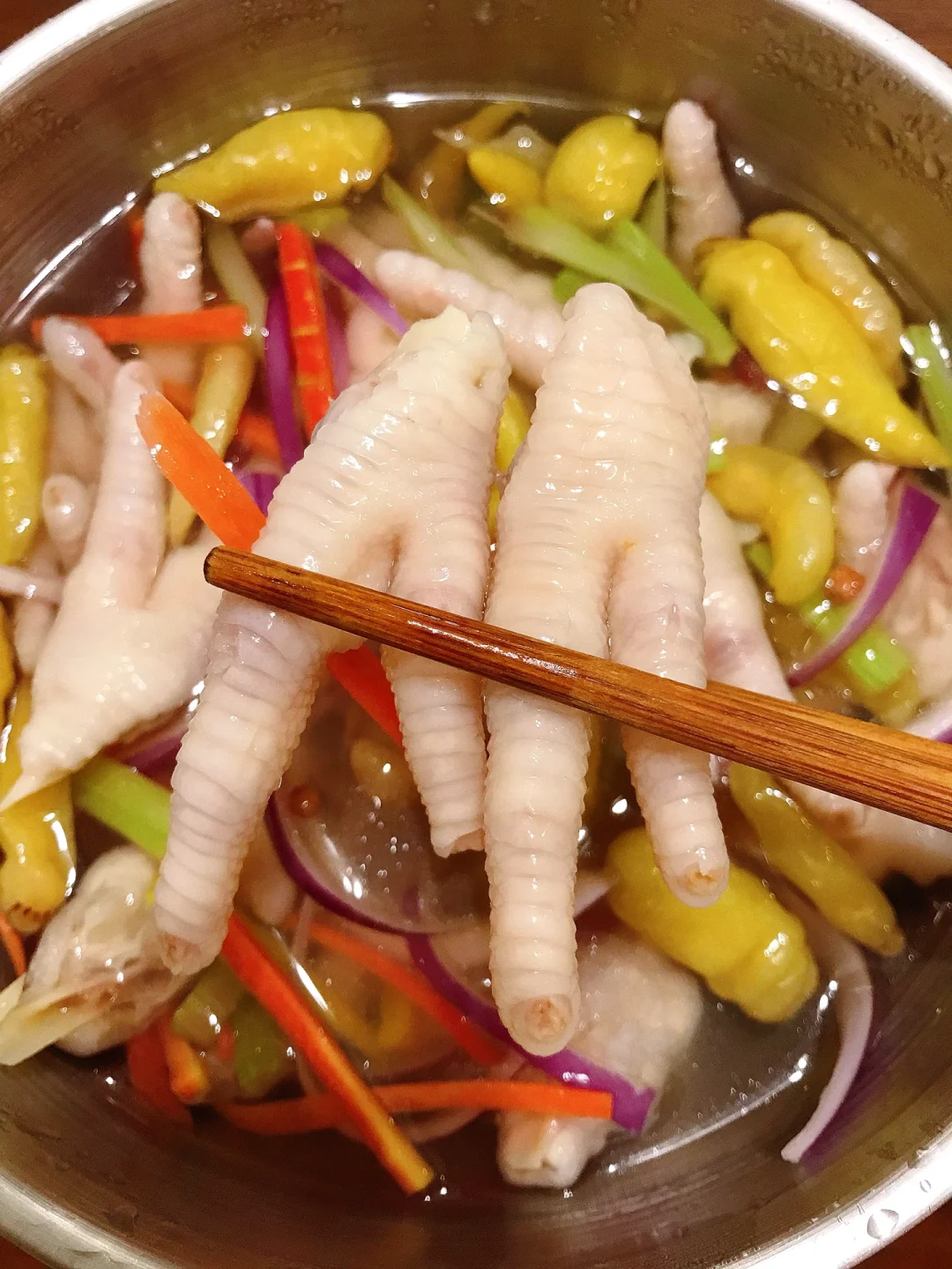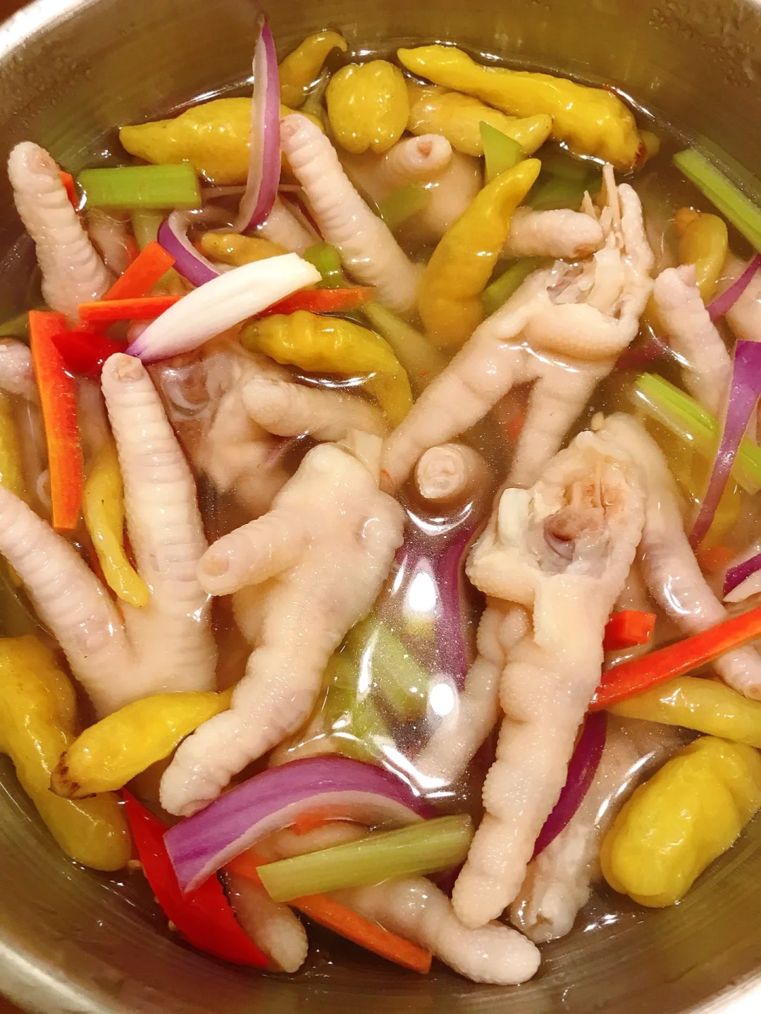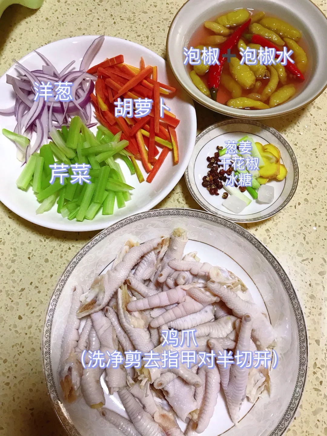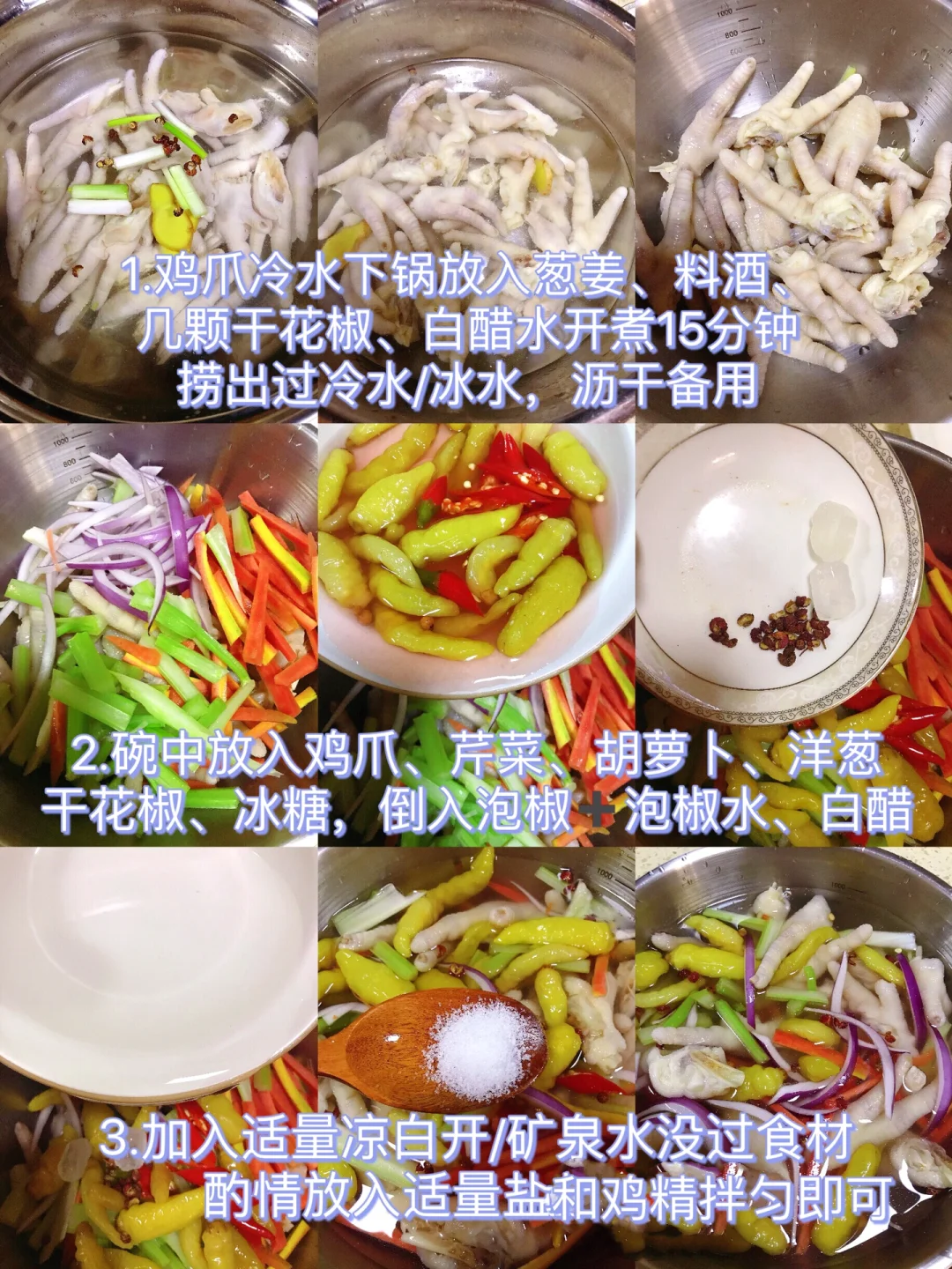 [赞R]今天分享一款泡椒鸡爪!Q弹有嚼劲儿!开胃解腻,好吃到停不下来!喜欢的赶紧试试吧! [赞R]食材:鸡爪、洋葱、胡萝卜、芹菜、葱姜、干花椒、冰糖、泡椒和泡椒水 [赞R]做法: 1.鸡爪洗净剪掉指甲对半切开备用;所有食材备好 2.鸡爪冷水下锅放入葱姜、料酒、几颗干花椒、白醋,水开煮15分钟捞出过冷水/冰水,沥干备用 3.碗中放入鸡爪、芹菜、胡萝卜、洋葱、干花椒、冰糖,倒入泡椒和泡椒水、白醋(一点点) 4.加入适量凉白开/矿泉水没过食材,酌情放入盐和鸡精拌匀即可(放入冰箱冷藏一晚)