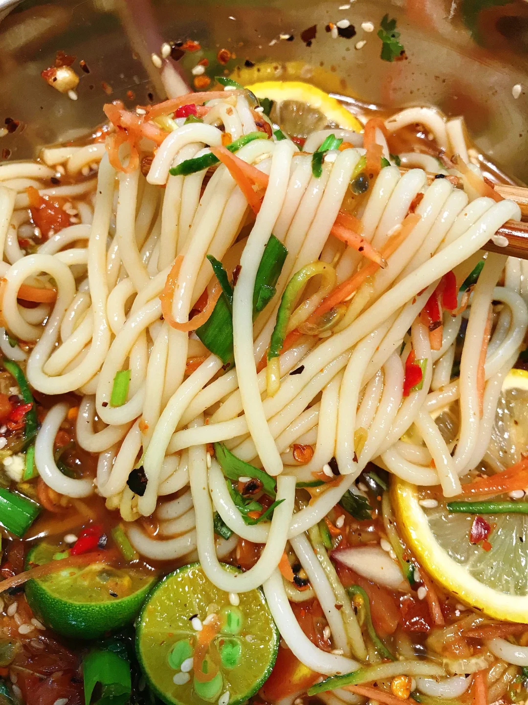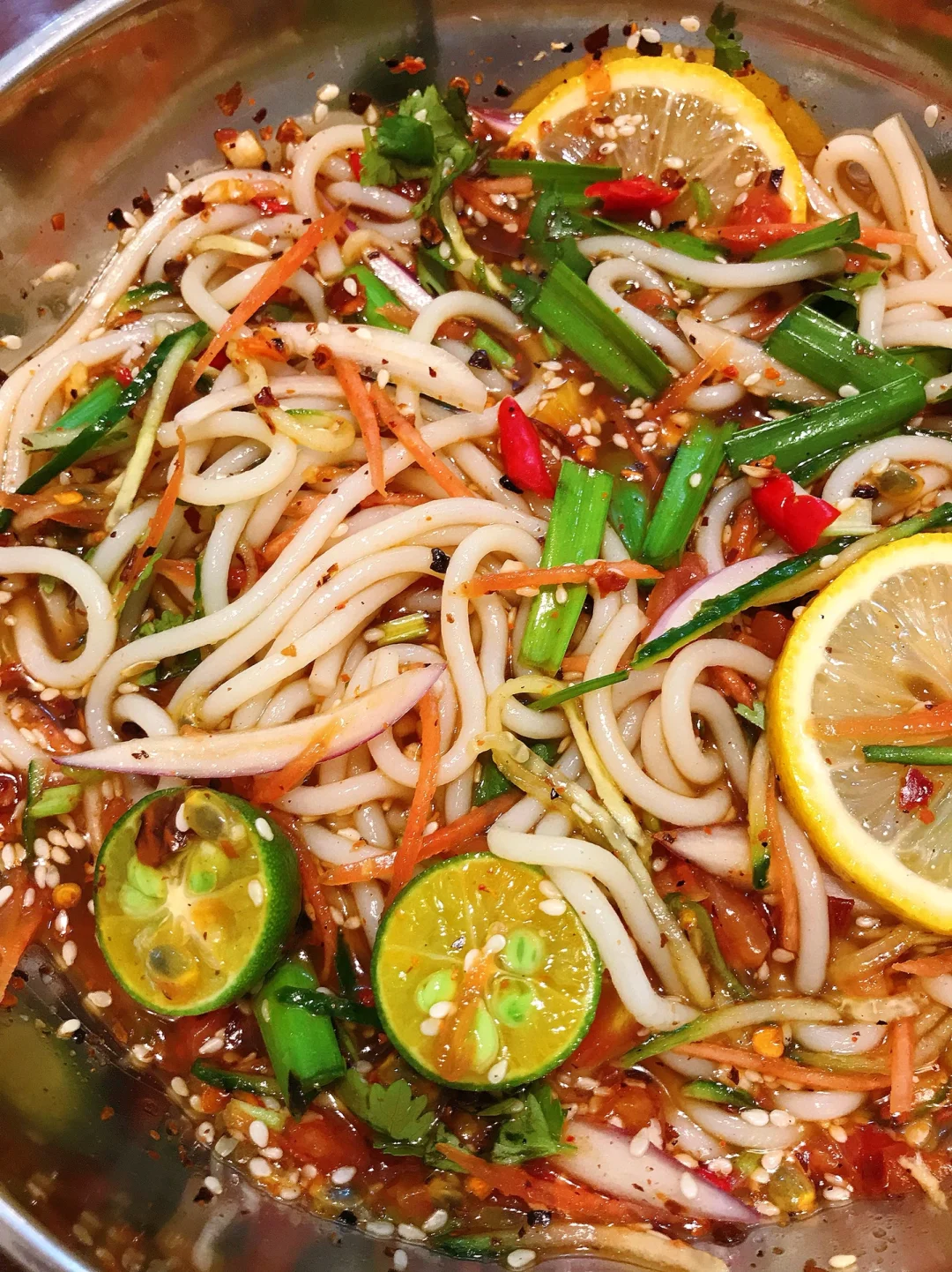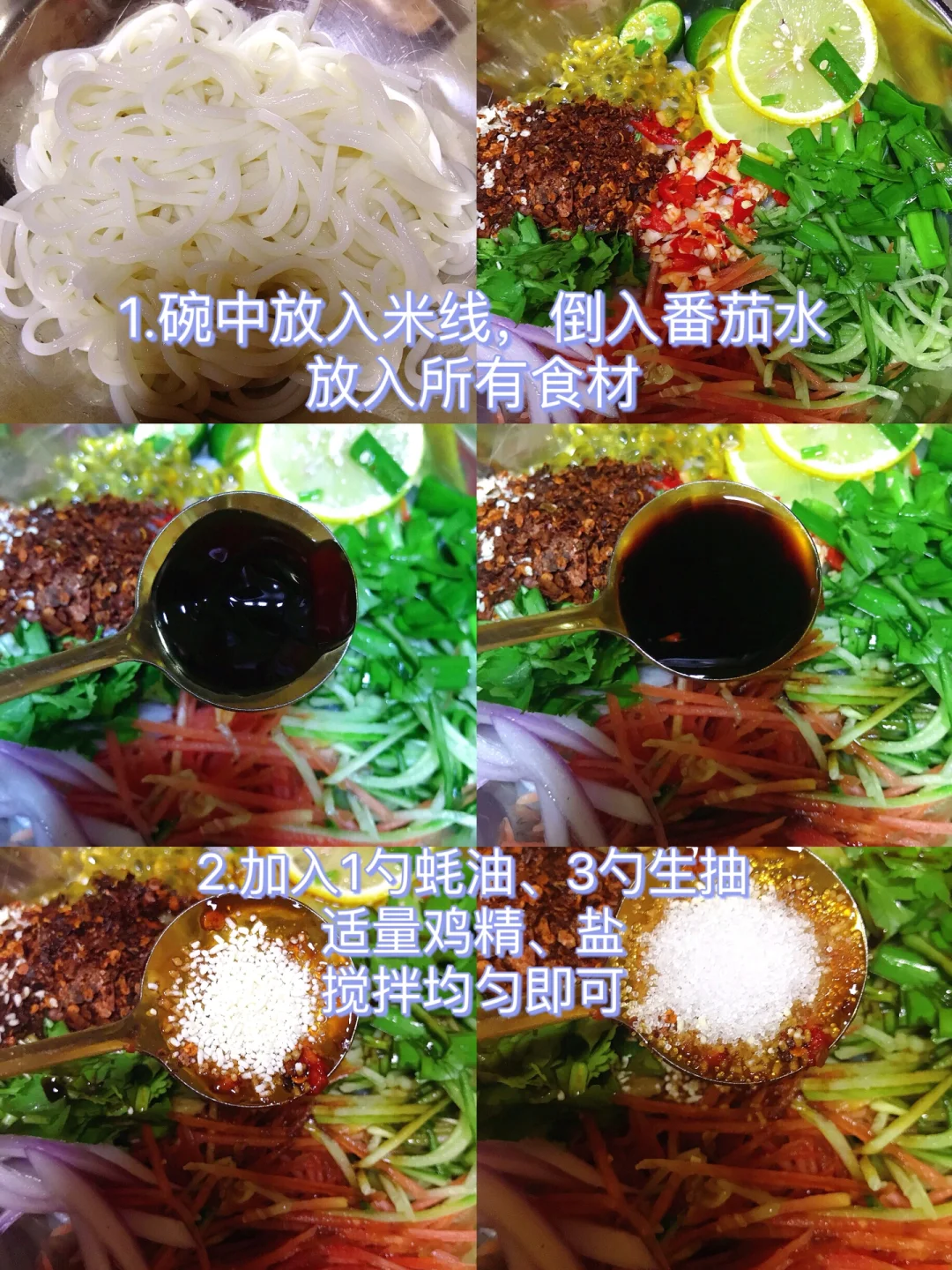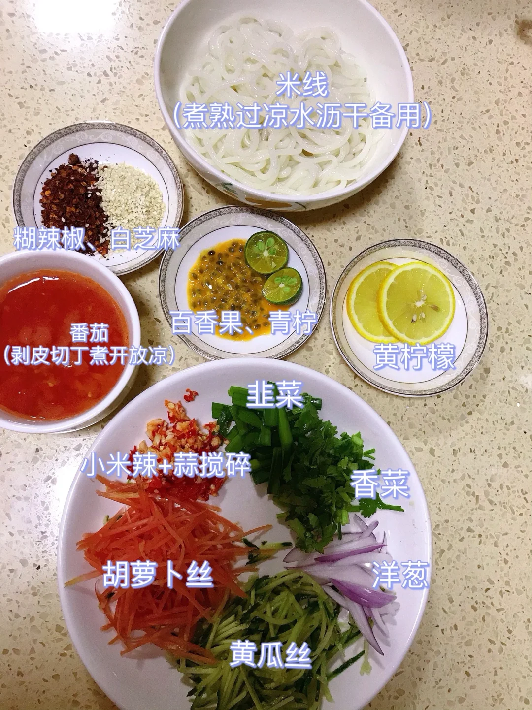 1⃣️米线煮熟过凉水沥干备用;柠檬切片、百香果挖出来备用;番茄切丁,加入适量清水煮开盛出放凉;韭菜、香菜、洋葱、黄瓜、胡萝卜切好备用;小米辣+蒜搅碎、糊辣椒(没有可用干辣椒炒糊捏碎)、白芝麻备用