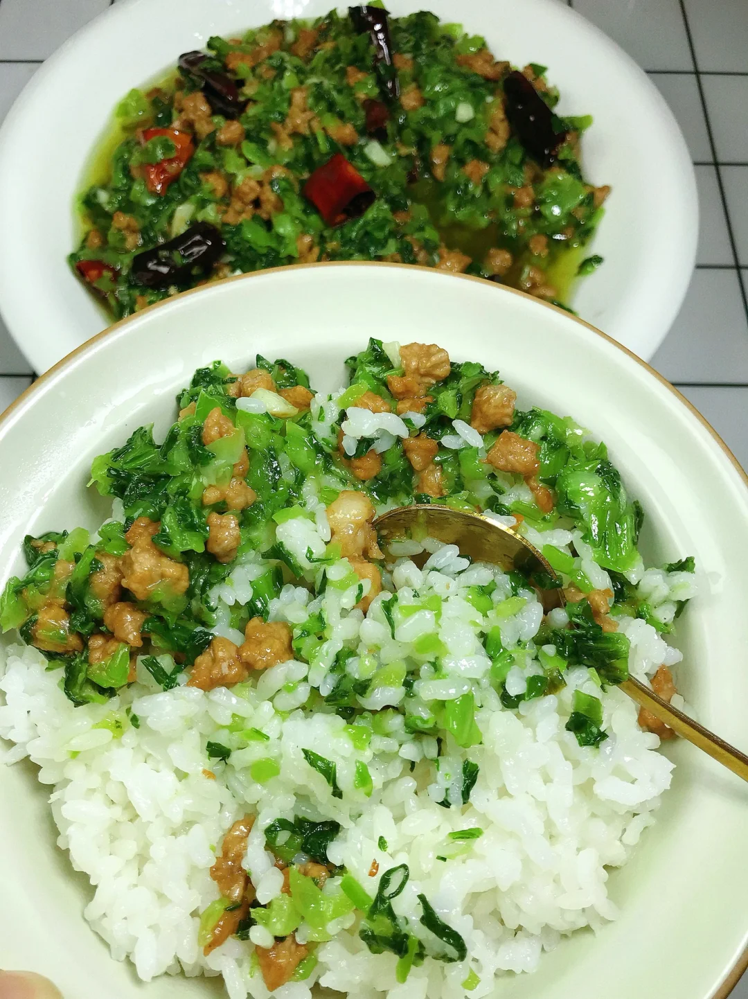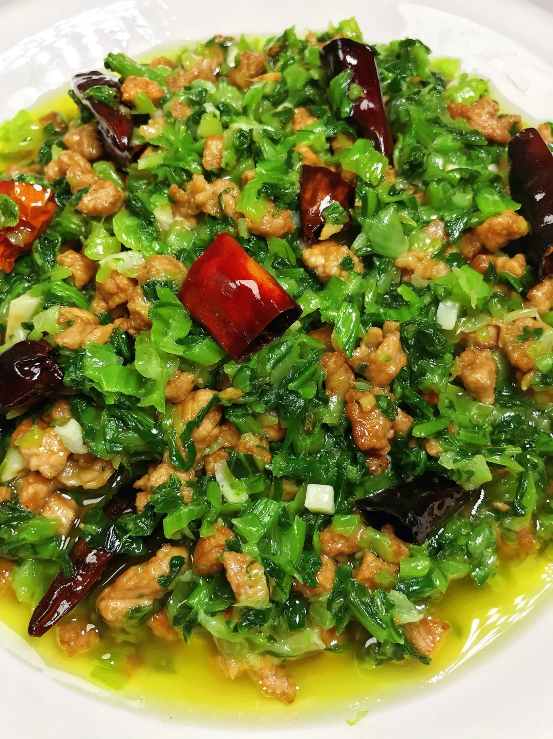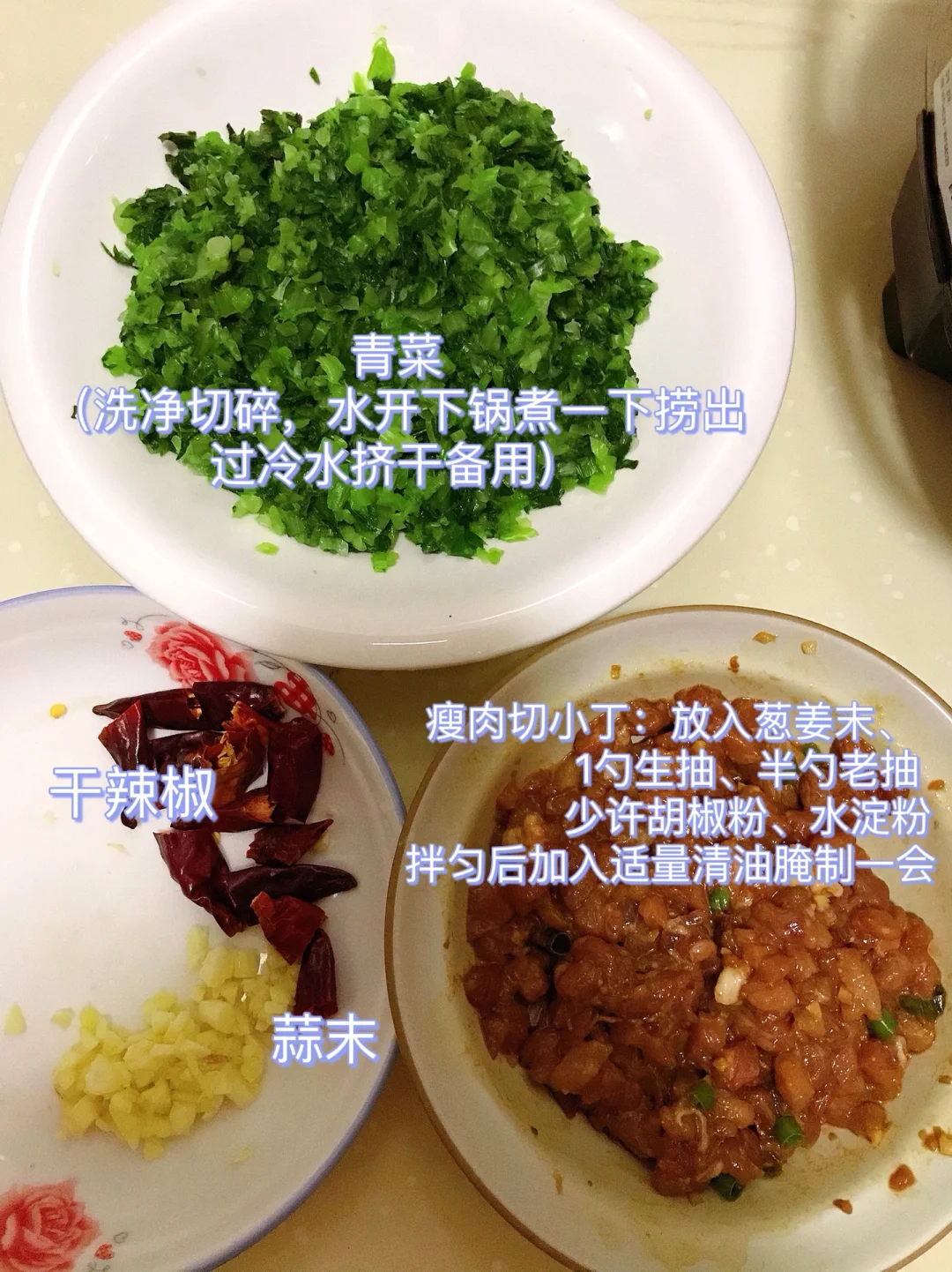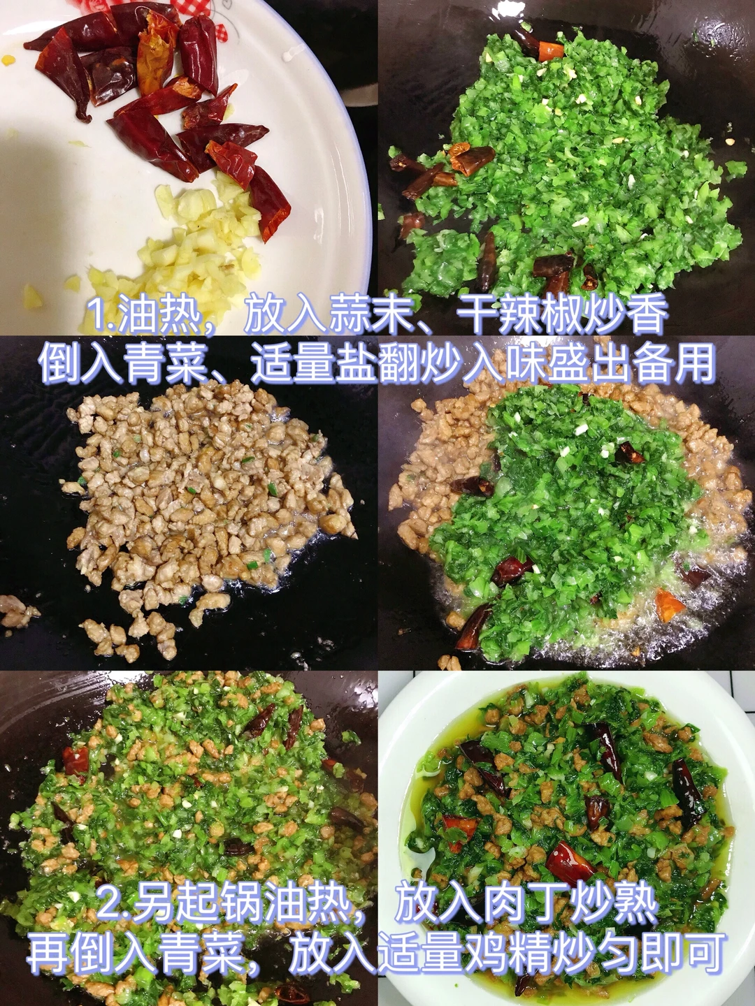 [赞R]今天分享一款青菜肉末!好吃营养又健康,做法简单,大人小孩都超爱!喜欢的赶紧试试吧! [赞R]食材:青菜(瓢儿白/菜心)、瘦肉、干辣椒、蒜末 [赞R]做法: 1⃣️青菜洗净切碎,水开下锅焯水捞出过冷水挤干备用;瘦肉切小丁,放入葱姜末、1勺生抽、半勺老抽、少许胡椒粉、水淀粉拌匀后加入适量清油腌制一会;干辣椒、大蒜切好备用 2⃣️油热,放入蒜末、干辣椒炒香,倒入青菜、适量盐翻炒入味盛出备用 3⃣️另起锅油热,放入肉丁炒熟,再倒入青菜,放入适量鸡精炒匀即可