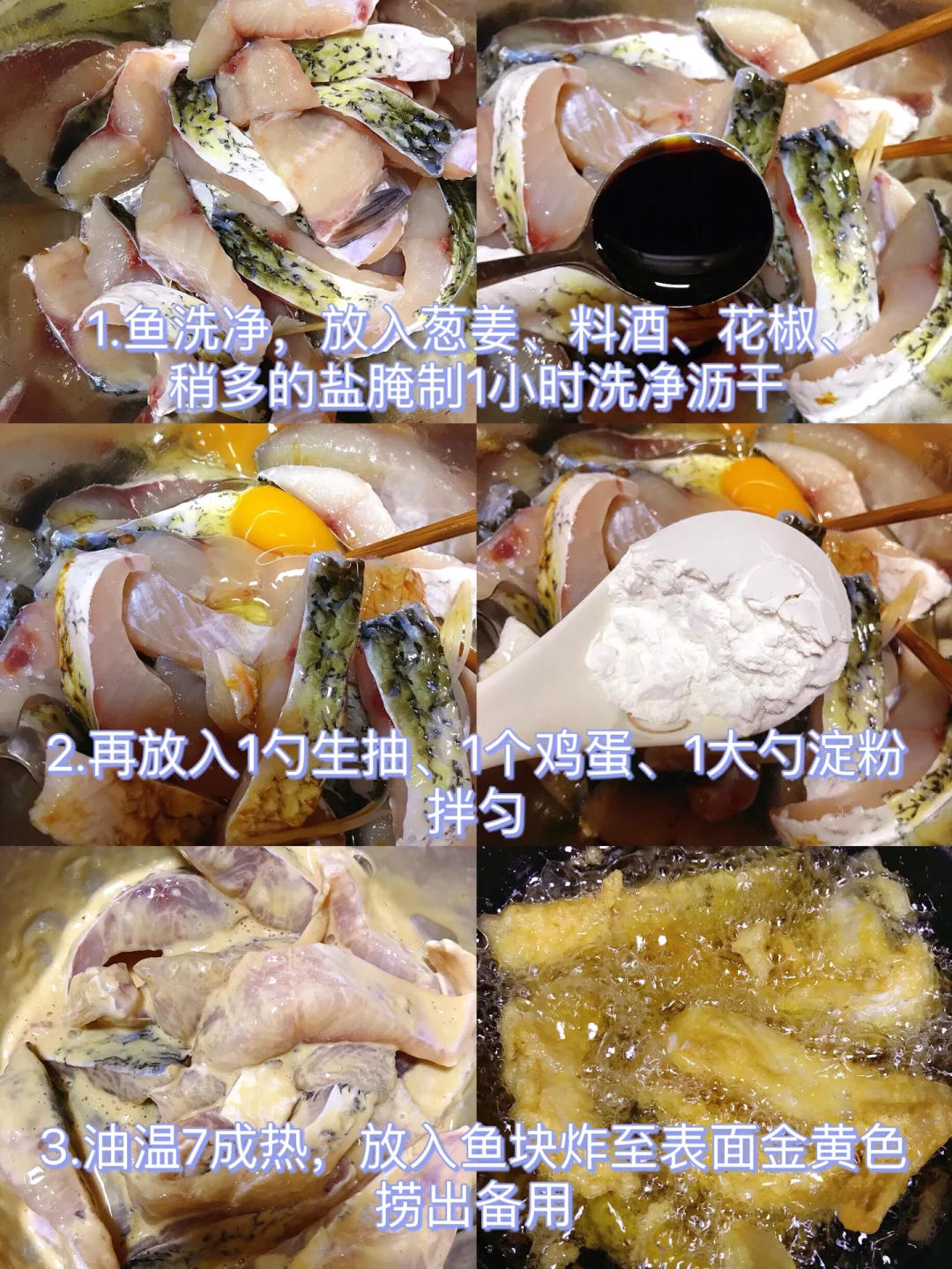 2⃣️油温7成热,放入鱼块炸至表面金黄色捞出备用(可多炸一会)