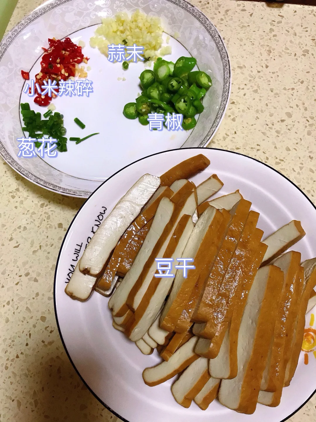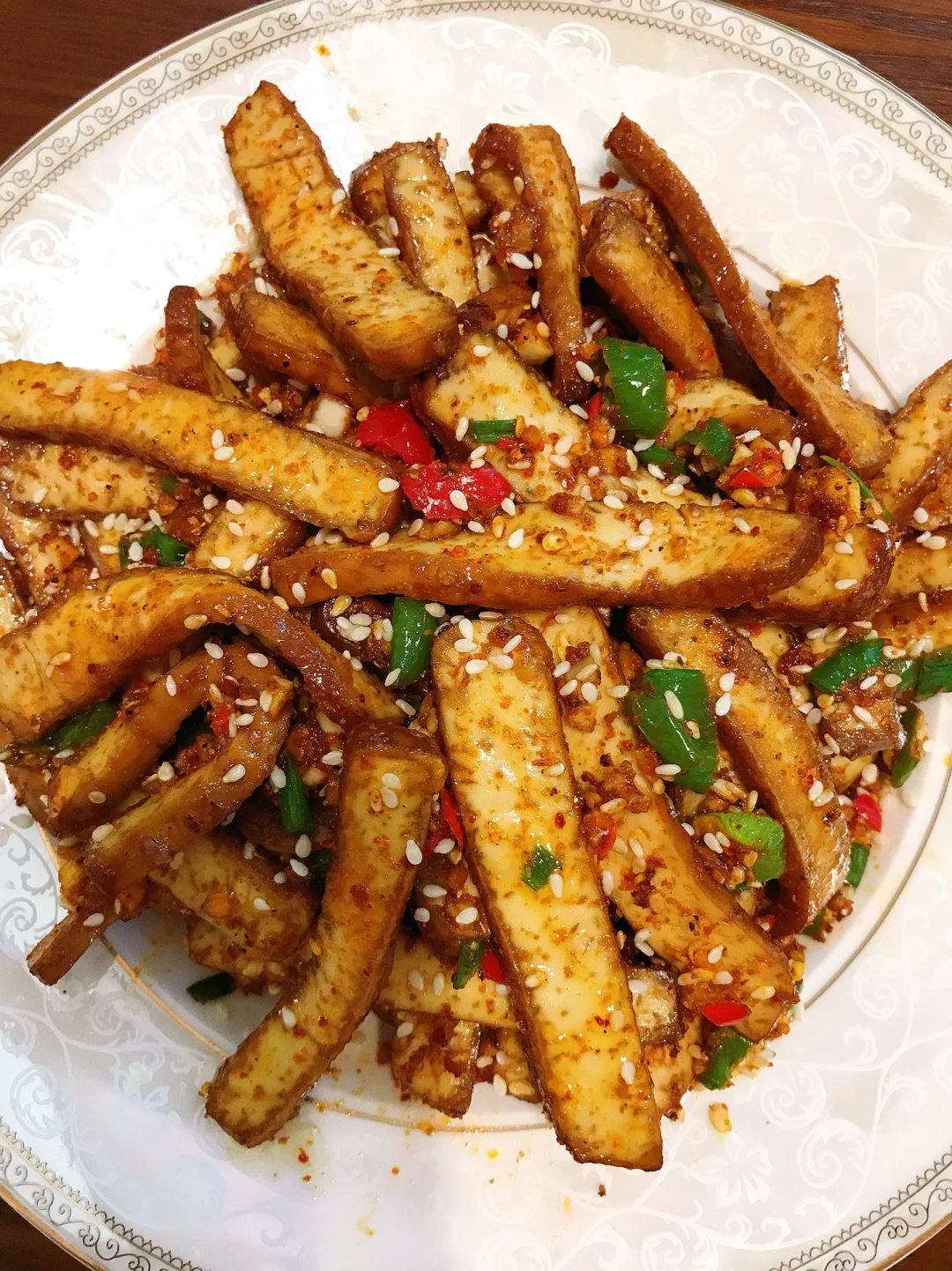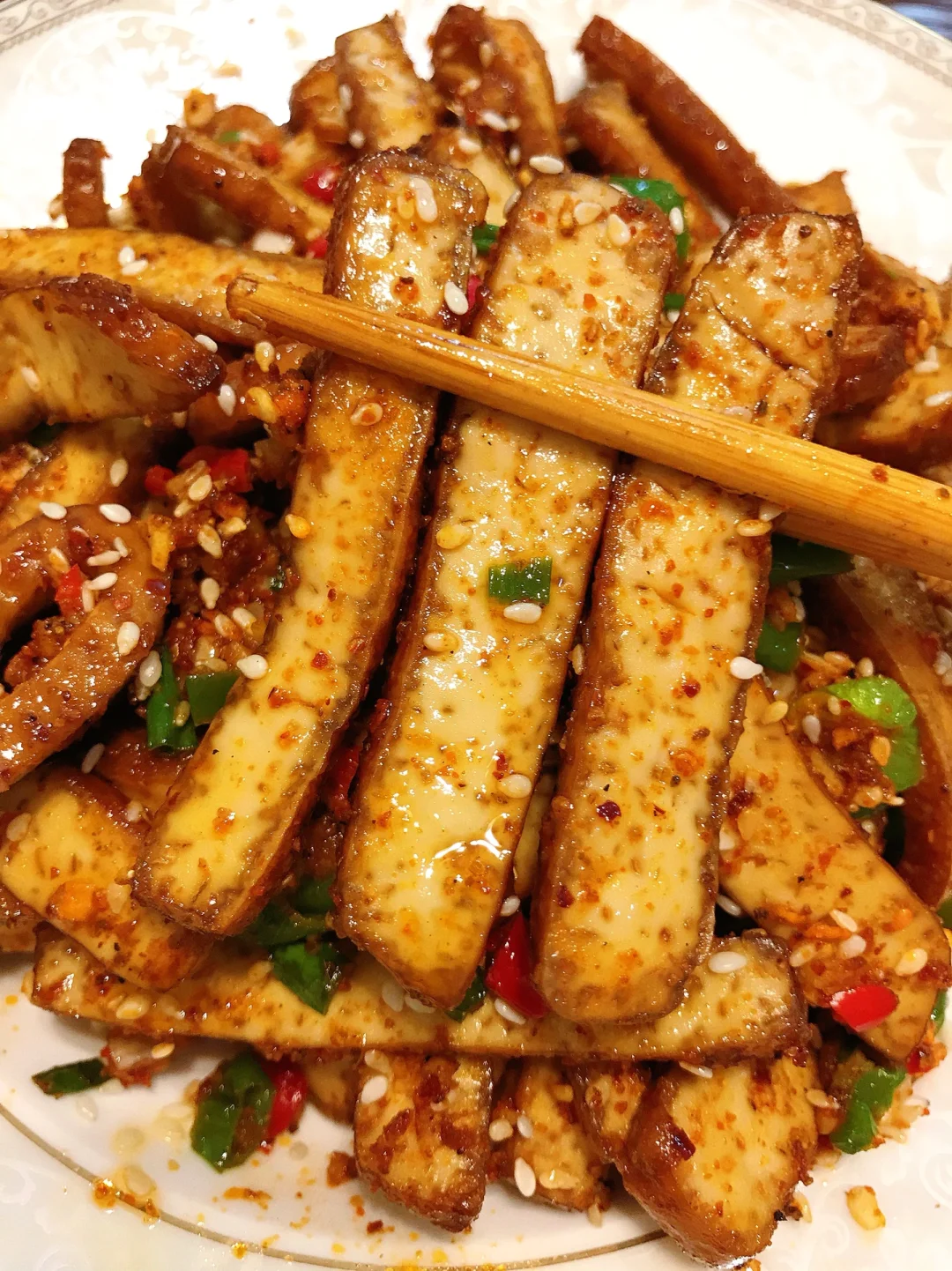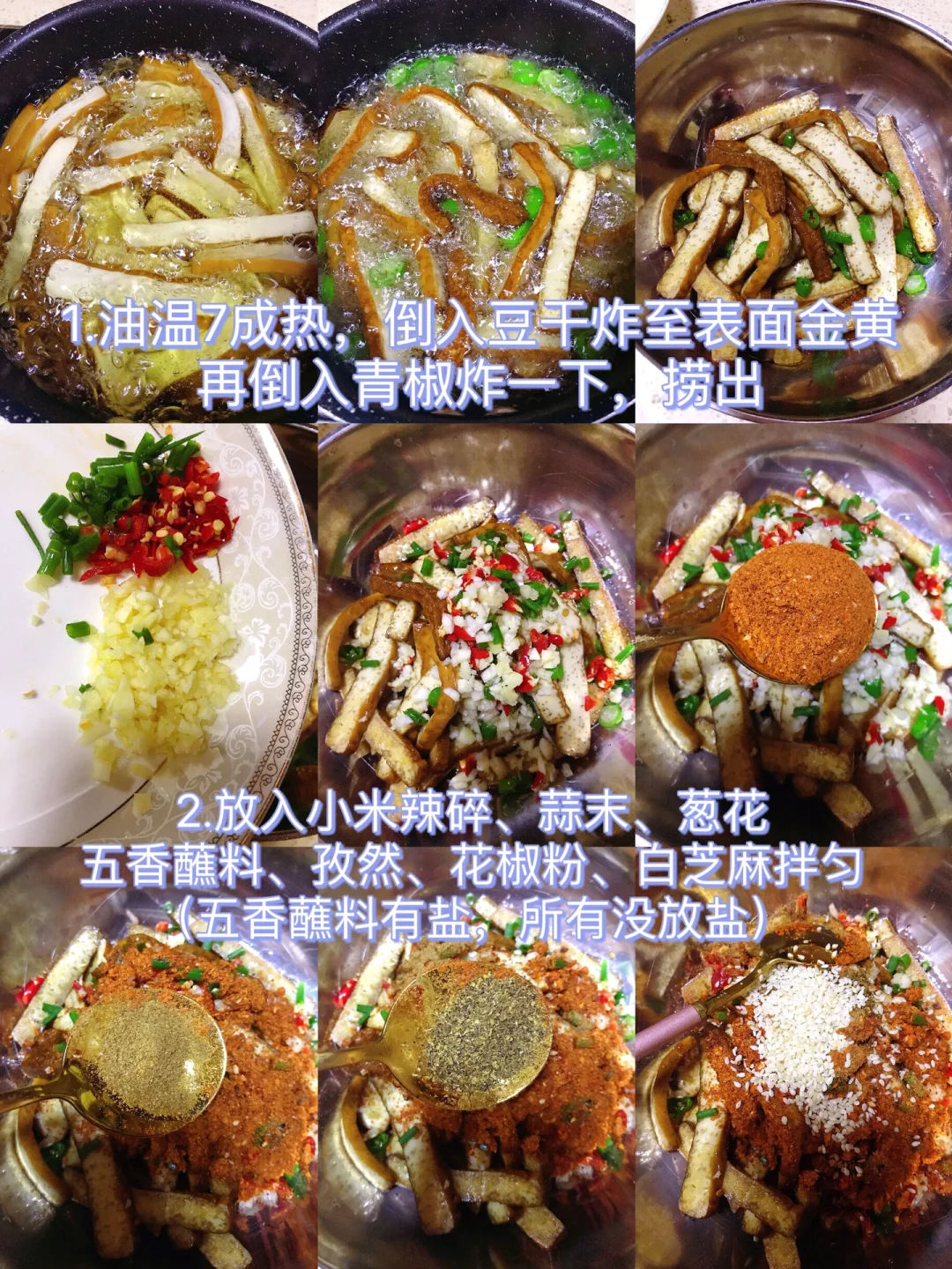 [赞R]今天分享一款孜然香干!麻辣鲜香,好吃到舔手指!喜欢的赶紧试试吧! [赞R]食材:豆干、青椒、蒜末、小米辣碎、葱花 [赞R]做法: 1.油温7成热,倒入豆干炸至表面金黄,再倒入青椒炸一下捞出 2.放入小米辣、蒜末、葱花、五香蘸料粉、孜然、花椒粉、白芝麻拌匀即可
