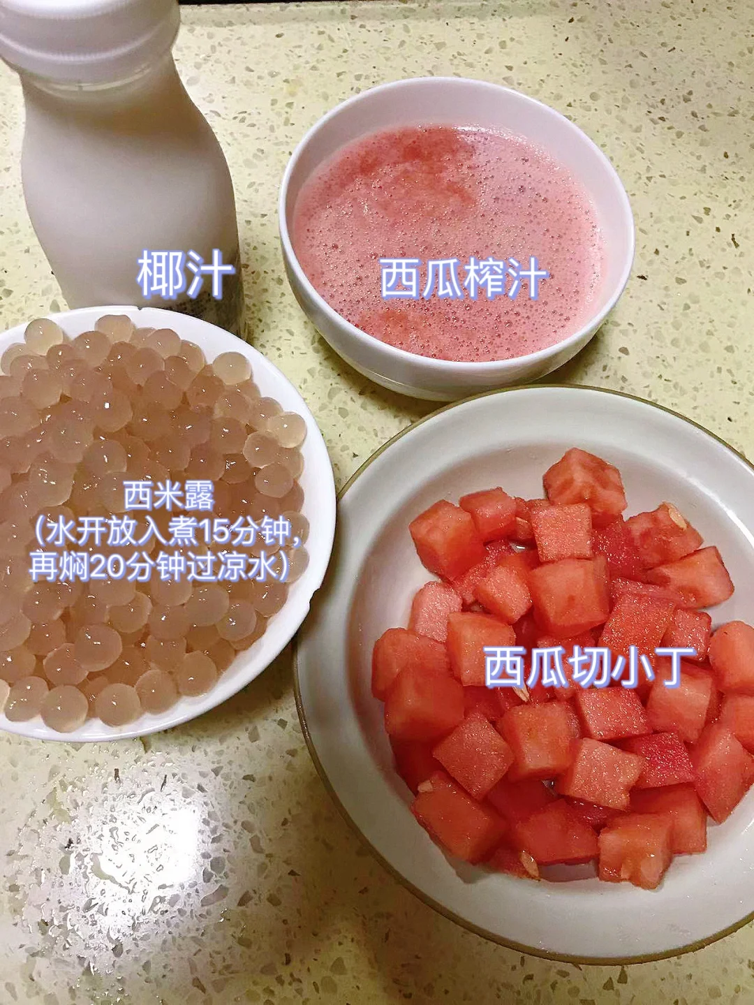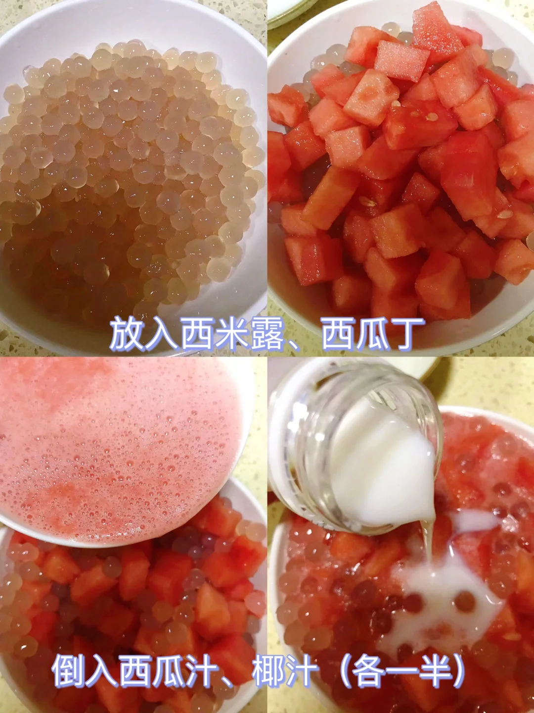 [赞R]今天分享一款西瓜西米露!清凉解暑,做法简单!喜欢的赶紧试试吧! [赞R]食材:西瓜、西米露、椰汁 [赞R]做法: 1.西瓜(一部分榨汁、一部分切小丁)备用;西米露水开放入煮15分钟再焖20分钟过凉水 2.碗中放入西米露、西瓜丁,倒入西瓜汁、椰汁拌匀即可