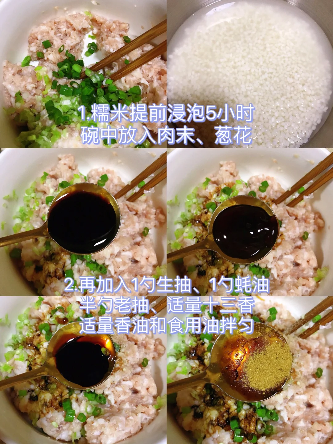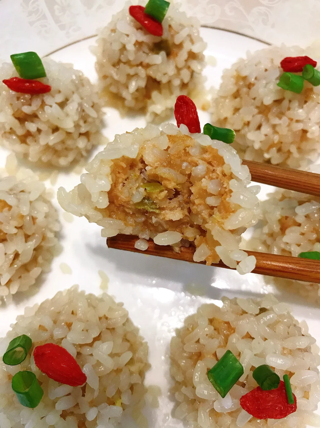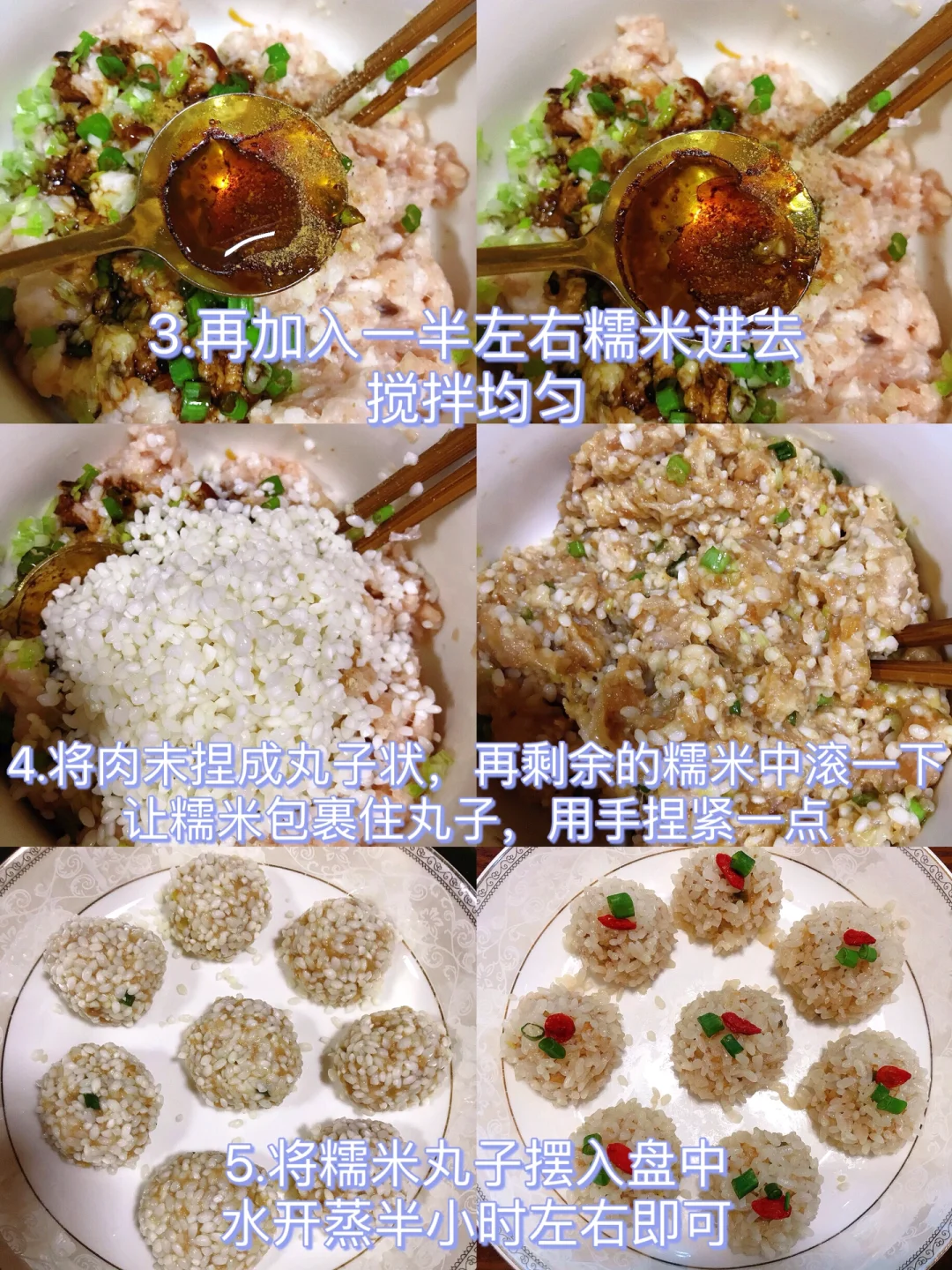 [赞R]今天分享一款糯米丸子!软软糯糯,鲜美可口,大人小孩都喜欢吃!喜欢的赶紧试试吧! [赞R]食材:肉末、糯米、葱花 [赞R]做法: 1⃣️糯米提前浸泡5小时 2⃣️碗中放入肉末、葱花,再加入1勺生抽、1勺蚝油、半勺老抽、适量十三香、适量香油和食用油拌匀 3⃣️再加入一半左右糯米进去搅拌均匀,将肉末捏成丸子状,再剩余的糯米中滚一滚,让糯米包裹住丸子,用手捏紧实一点 4⃣️将丸子摆入盘中放入蒸锅中,水开蒸半小时左右即可 (可以在肉末中加入胡萝卜碎/藕碎/香菇等)