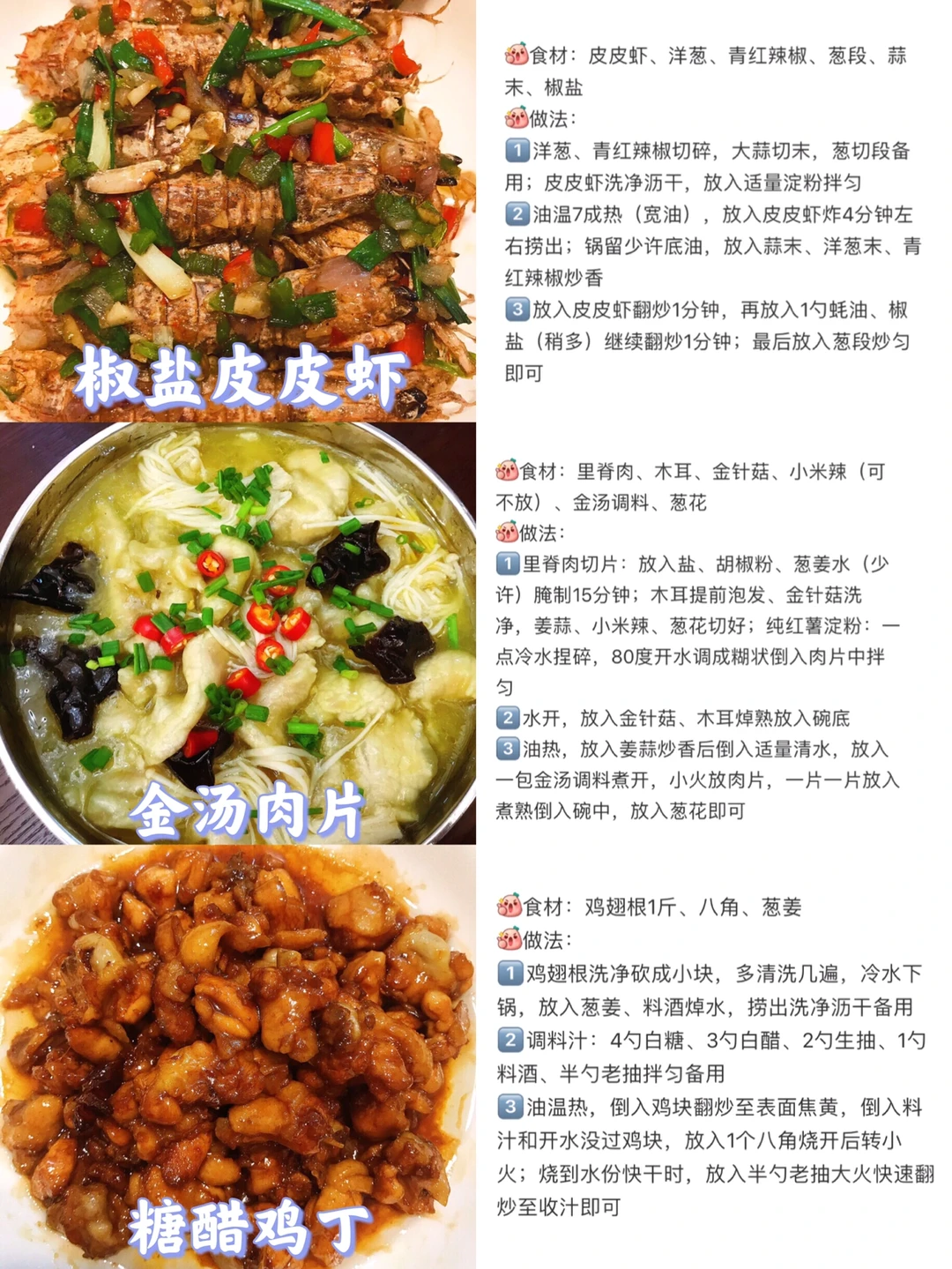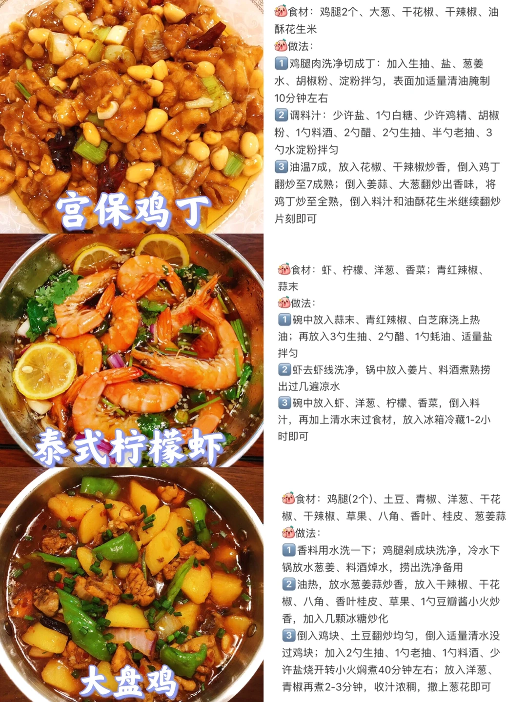 [赞R]今天给大家整理了六款超级好吃的家常菜合集!每天不知道吃什么的小伙伴可以参考一下这个食谱哦!每天不重样! [赞R]每一款都有详细的教程哦!翻看图片就能看见! 1⃣️宫保鸡丁 2⃣️泰式柠檬虾 3⃣️大盘鸡 4⃣️椒盐皮皮虾 5⃣️金汤肉片 6⃣️糖醋鸡丁