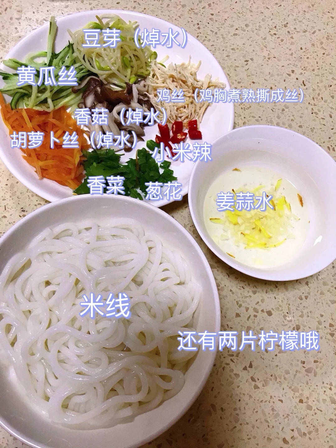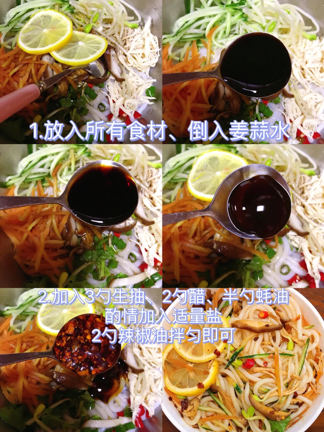 [赞R]今天分享一款凉拌酸辣米线!酸辣开胃,香辣爽口!喜欢的赶紧试试吧! [赞R]食材:米线、绿豆芽、黄瓜、胡萝卜、香菇、鸡胸、柠檬、小米辣、香菜、葱花、姜蒜 [赞R]做法: 1.配菜洗净切好焯熟备用;小米辣、香菜、葱花切好备用;米线煮熟备用 2.放入所有食材、倒入姜蒜水,加入3勺生抽、2勺醋、半勺蚝油、2勺辣椒油拌匀即可