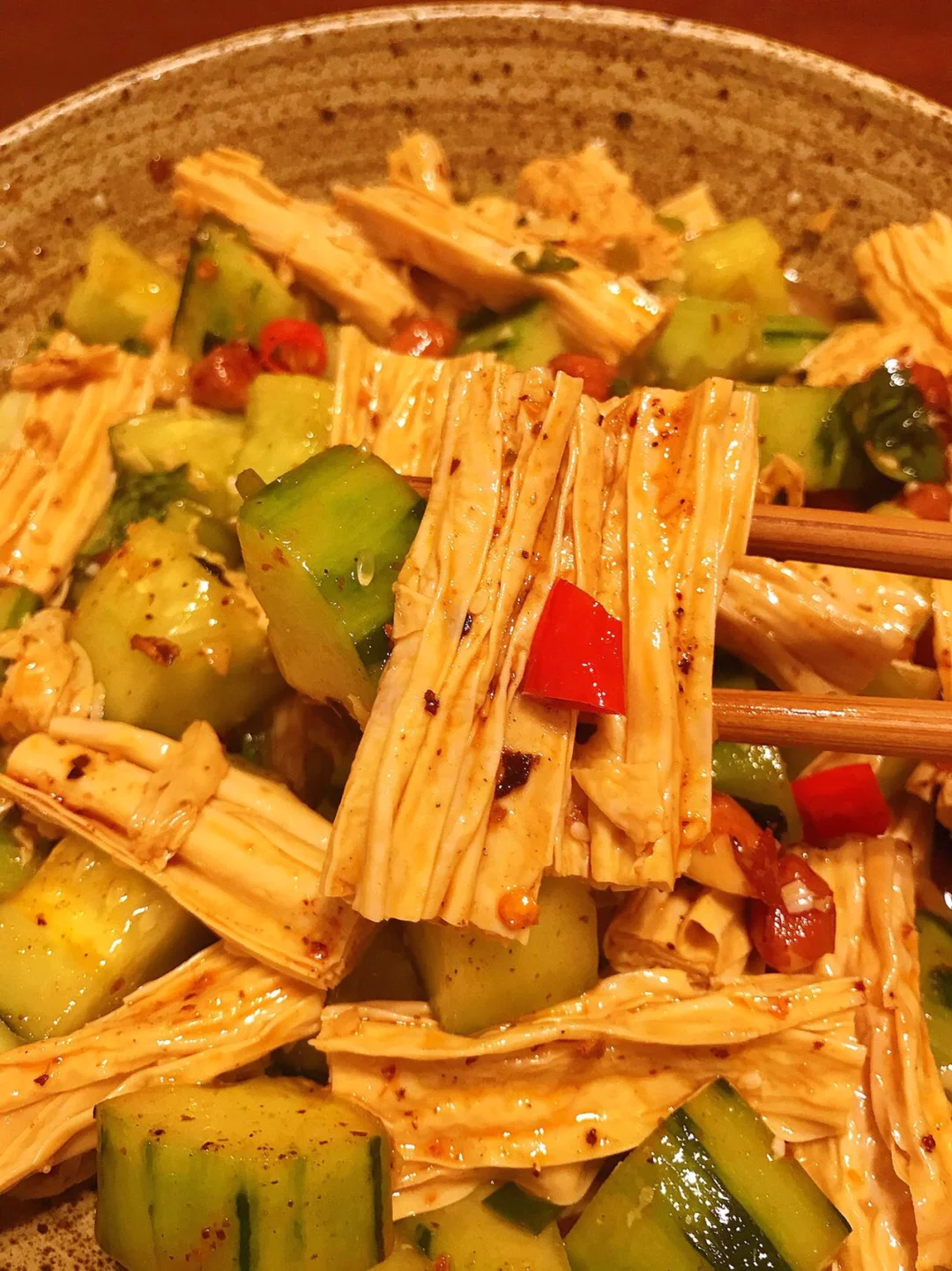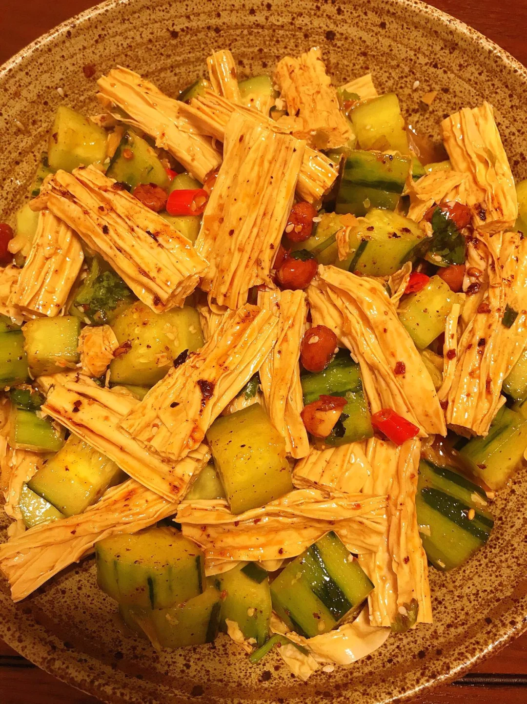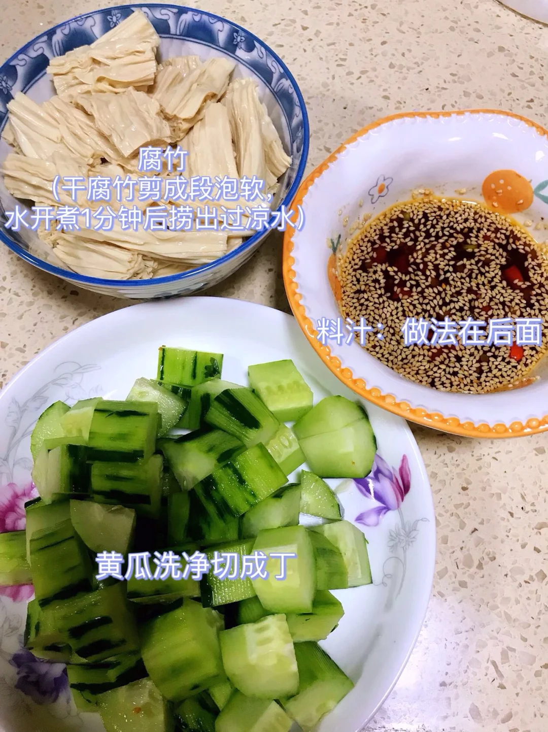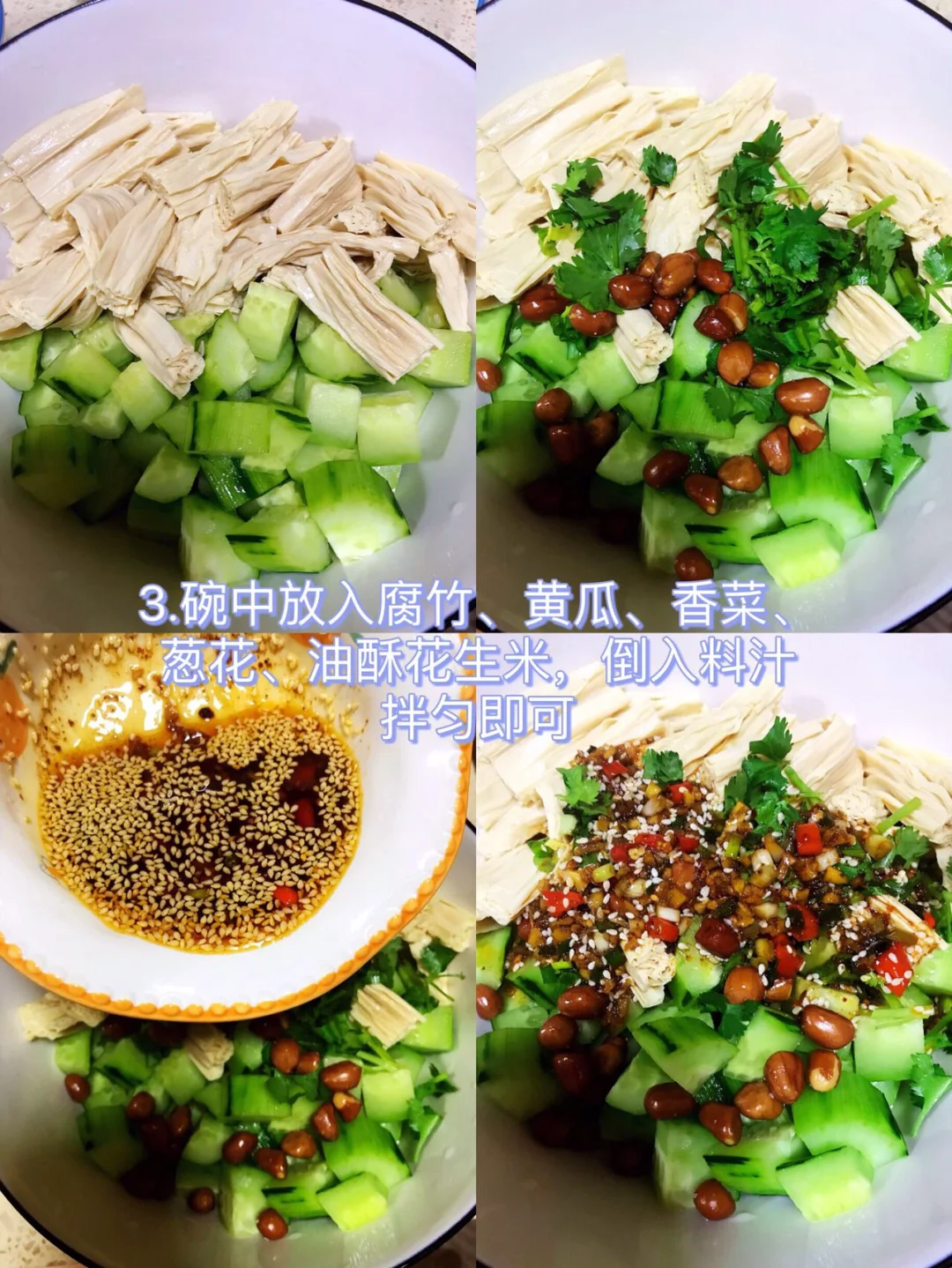 [赞R]今天分享一款凉拌腐竹黄瓜!开胃解腻巨好吃😋!喜欢的赶紧试试吧! [赞R]食材:腐竹、黄瓜、小米辣、香菜、葱花、油酥花生米(可不放) [赞R]做法: 1⃣️干腐竹剪成段泡软,水开煮1分钟后捞出过凉水;黄瓜切成丁 2⃣️调料汁:碗中放入蒜末、葱花、小米辣、白芝麻、辣椒面浇上热油;再放入2勺生抽、1勺醋、半勺香油、少许盐、鸡精、白糖搅拌均匀 3⃣️碗中放入腐竹、黄瓜、香菜、葱花、油酥花生米,倒入料汁拌匀即可