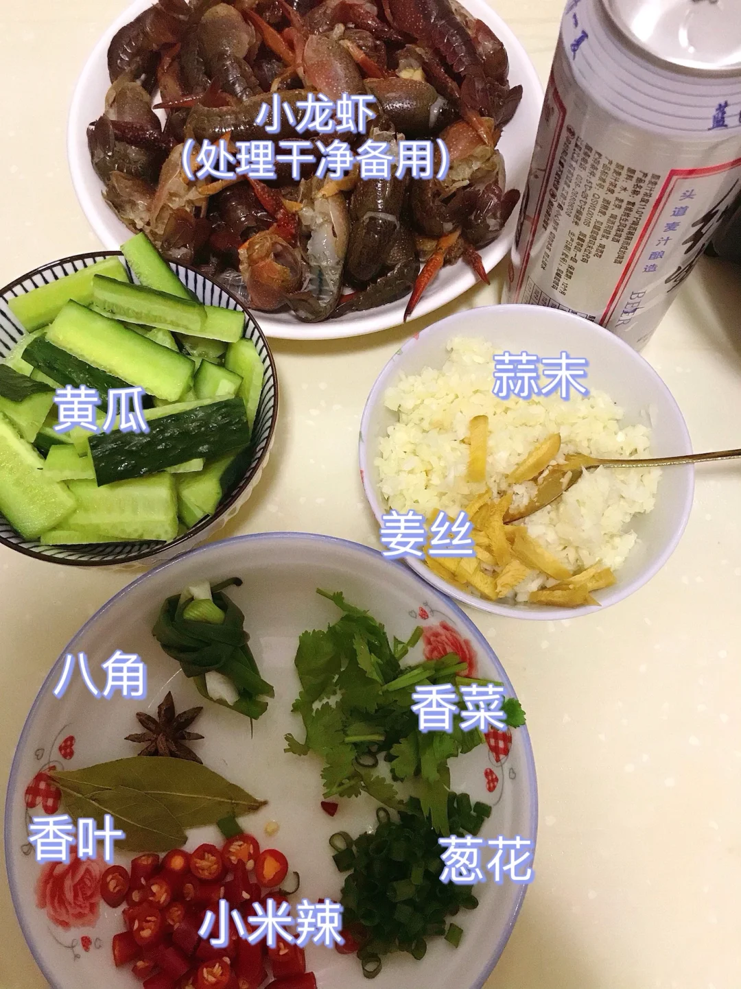 1⃣️小龙虾处理干净备用(不会的可以网上搜);黄瓜切小条、蒜切末、姜切丝、小米辣、葱花、香菜切好备用;八角、香叶、啤酒备用