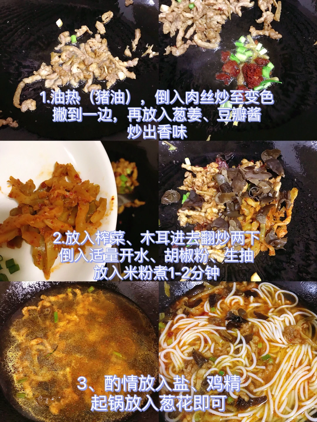 [赞R]今天分享一款榨菜肉丝粉!鲜美爽口,香辣开胃!喜欢的赶紧试试吧! [赞R]食材:米粉、瘦肉、榨菜、木耳、葱姜、葱花 [赞R]做法: 1⃣️米粉煮熟(用筷子能夹断,没有硬心);瘦肉洗净切成丝,放入葱姜、生抽、胡椒粉、水淀粉、清油拌匀腌制一下;榨菜、木耳、葱姜、葱花切好备用 2⃣️油热(猪油),倒入肉丝炒至变色,撇到一边,再放入葱姜、豆瓣酱炒出香味 3⃣️放入榨菜,木耳进去翻炒两下,倒入适量开水、胡椒粉、生抽,放入米粉煮1-2分钟 4⃣️酌情放入盐、鸡精,起锅放入葱花即可