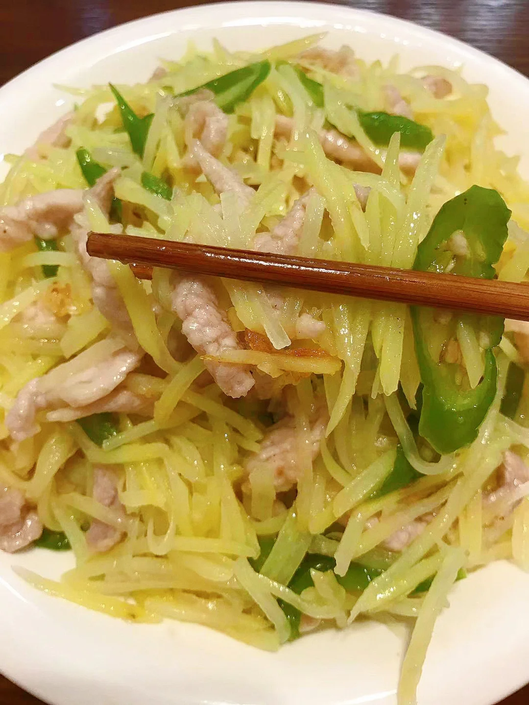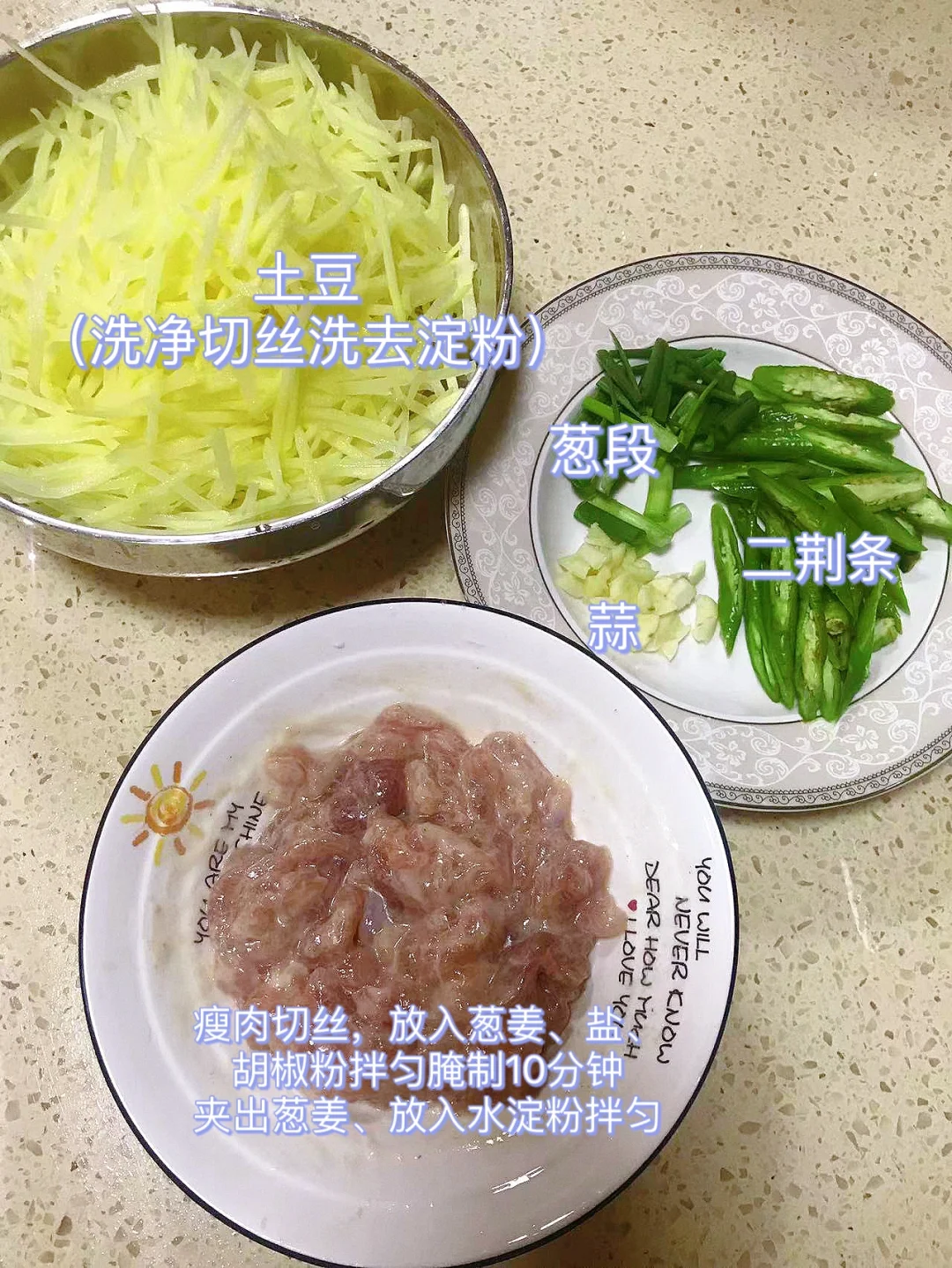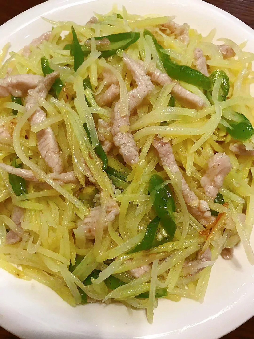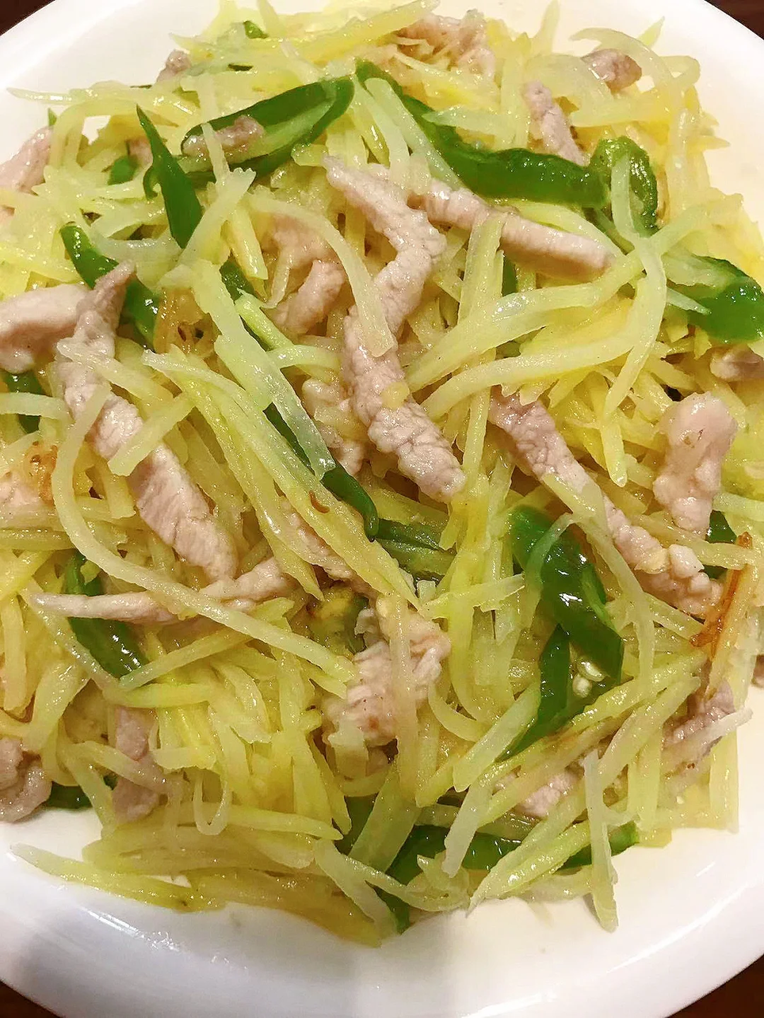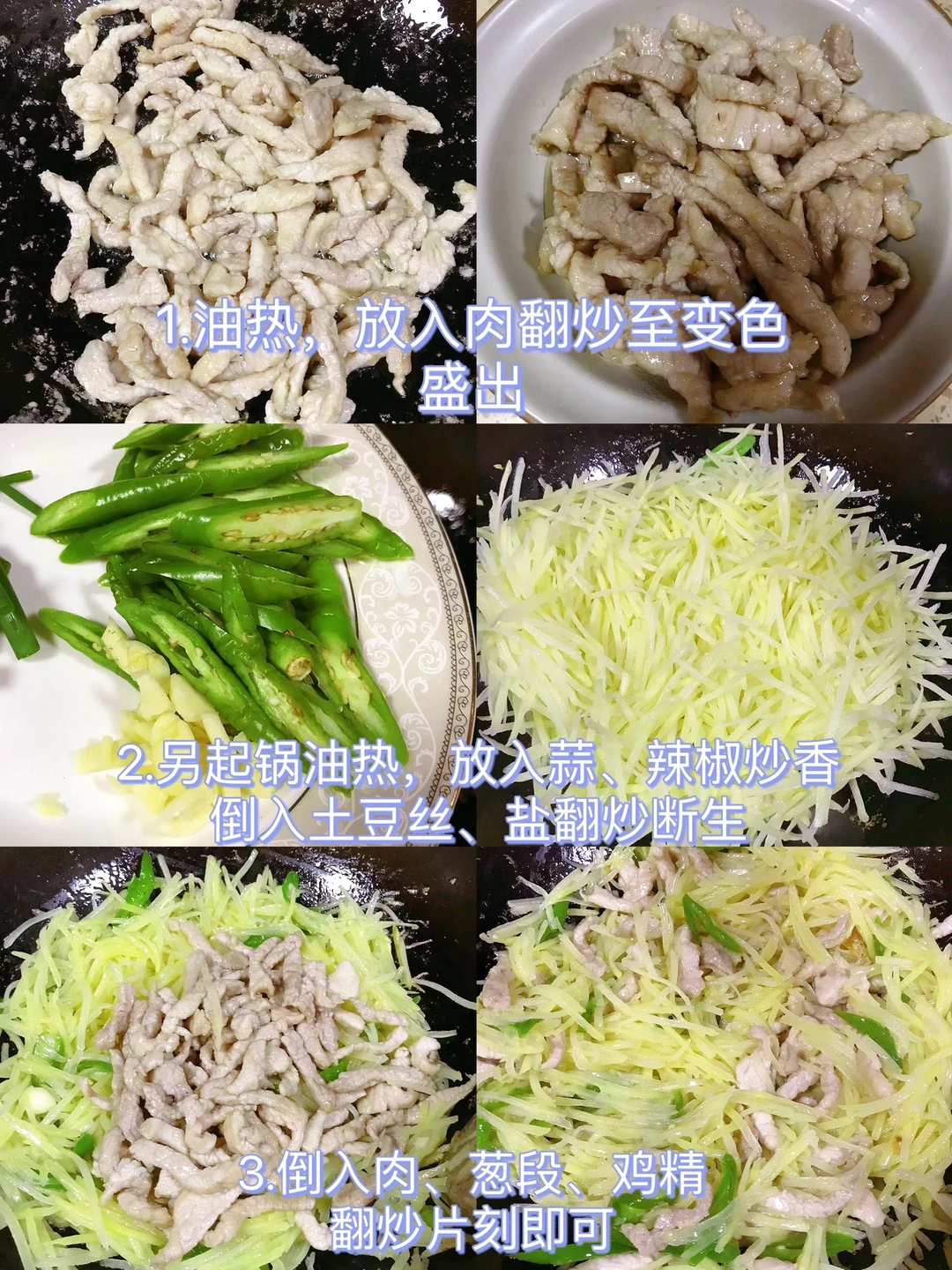 [赞R]今天分享一款入味好吃!简单下饭的土豆丝炒肉!喜欢的赶紧试试吧! [赞R]食材:土豆、瘦肉、二荆条、葱段、蒜 [赞R]做法: 1.土豆洗净切丝洗去淀粉沥干备用;瘦肉洗净切丝,放入葱姜、盐、胡椒粉拌匀腌制10分钟夹出葱姜,放入水淀粉拌匀;二荆条、葱、蒜切好备用 2.油热,放入肉翻炒至变色盛出 3.另起锅油热,放入蒜、辣椒炒香,倒入土豆丝、盐翻炒断生 4.倒入肉、葱段、鸡精翻炒片刻即可