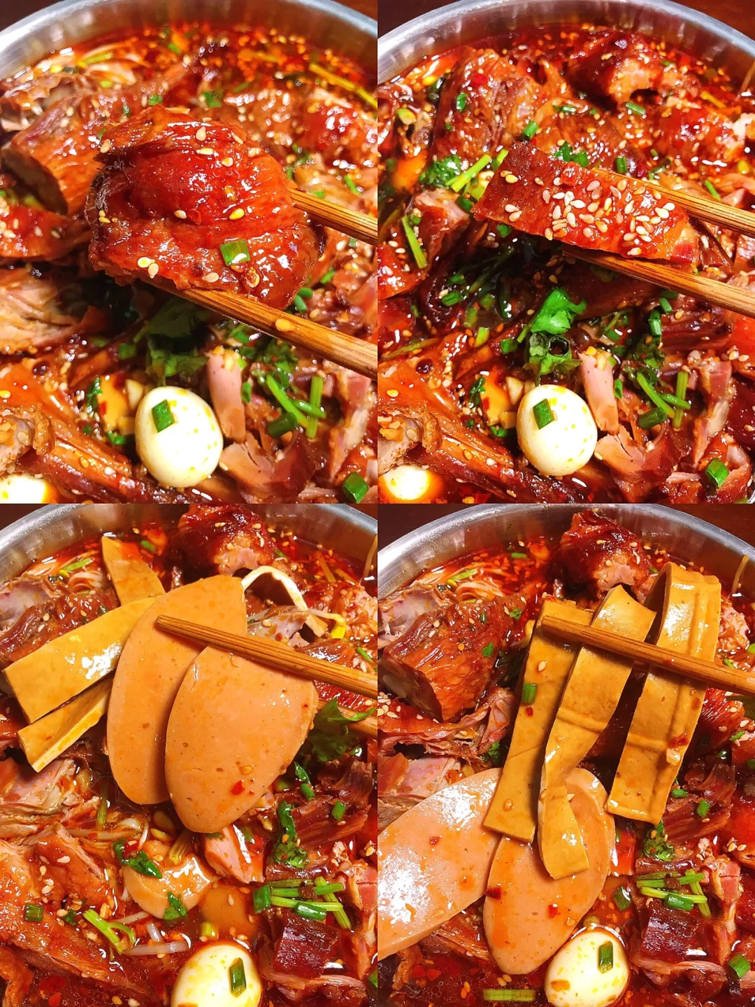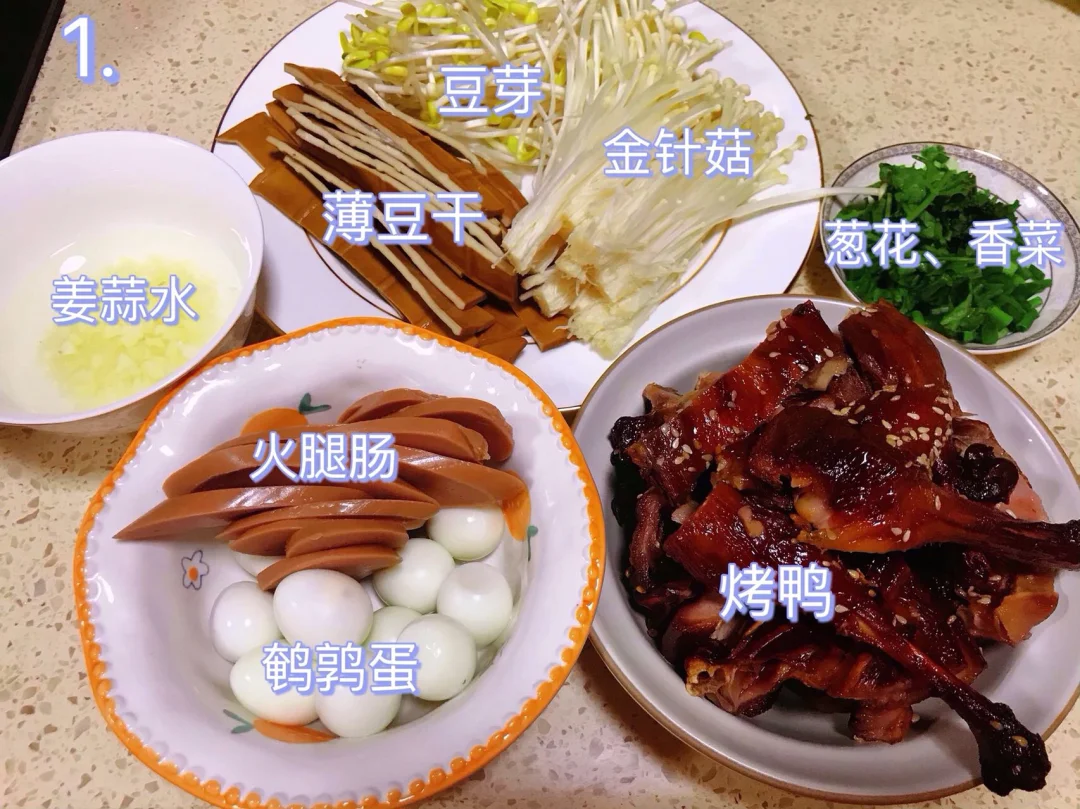 [赞R]今天分享一款冒烤鸭!好吃又下饭,烤鸭浸满汤汁,真的巨香!一口一口停不下来!大家赶紧试试吧! [赞R]食材:烤鸭、豆芽、金针菇、薄豆干、火腿肠、鹌鹑蛋、姜蒜水、葱花、香菜 [赞R]做法: 1⃣️将配菜洗净准备好 2⃣️调料汁:放入姜蒜水、葱花、香菜、1勺生抽、1勺蚝油、1勺花椒油、半勺花椒粉、2勺钵钵鸡调料拌匀备用 3⃣️水开放入火锅底料煮化,放入菜煮熟捞出垫碗底;将原汤盛出一些到碗中、放入烤鸭拌匀,再倒入到菜上即可