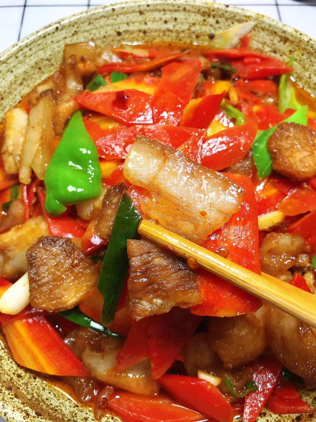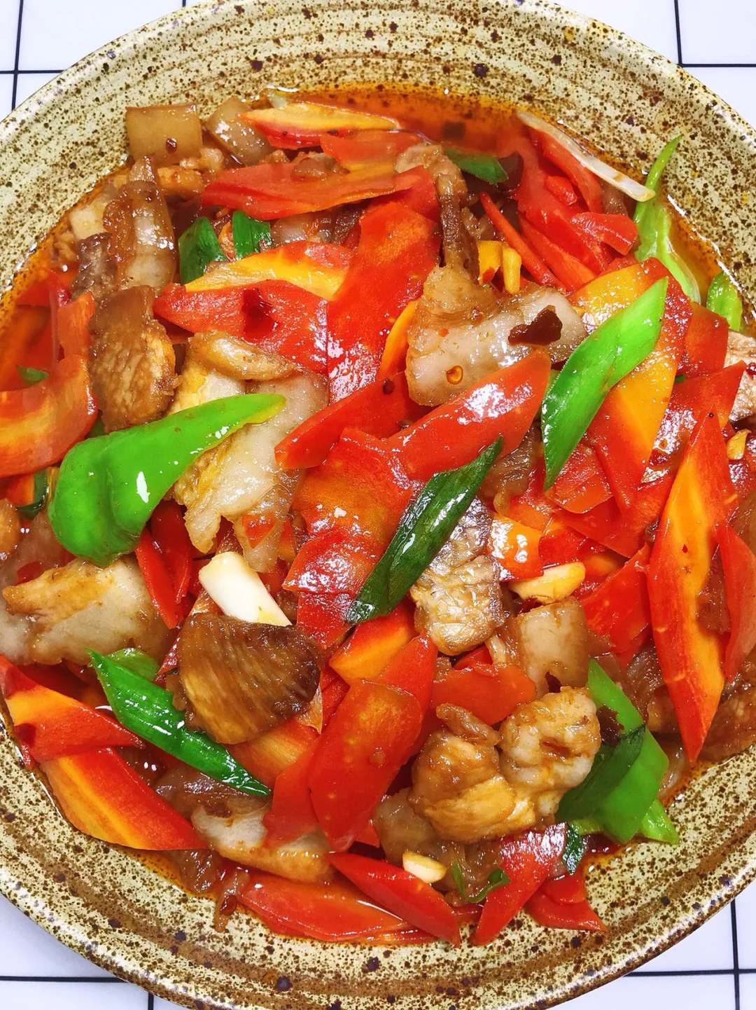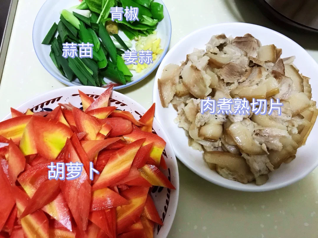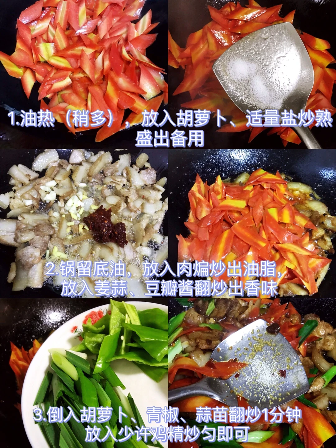 [赞R]今天分享一款胡萝卜回锅肉!超级好吃下饭,营养又健康!大家赶紧试试吧! [赞R]食材:五花肉、胡萝卜、蒜苗、青椒、姜蒜 [赞R]做法: 1⃣️肉煮熟切片;胡萝卜切片;蒜苗、青椒、姜蒜切好备用 2⃣️油热(宽油),放入胡萝卜片、适量盐炒熟盛出备用;锅留底油,放入肉煸炒出油脂,放入姜蒜、豆瓣酱翻炒出香味 3⃣️倒入胡萝卜、青椒、蒜苗翻炒1分钟,放入少许鸡精炒匀即可