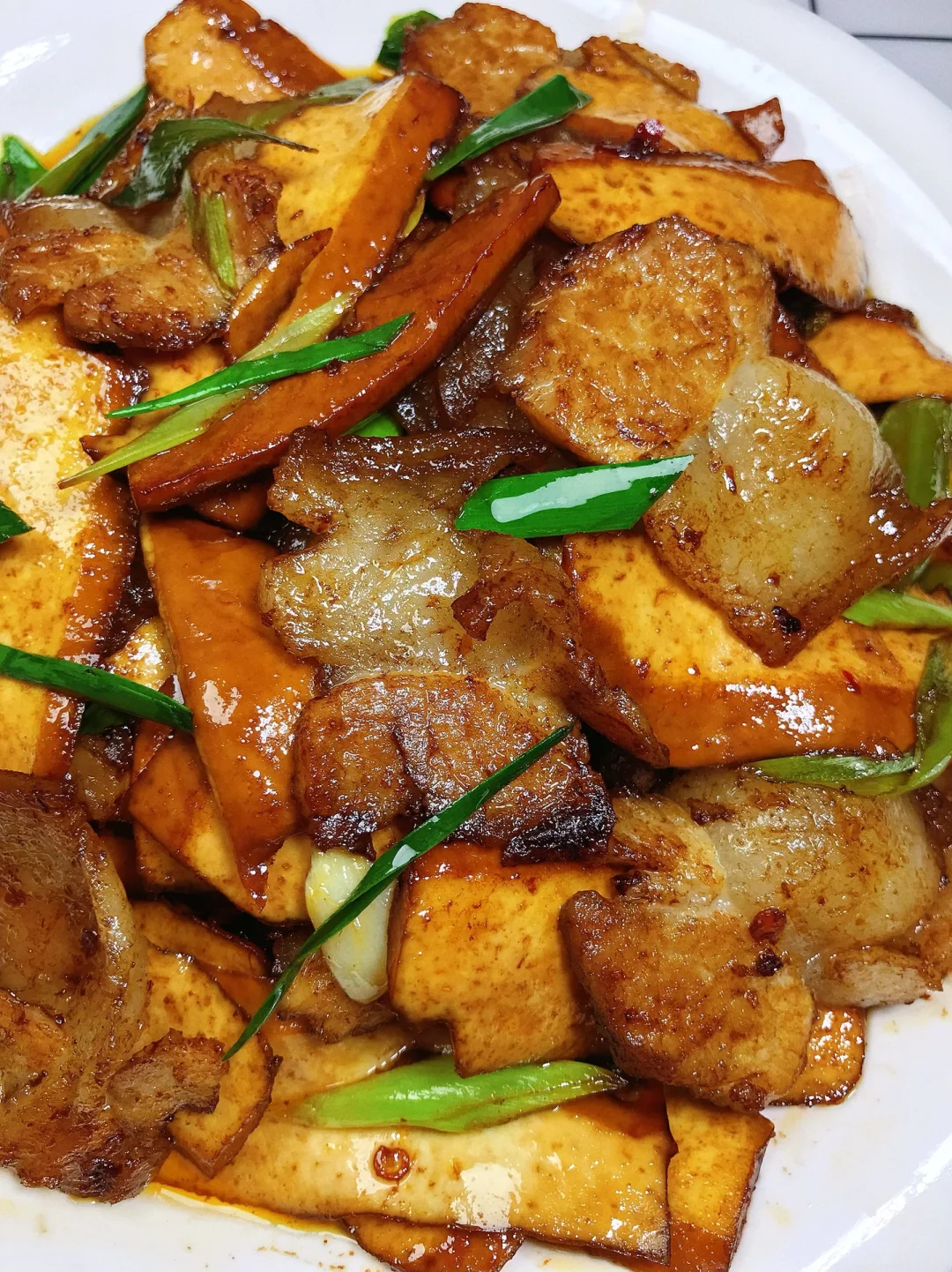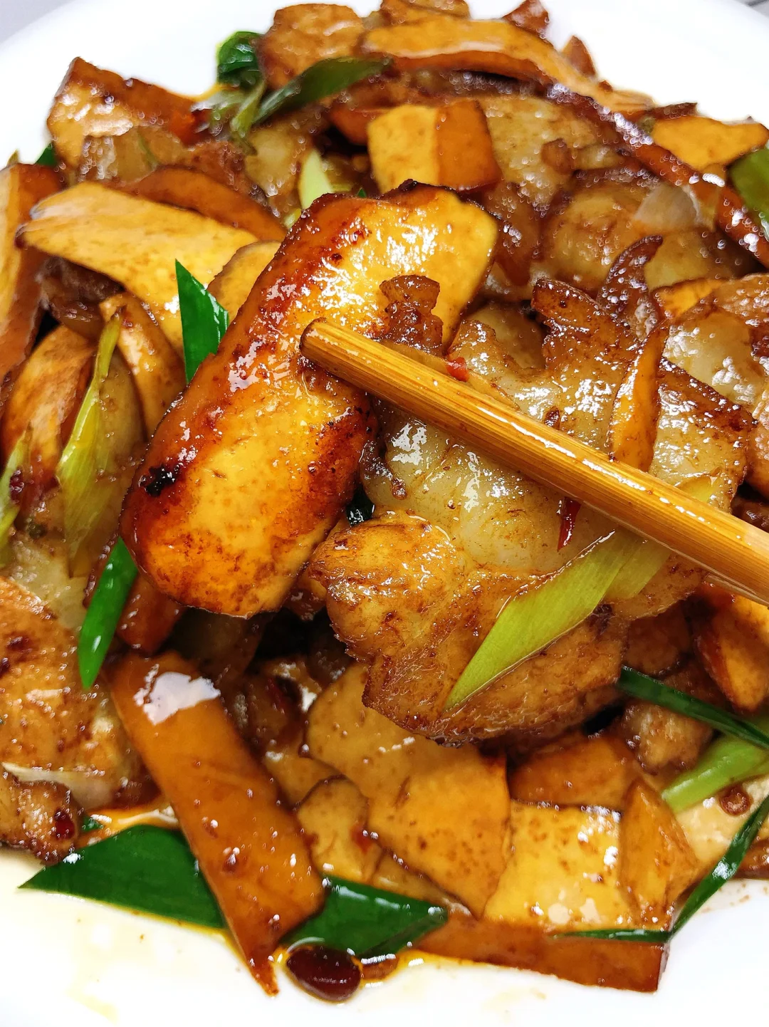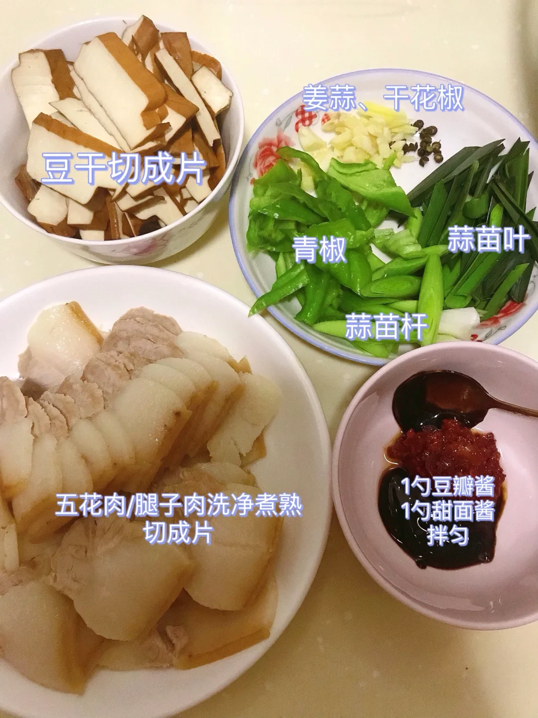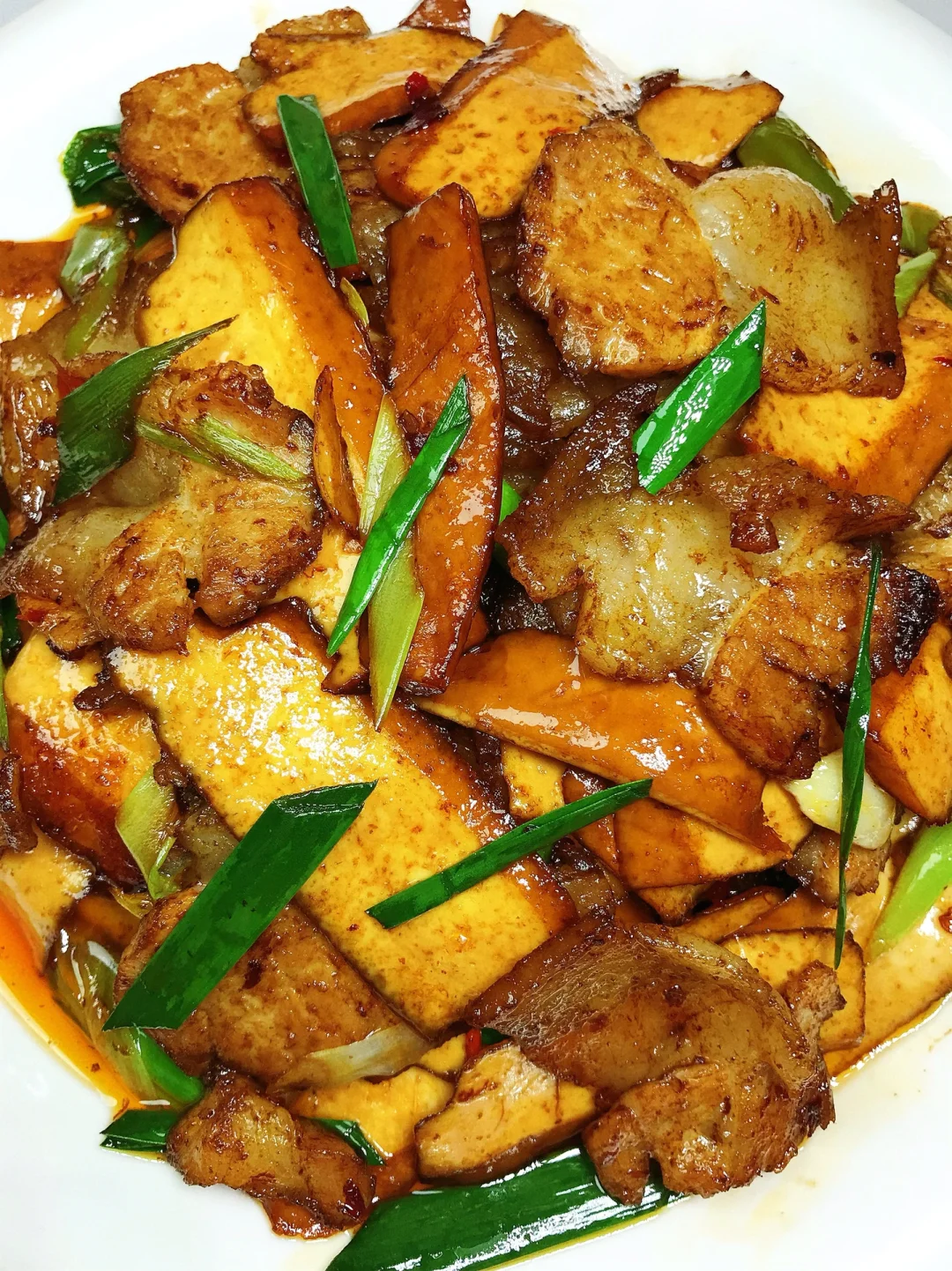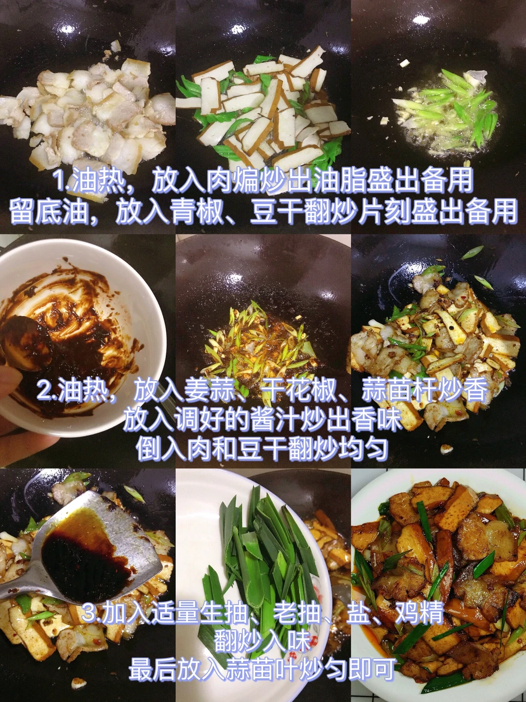 [赞R]今天分享一款香干回锅肉!肥而不腻,好吃下饭!喜欢的赶紧试试吧! [赞R]食材:五花肉/腿子肉、厚豆干、青椒、蒜苗、干花椒、 [赞R]做法: 1⃣️肉洗净煮熟切成片;豆干切成片;其它配料准备好 2⃣️油热,放入肉煸炒出油脂盛出备用,留底油放入青椒、豆干翻炒片刻盛出备用; 3⃣️锅留底油,放入姜蒜、干花椒、蒜苗杆炒香,放入调好的酱汁炒出香味,倒入肉和豆干,放入适量生抽、老抽、盐、鸡精翻炒入味,最后放入蒜苗炒匀即可