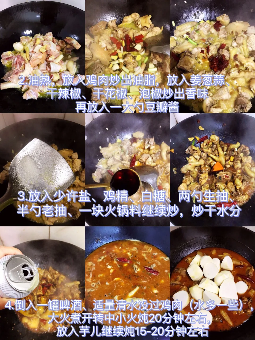 3⃣️倒入一罐啤酒、适量清水没过鸡肉(水稍多些),大火煮开转中小火炖20分钟左右,放入芋儿继续炖15-20分钟左右即可