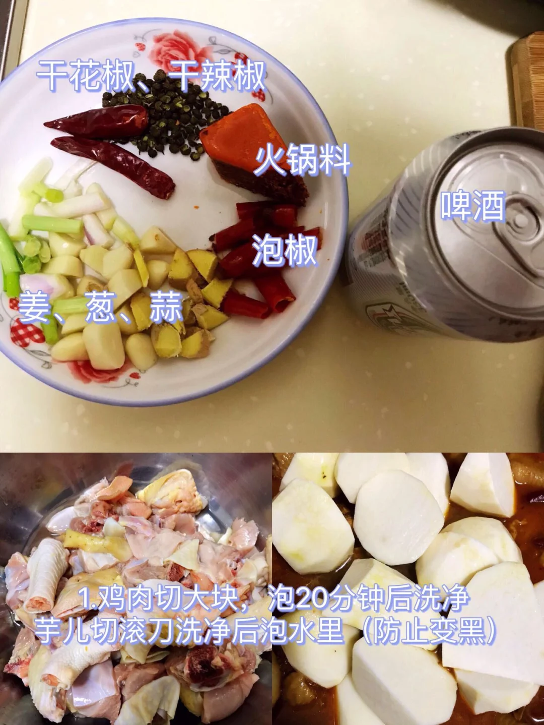 [赞R]食材:鸡肉、芋儿、干花椒、干辣椒、火锅料、泡椒、姜葱蒜、啤酒