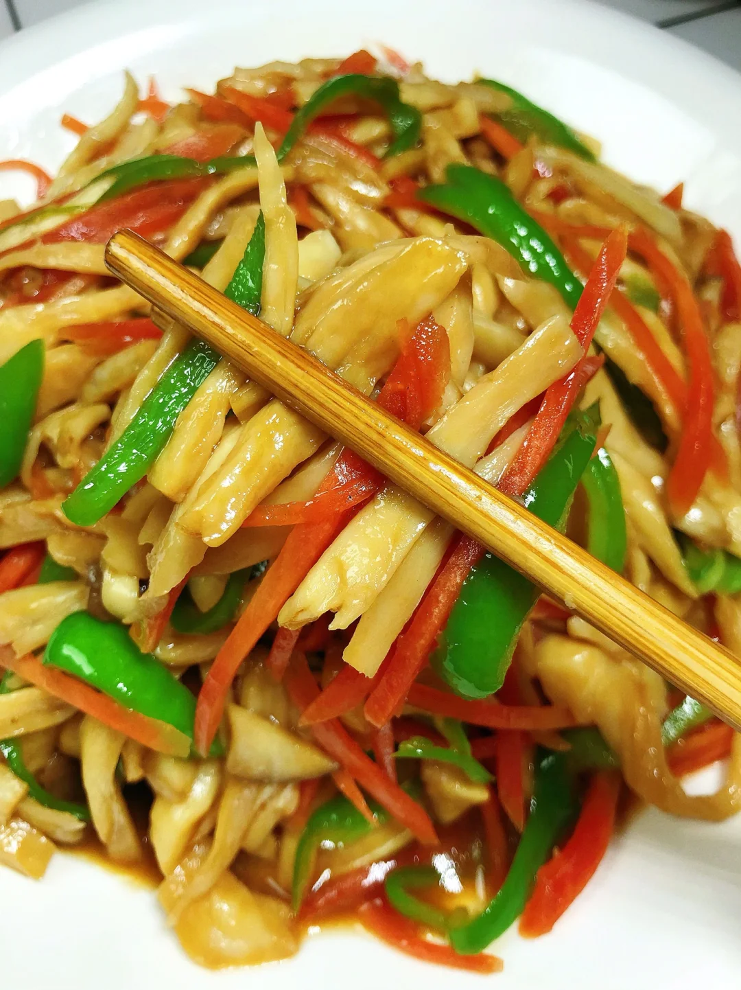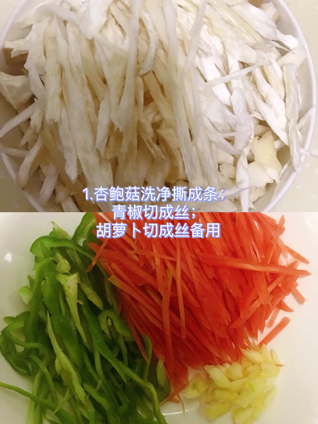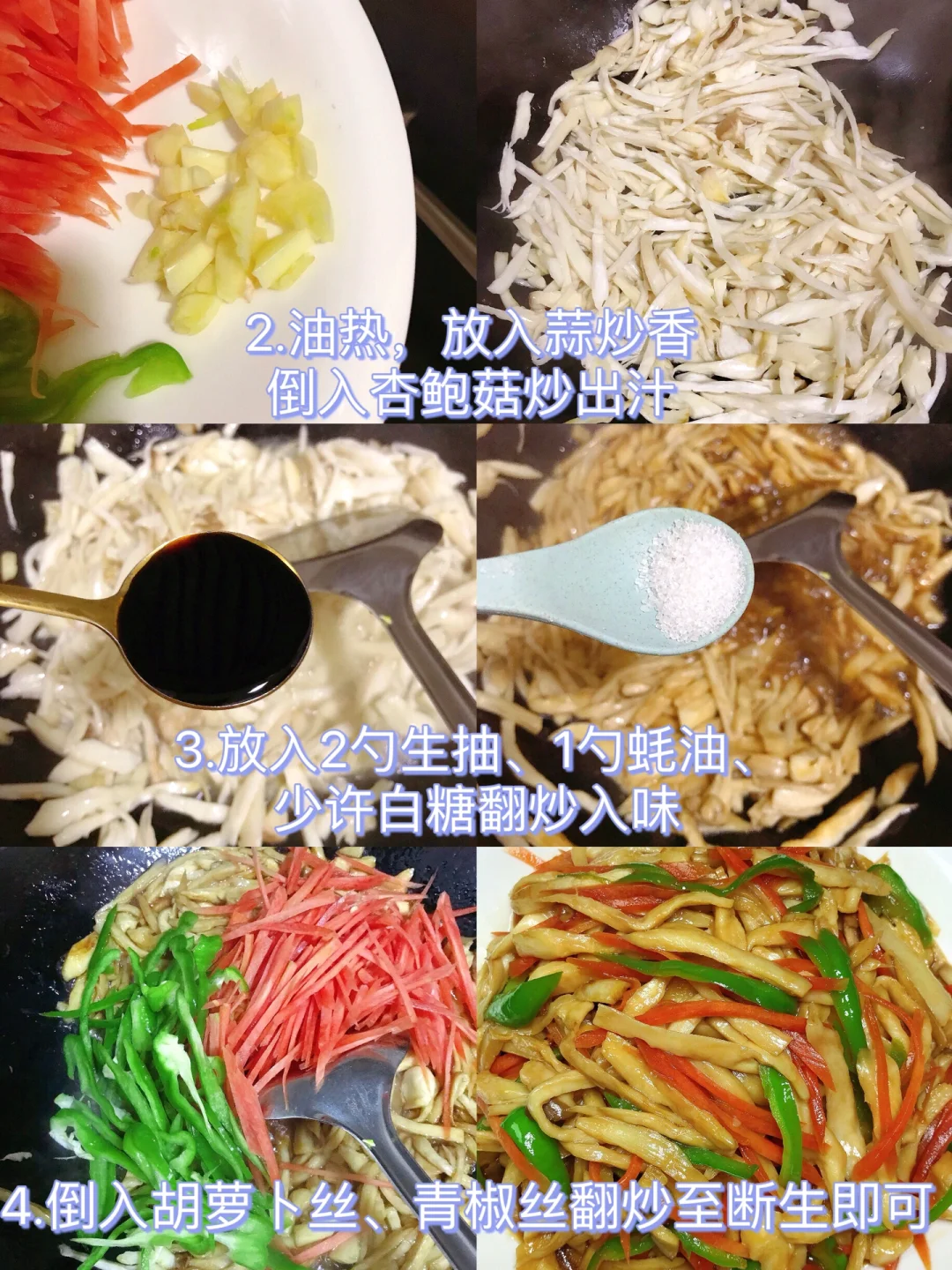 [赞R]今天分享一款手撕杏鲍菇!好吃不胖,做法简单!喜欢的赶紧试试吧! [赞R]食材:杏鲍菇、青椒、胡萝卜、蒜 [赞R]做法: 1⃣️杏鲍菇洗净撕成条;青椒切成丝;胡萝卜切成丝备用 2⃣️油热,放入蒜炒香,倒入杏鲍菇炒出汁 3⃣️放入2勺生抽、1勺蚝油、少许白糖炒入味,倒入胡萝卜丝、青椒丝翻炒至断生即可
