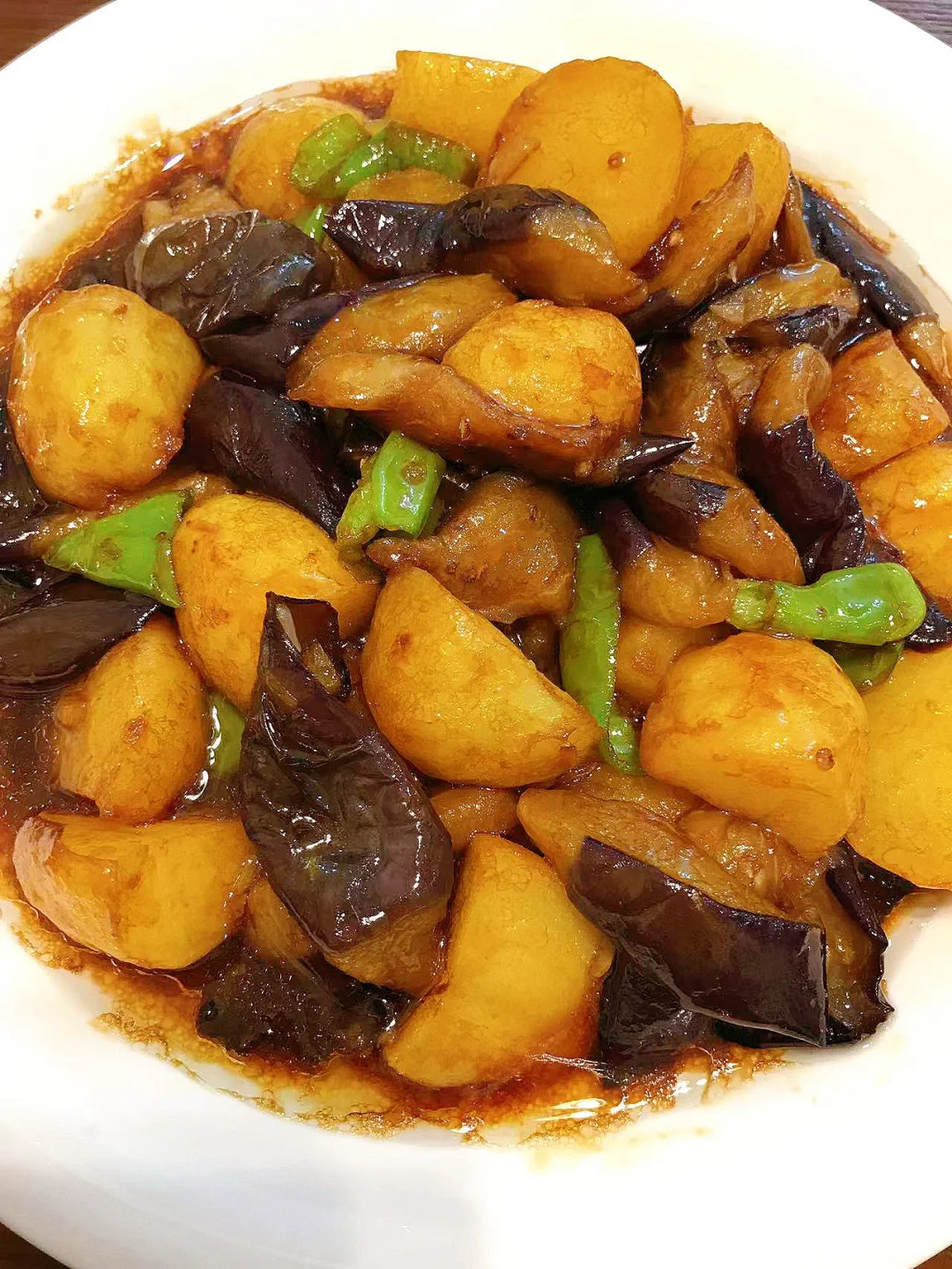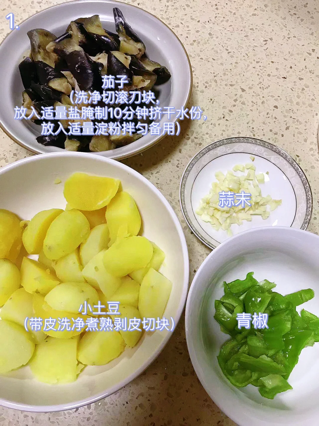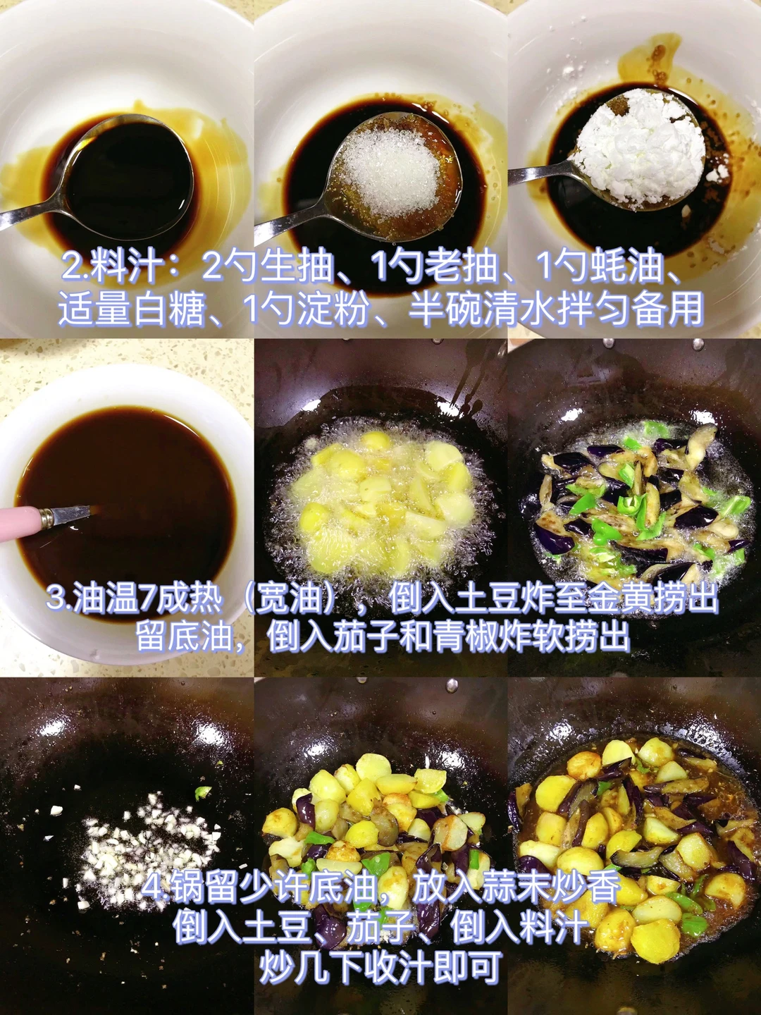 [赞R]今天分享一款地三鲜!酱汁浓郁,下饭好吃太过瘾了!喜欢的赶紧试试吧! [赞R]食材:茄子、小土豆、青椒、蒜末 [赞R]做法: 1.茄子洗净切滚刀块,放入适量盐腌制10分钟挤干水份,放入适量淀粉拌匀备用;小土豆带皮洗净煮熟剥皮切块;青椒、蒜末切好备用 2.料汁:2勺生抽、1勺老抽、1勺蚝油、适量白糖、1勺淀粉;半碗清水拌匀备用 3.油温7成热(宽油),倒入土豆炸至金黄捞出,留底油,倒入茄子和青椒炸软捞出 4.锅留少许底油,放入蒜末炒香,倒入土豆、茄子、倒入料汁炒几下收汁即可