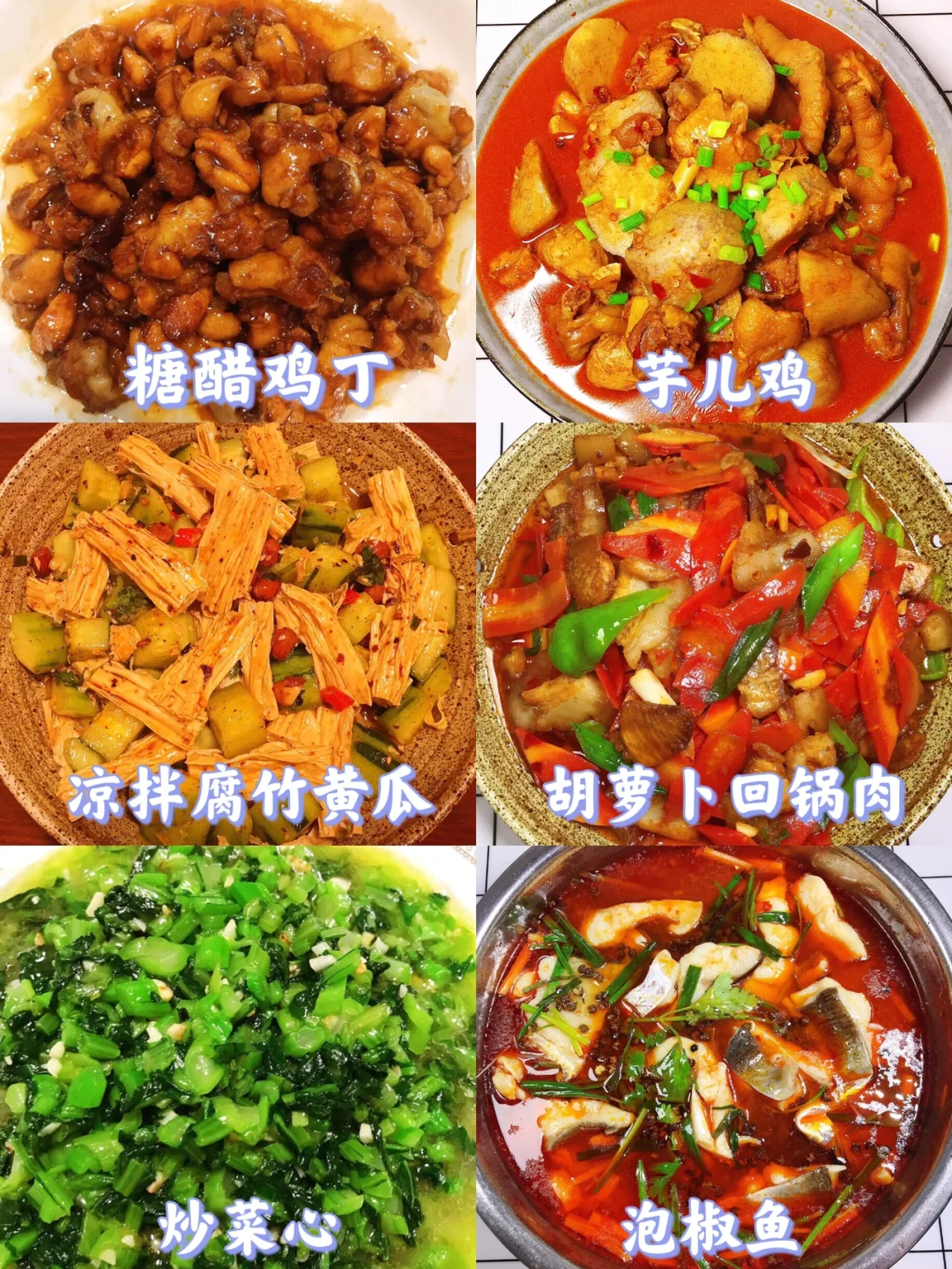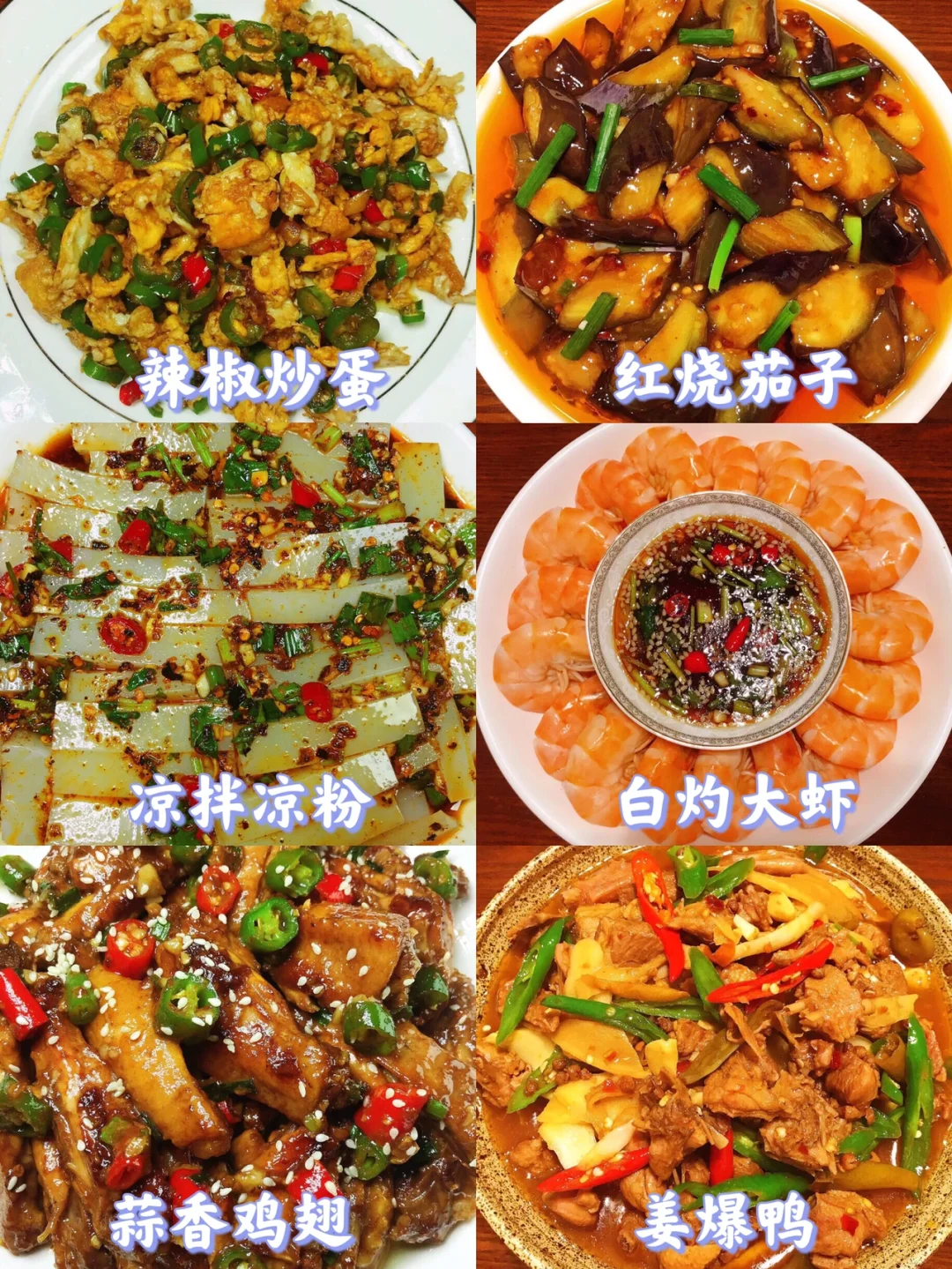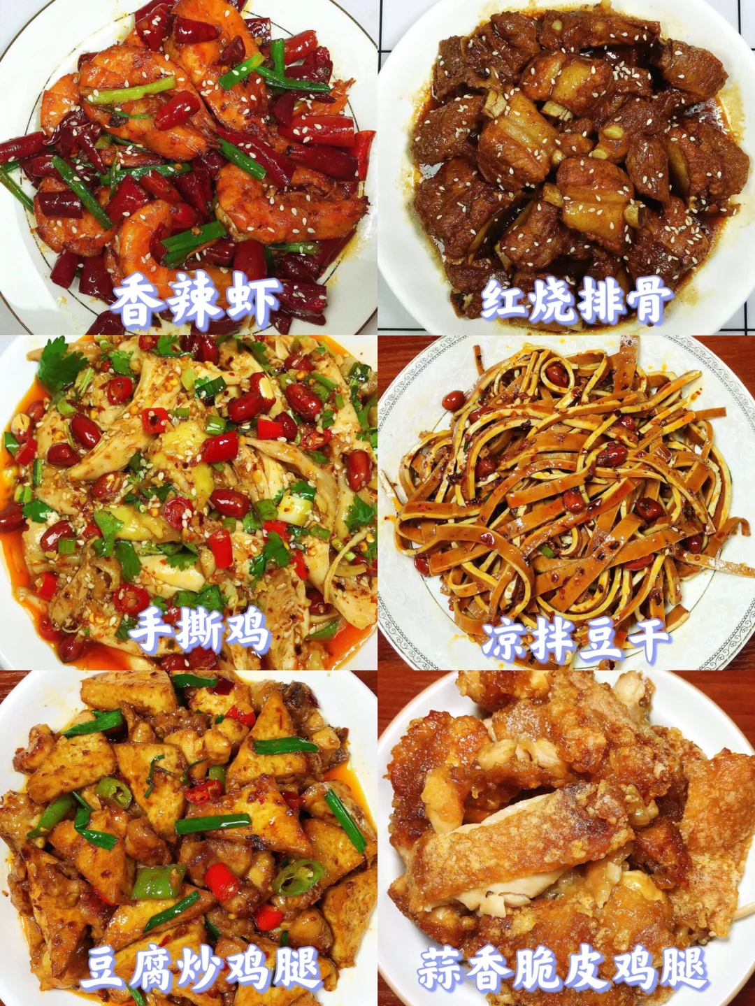 [赞R]大家好呀!给大家整理了超级好吃的家常菜合集,下饭又营养!做法大家可以进主页翻看之前的笔记,每款菜都有详细的教程哦! 图2⃣️ 虾辣虾 红烧排骨 手撕鸡 凉拌豆干 豆腐炒鸡腿 蒜香脆皮鸡腿 图3⃣️ 辣椒炒蛋 红烧茄子 凉拌凉粉 白灼大虾 蒜香鸡翅 姜爆鸭 图4⃣️ 口水鸡 爆炒牛肉丸 宫保鸡丁 泰式柠檬虾 椒盐皮皮虾 金汤肉片 图5⃣️ 糖醋鸡丁 芋儿鸡 凉拌腐竹黄瓜 胡萝卜回锅肉 炒菜心 泡椒鱼