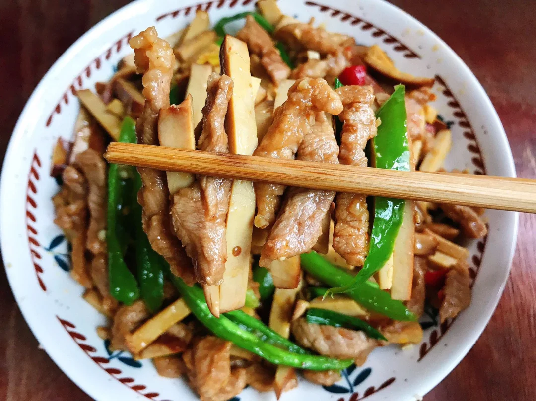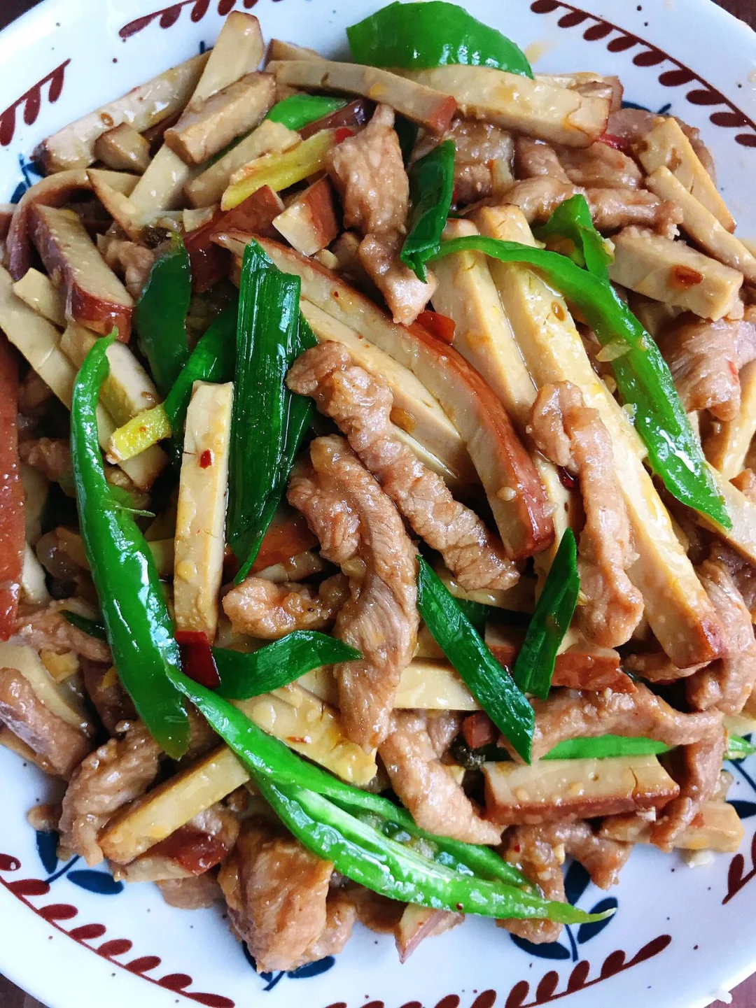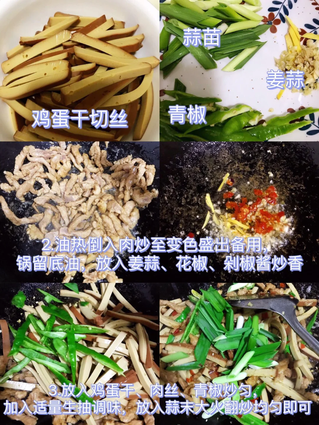 [赞R]今天分享一款鸡蛋干炒肉!好吃易做,鲜香嫩滑!喜欢的赶紧试试吧! [赞R]食材:瘦肉、鸡蛋干、青椒、蒜苗、姜蒜、干花椒、剁椒酱 [赞R]做法: 1⃣️腌瘦肉:1勺生抽、1勺料酒、半勺老抽、淀粉、少许白胡椒粉拌匀表面淋上清油腌制10分钟;鸡蛋干切丝;蒜苗、青椒、姜蒜切好备用 2⃣️油热,倒入肉炒至变色盛出备用;锅留底油,放入姜蒜、花椒、剁椒酱炒香 3⃣️放入鸡蛋干、肉丝、青椒炒匀,加入适量生抽调味,放入蒜苗大火翻炒均匀即可